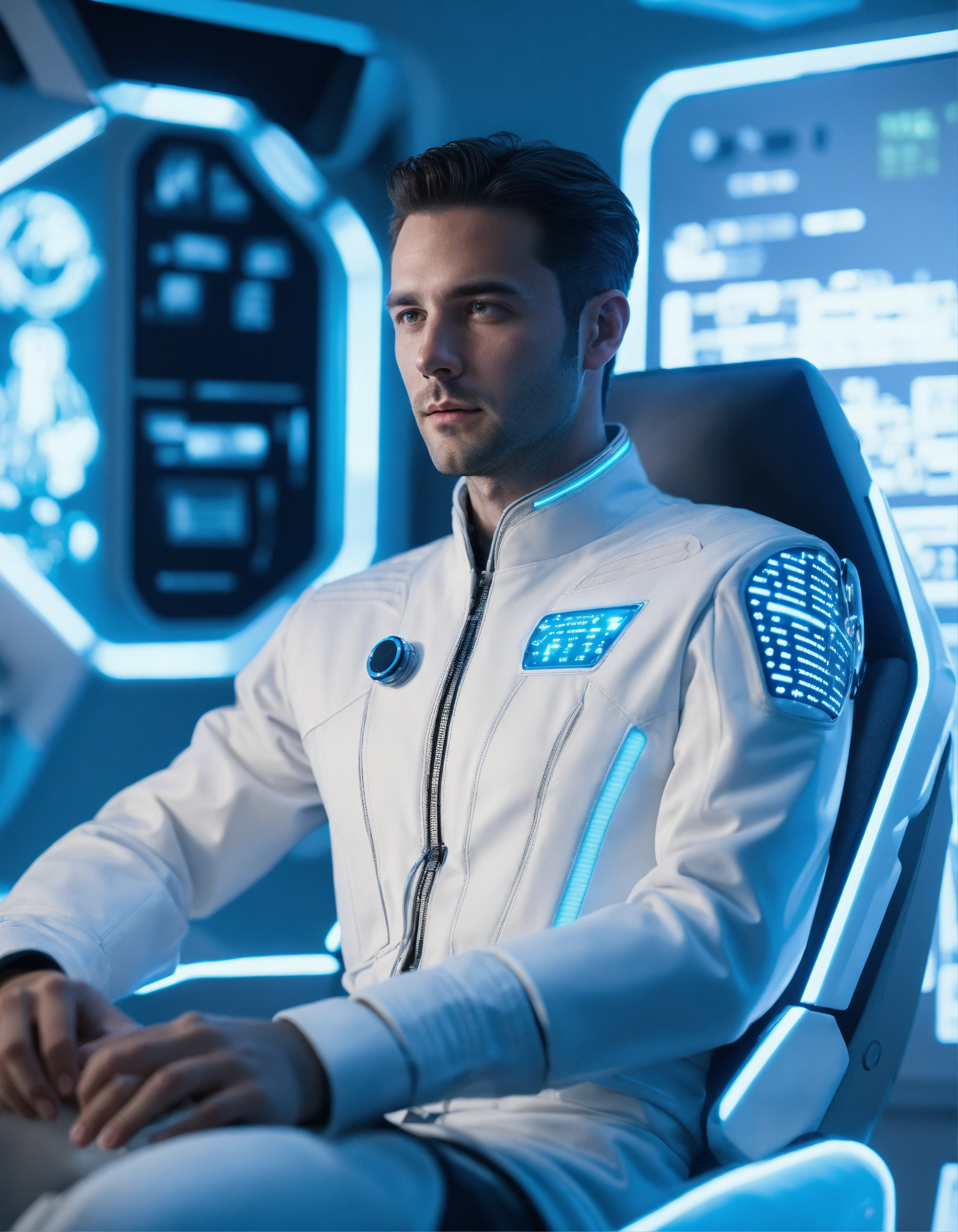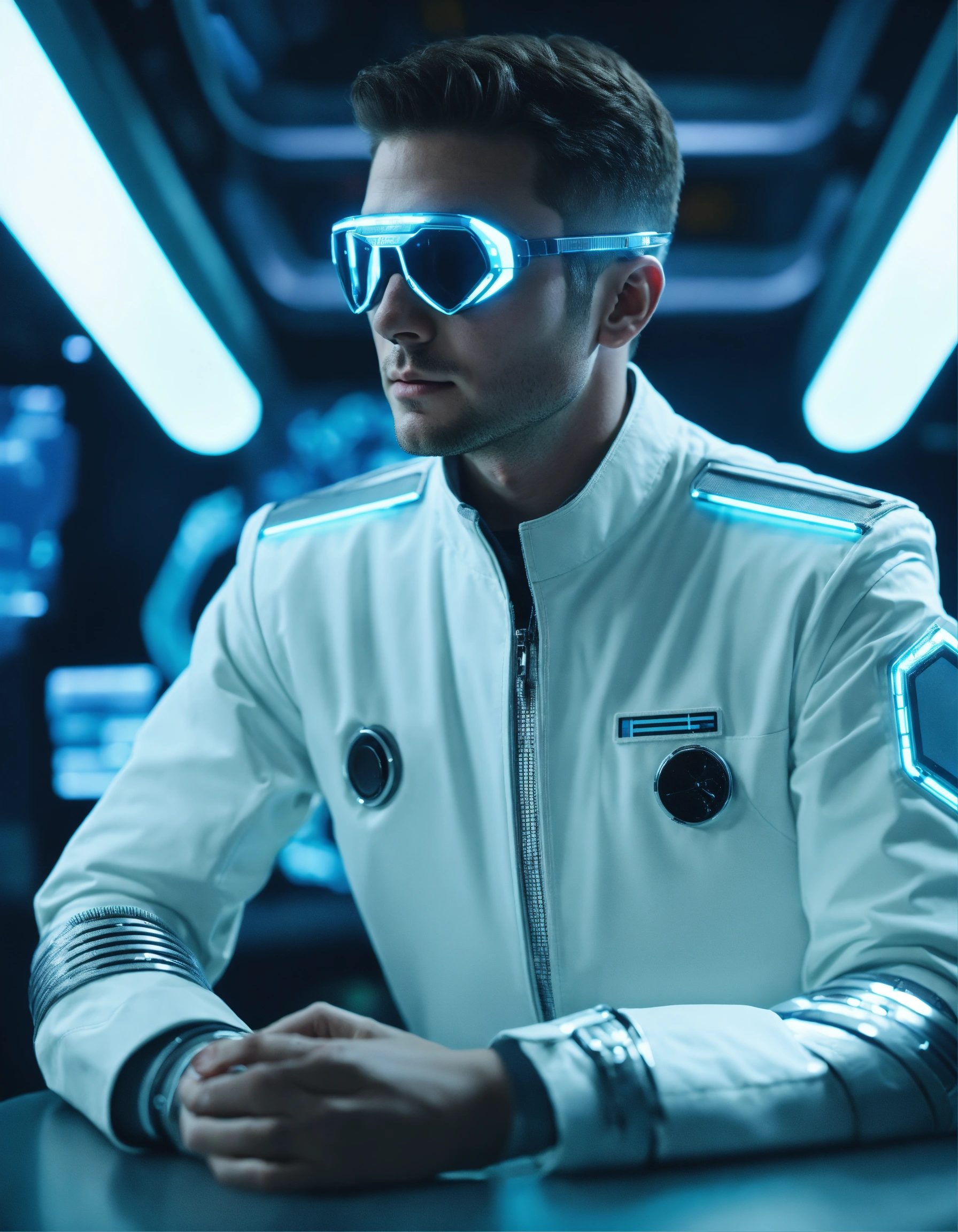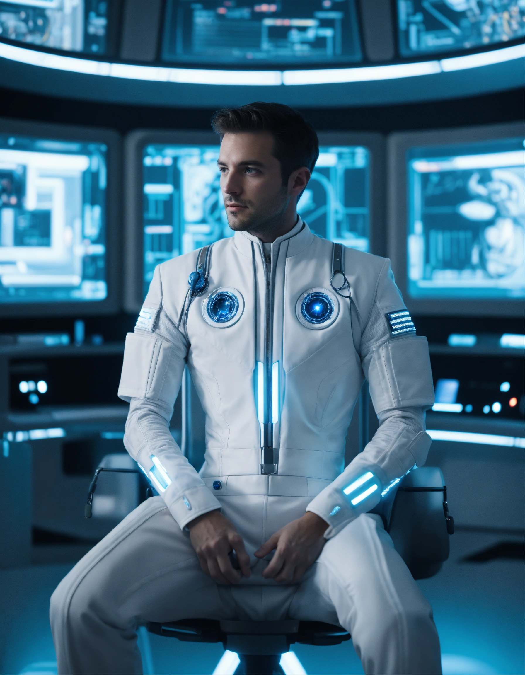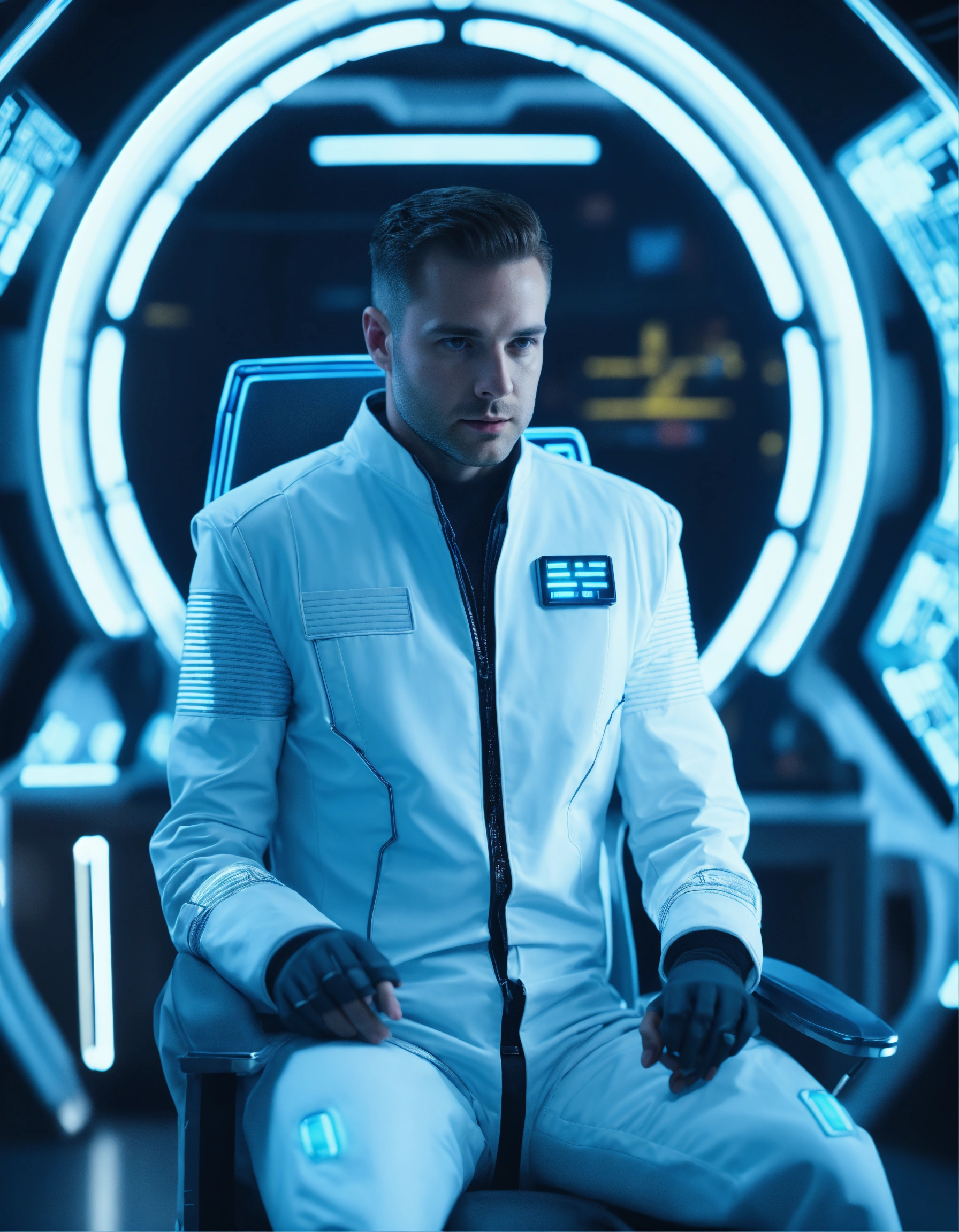 Zoom out on a cool white male 32 year old star command doctor is experimenting wearing a sleek futuristic uniform sitting in a bright white lab on hi tech on an alien starship, 8k, tron, realistic