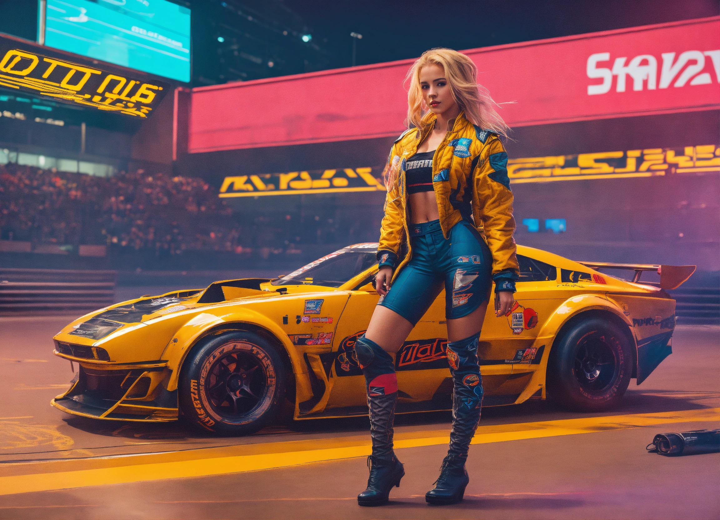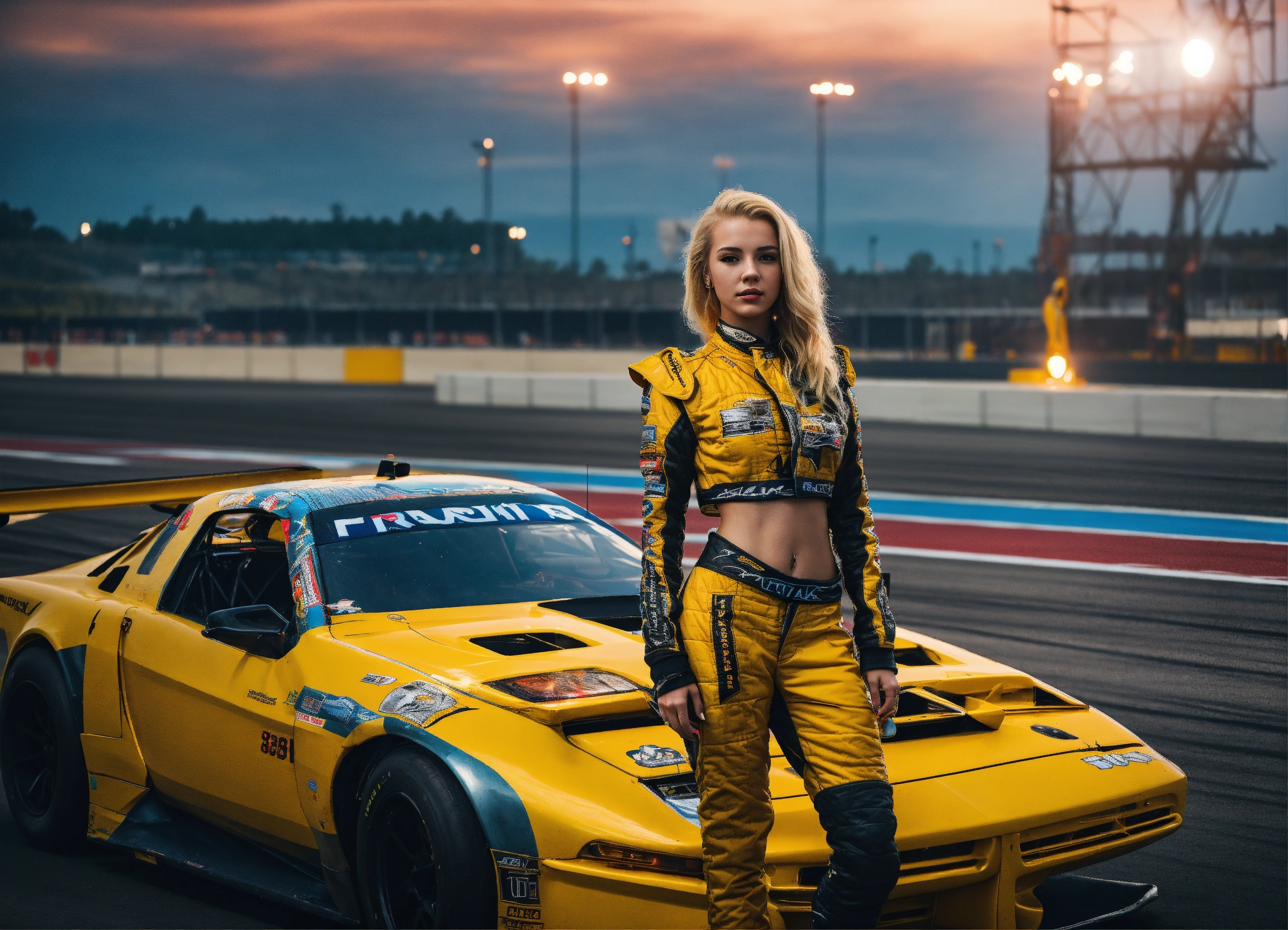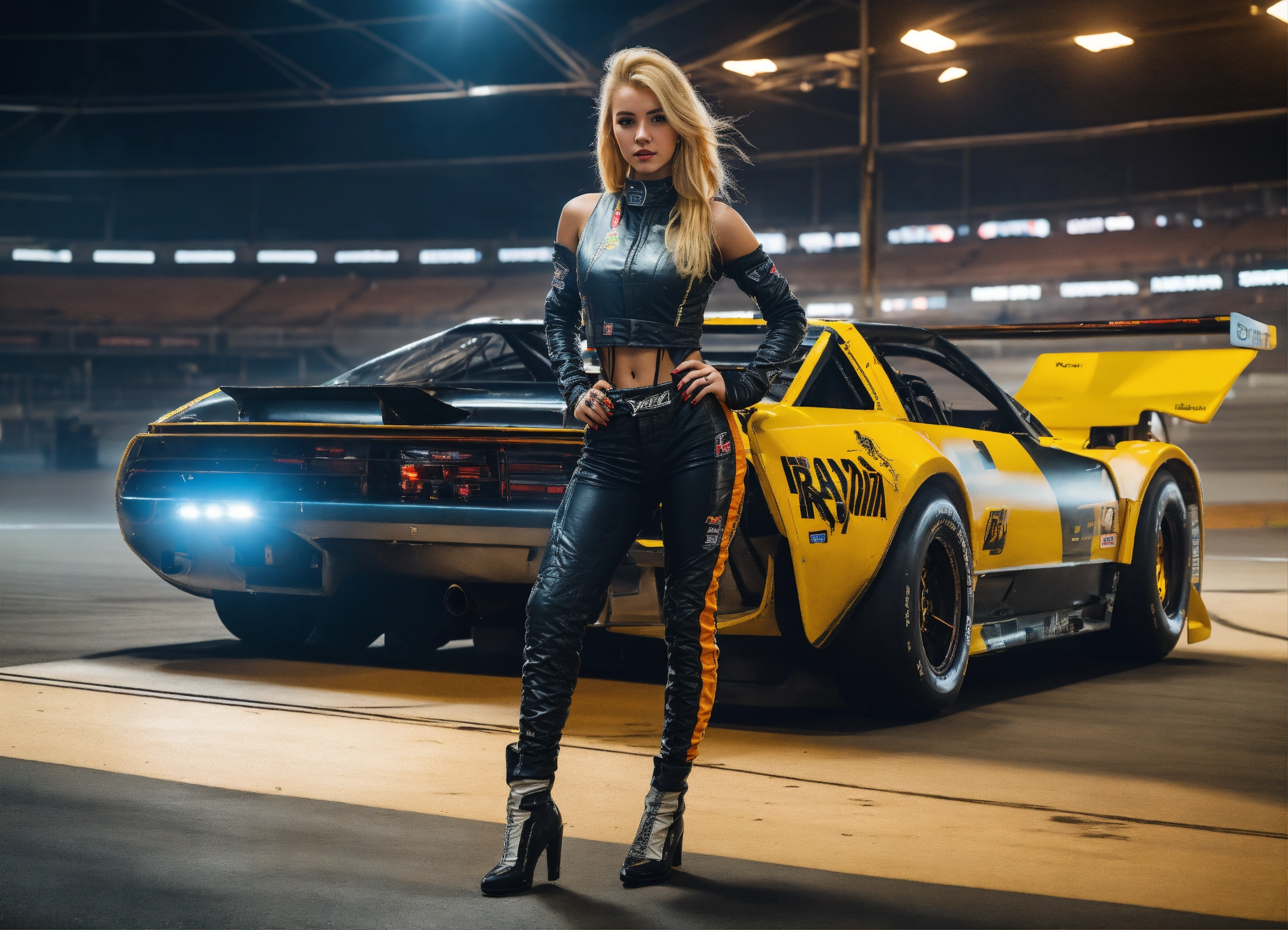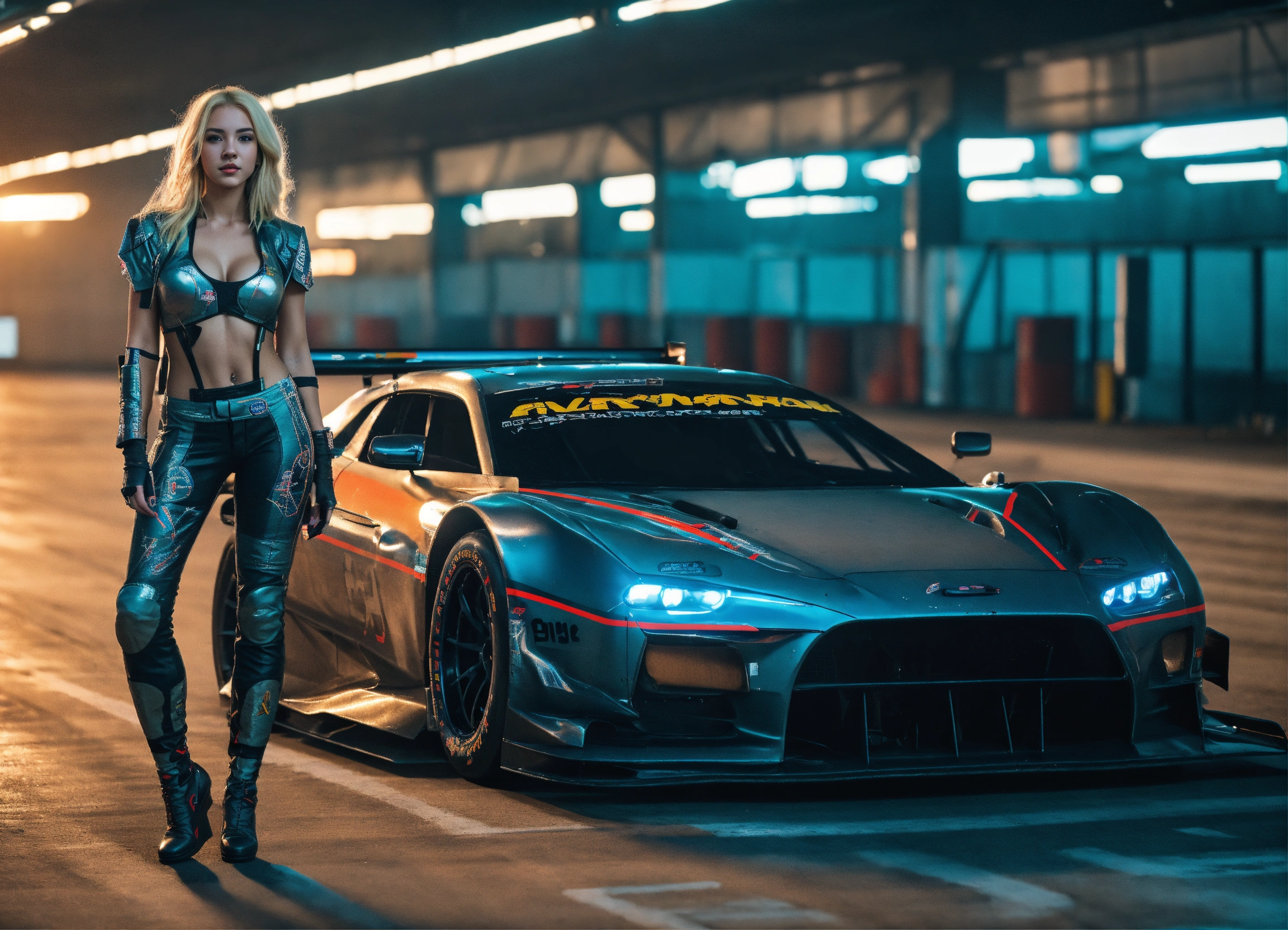 Full body photo of cyberpunk dream girl with blond hair, standing next to a race car, at the racetrack, full car, girl is separated from the car