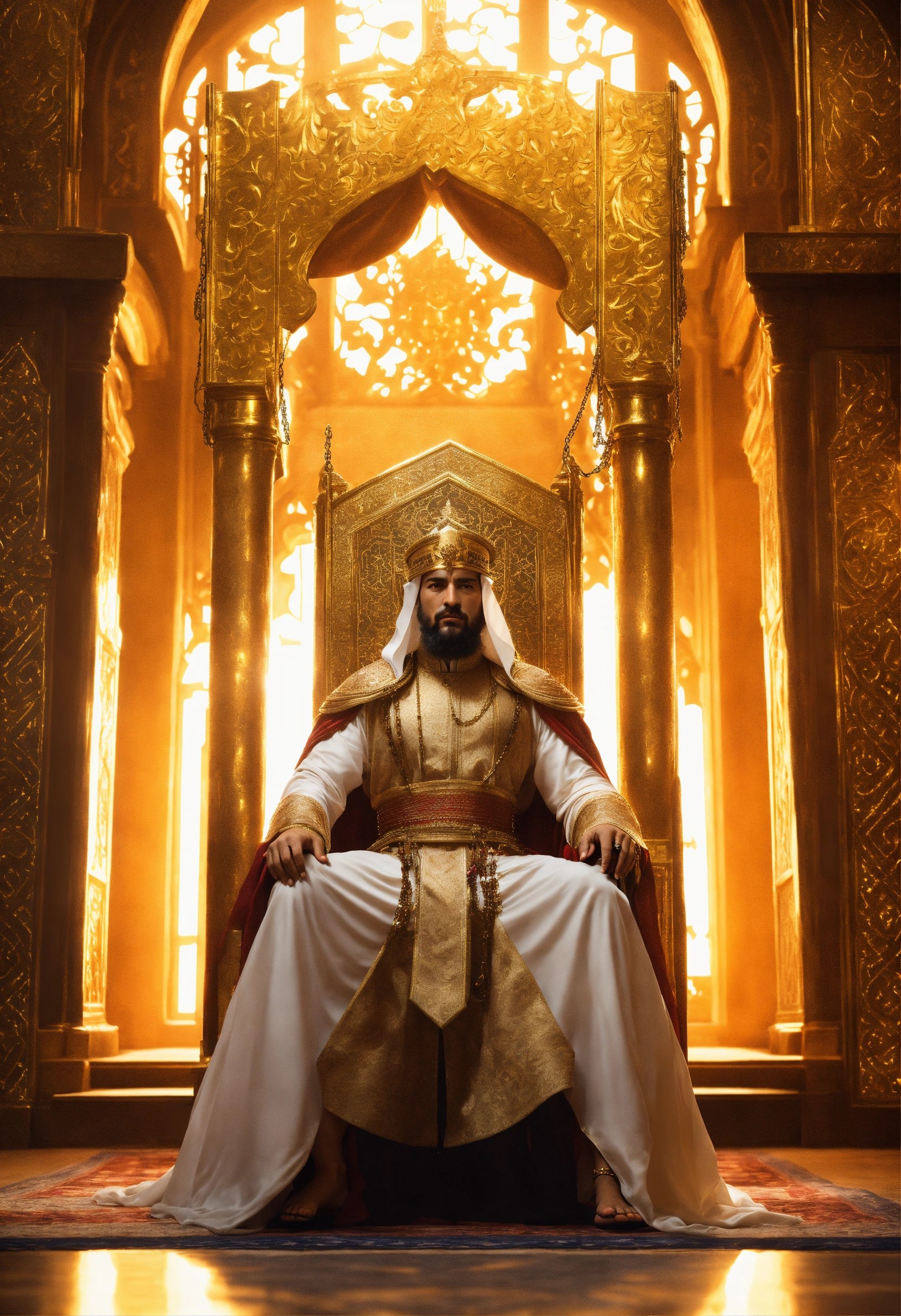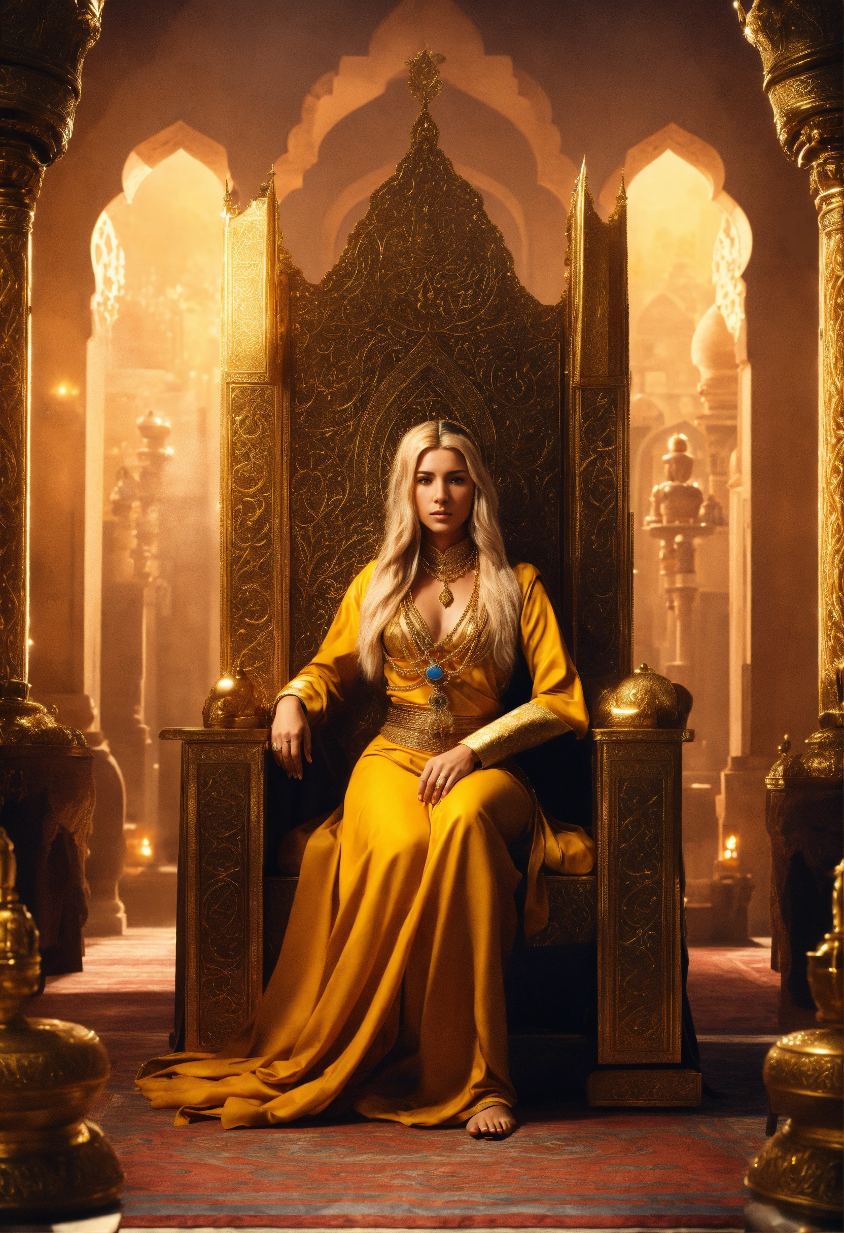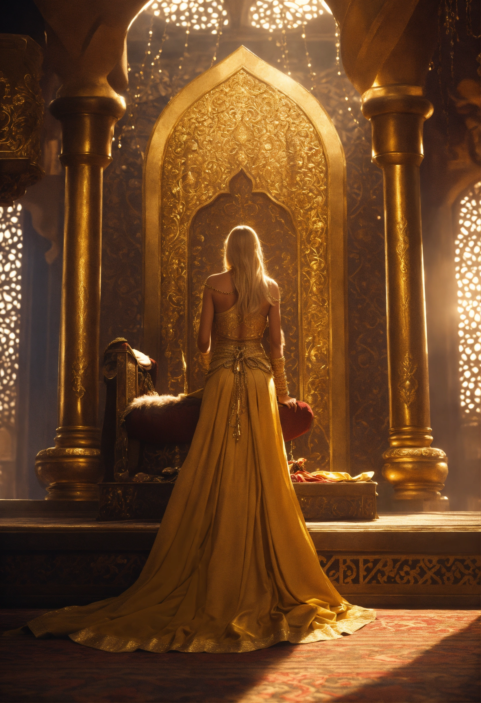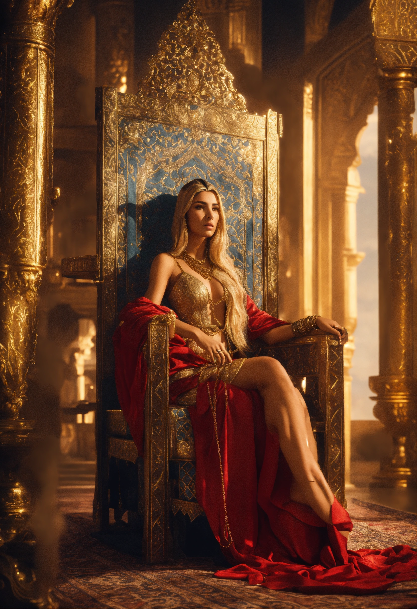 An epic fantasy scene featuring the sultan saladin sitting on a throne. a gorgeous beautiful blonde in arabian dress is standing against him in full height. her bare legs are tied with a thin golden chain. rear view. cinematic view, sharp detail.