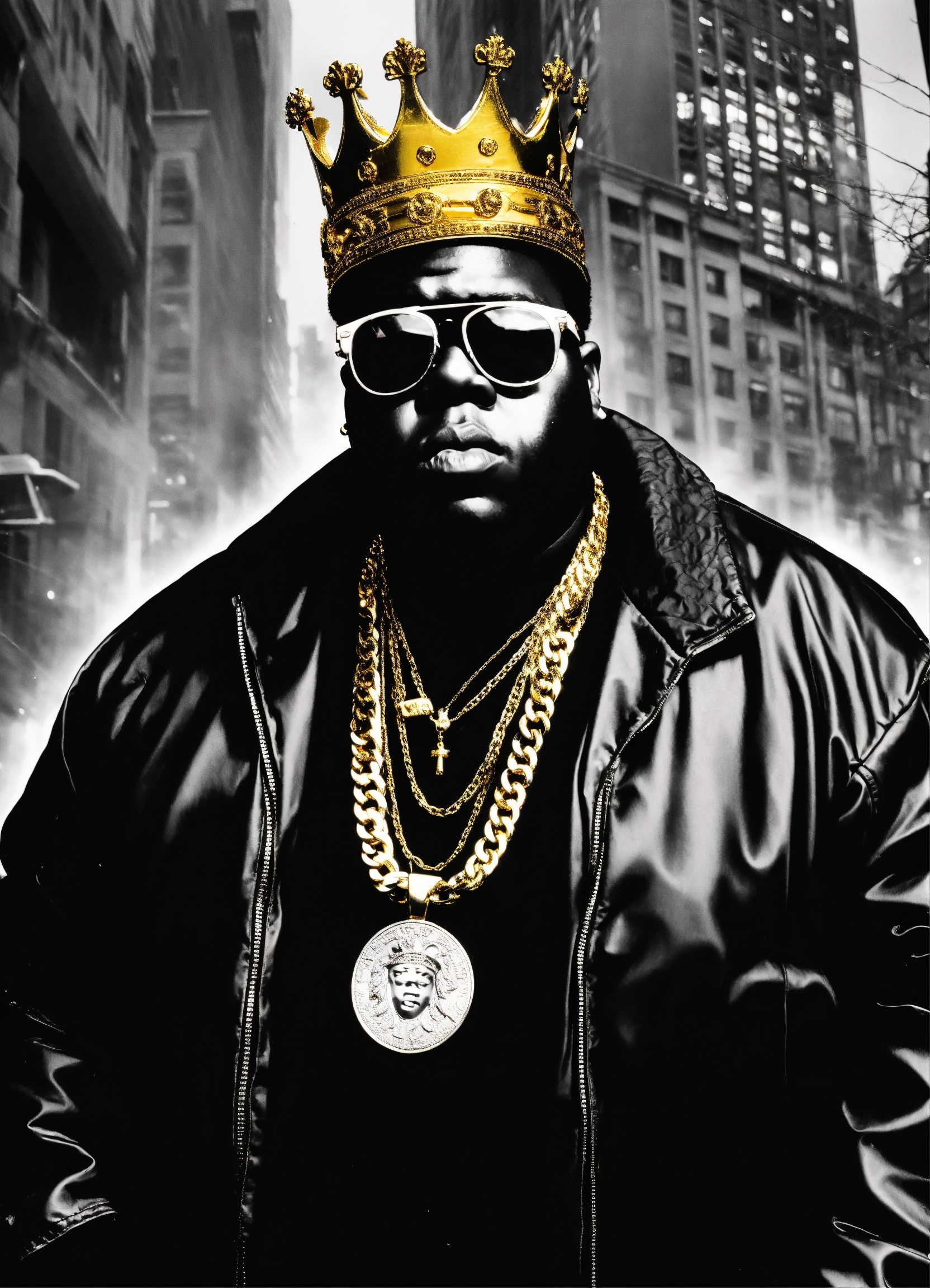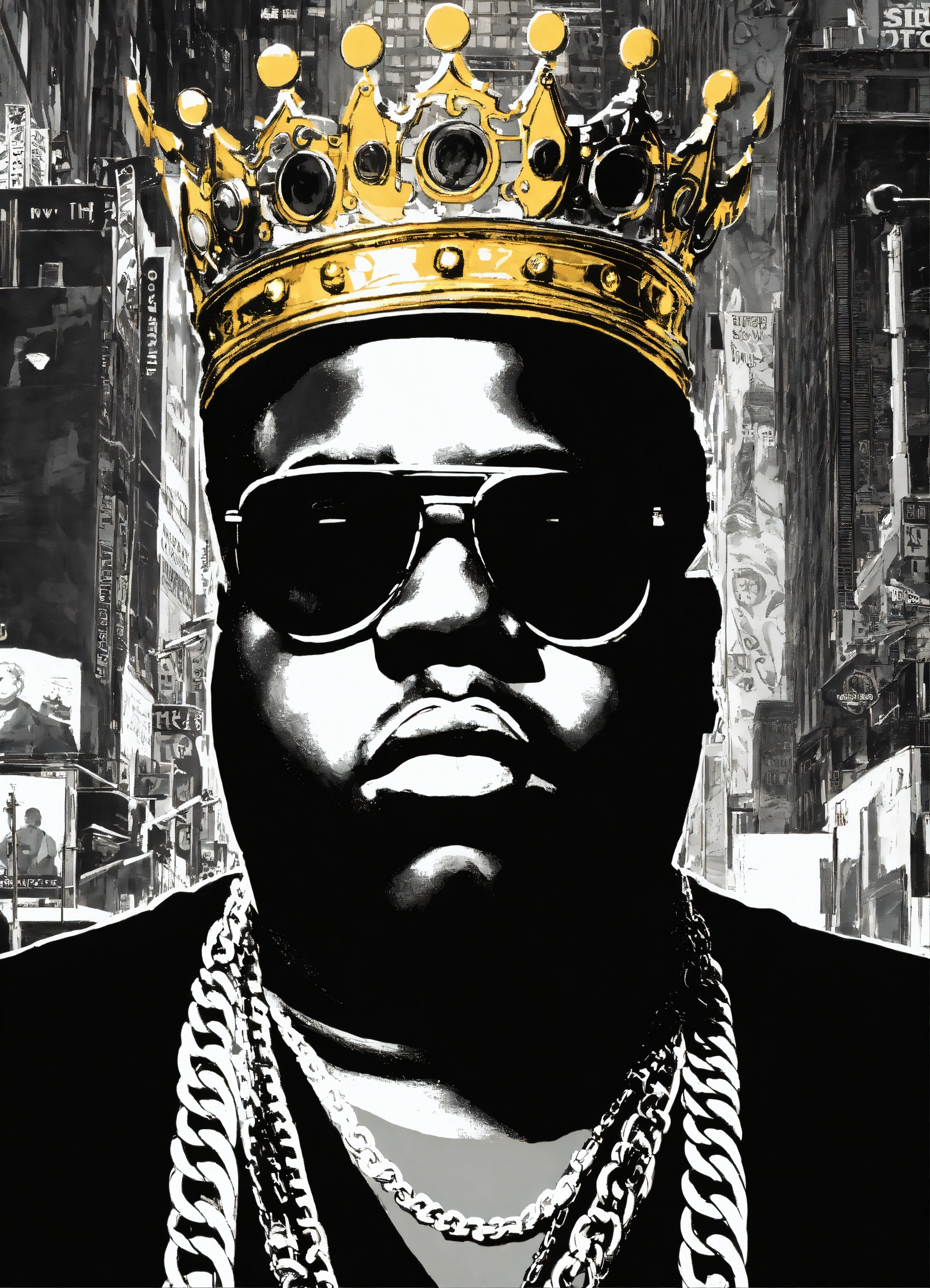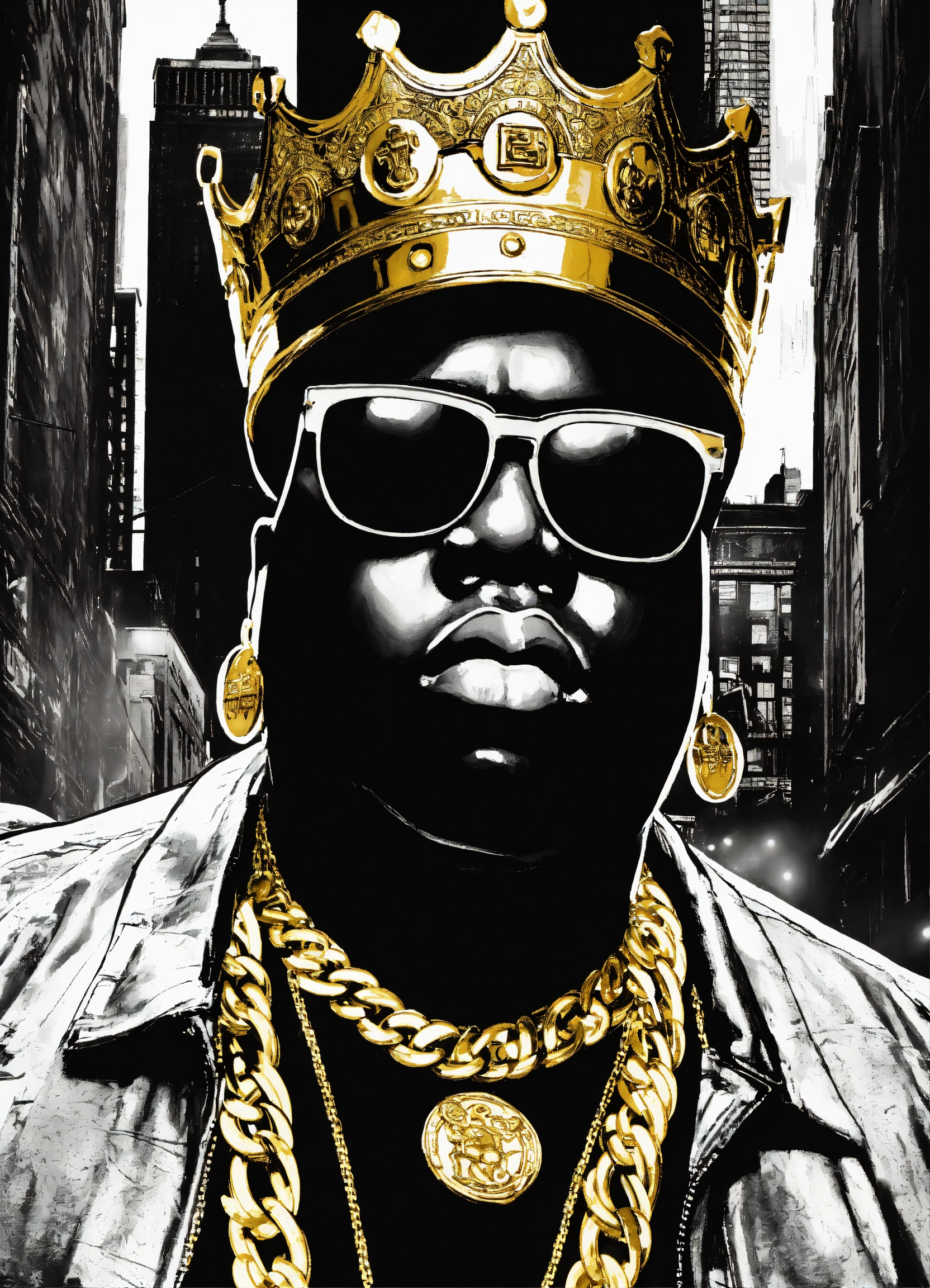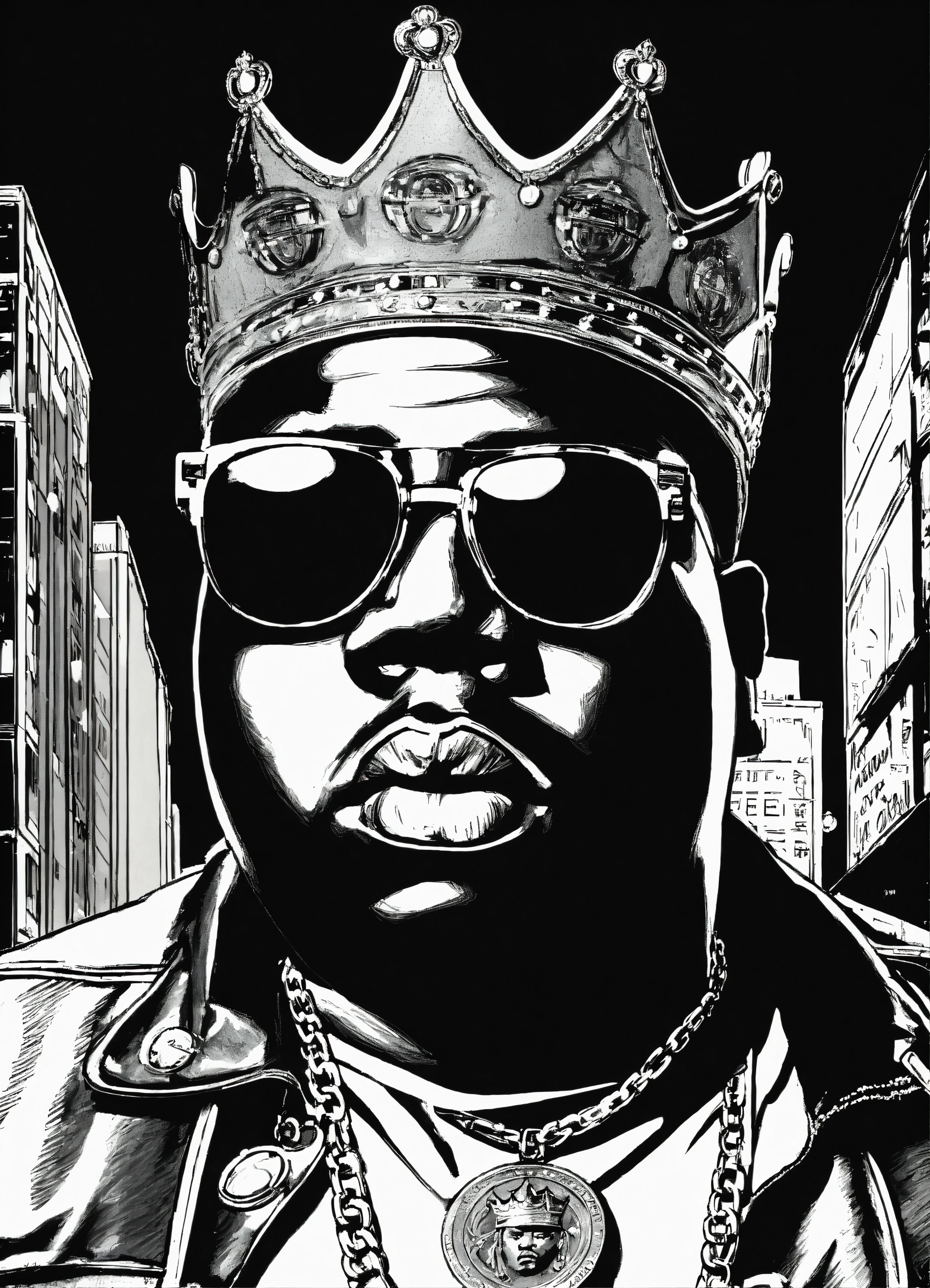 Notorious big in black and white background, city of new york, wearing no chains, versace glasses and a golden crown over his head, comic