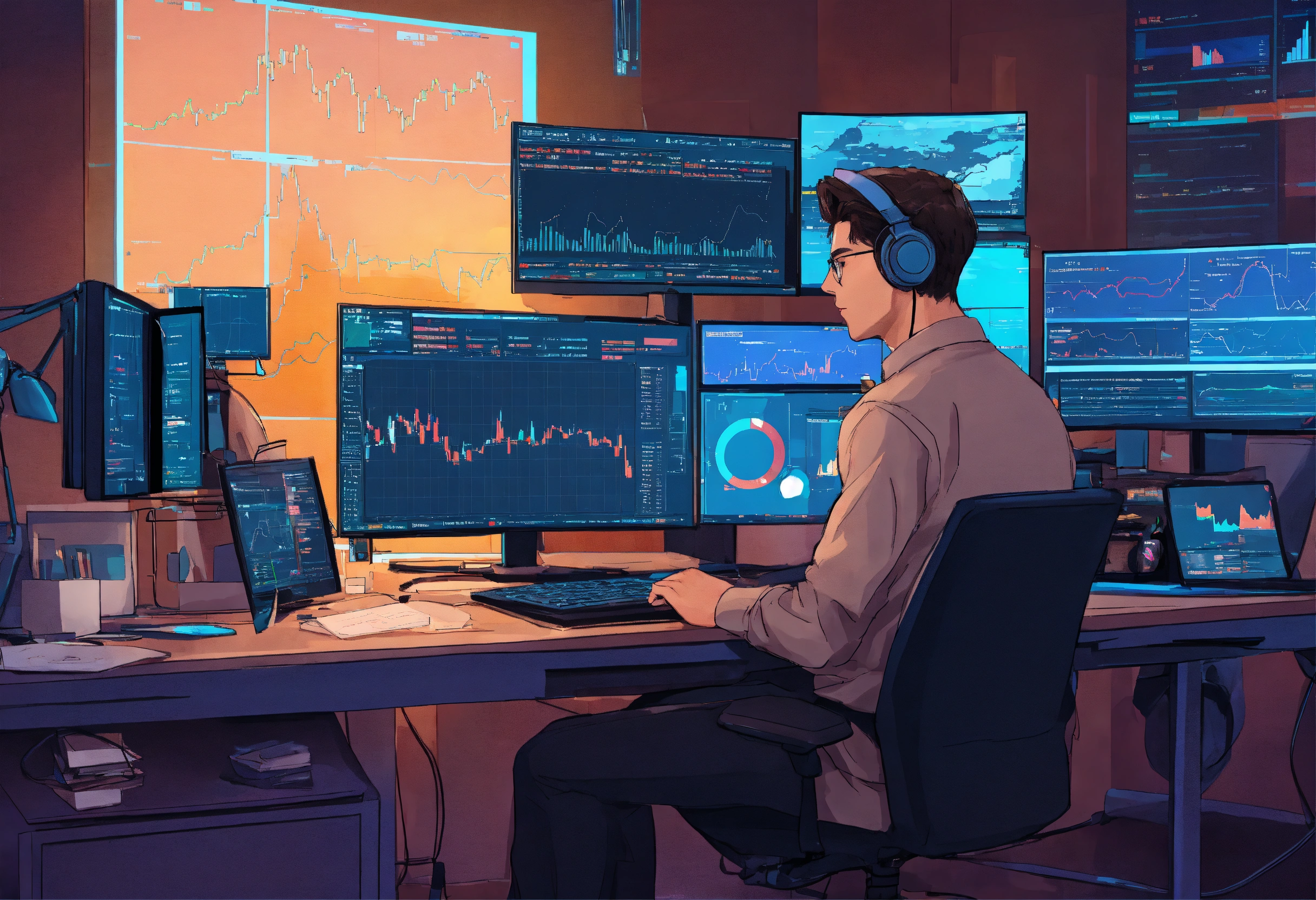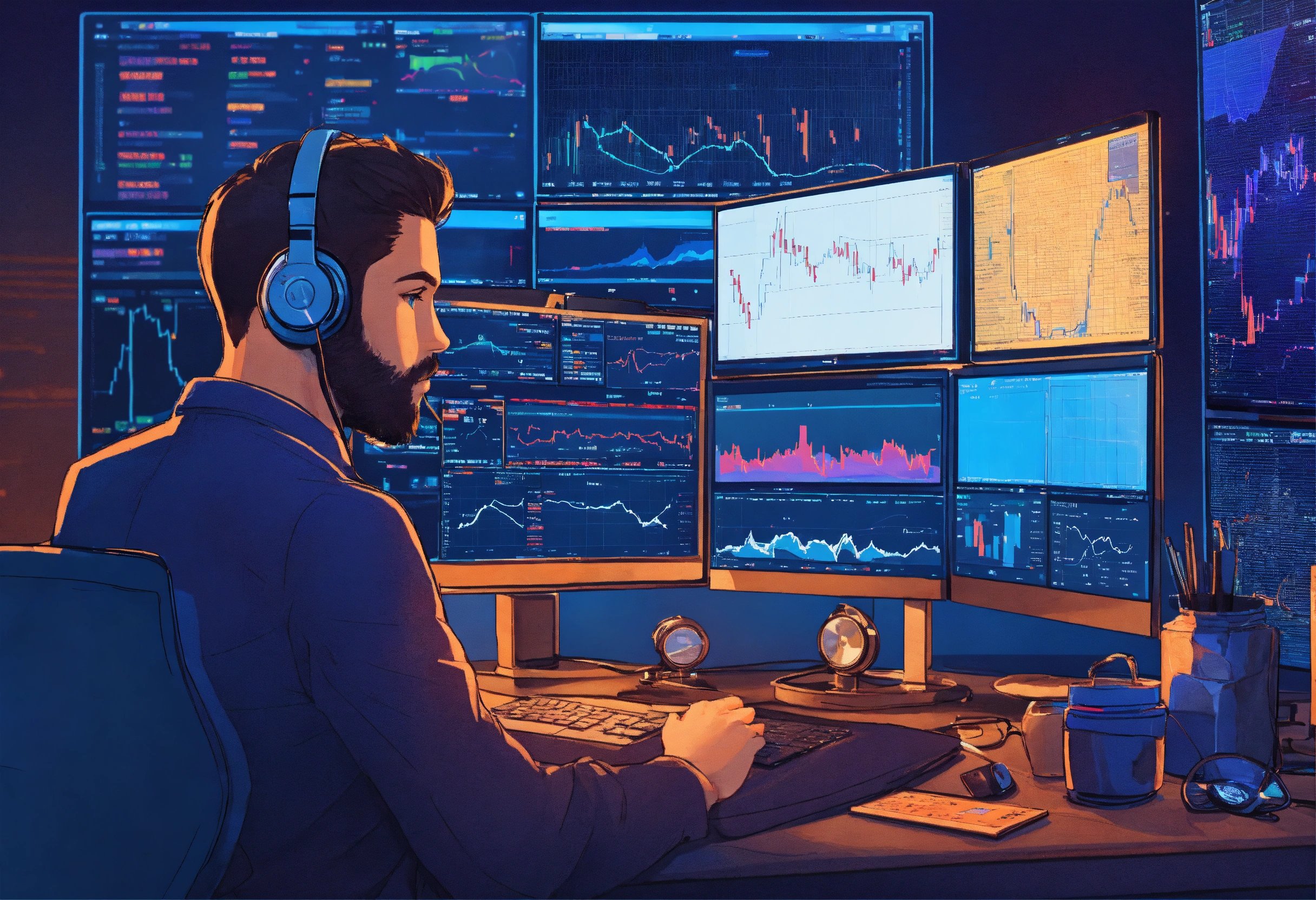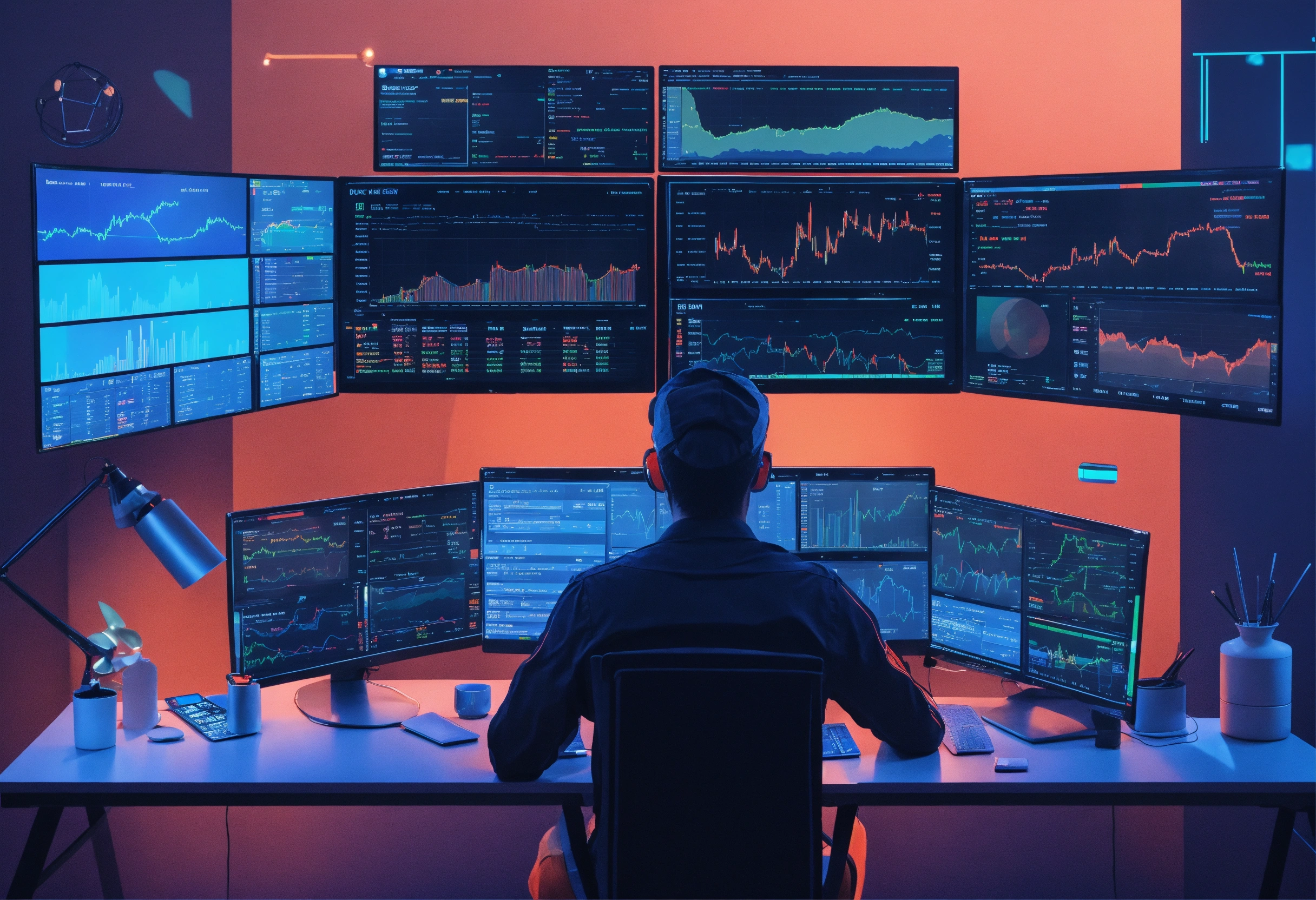 Crypto trader sitting at his desk surrounded by monitors and graphs