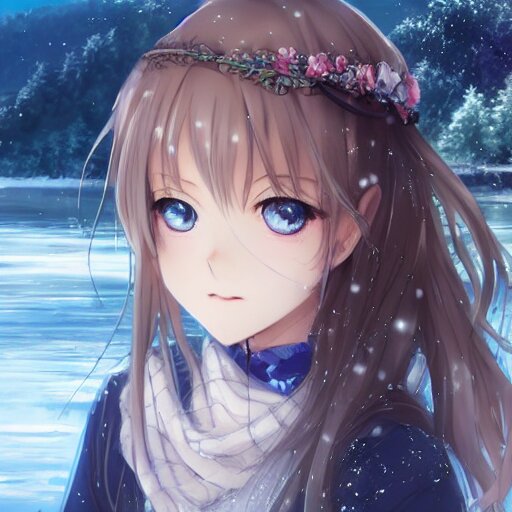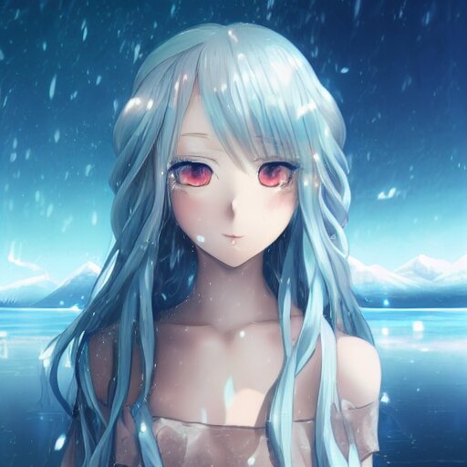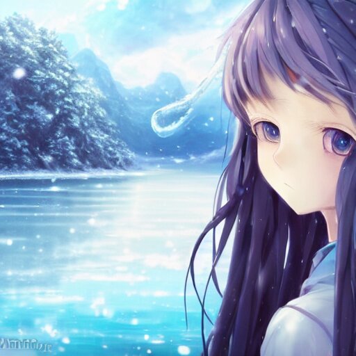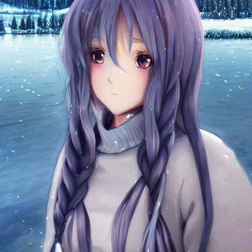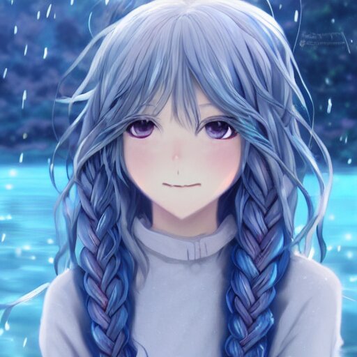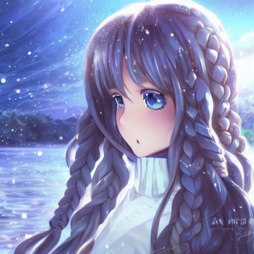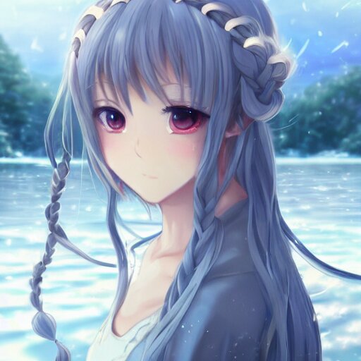 A very beautiful anime girl, full body, long braided curly silver hair, sky blue eyes, full round face, short smile, casual clothes, ice snowy lake setting, cinematic lightning, medium shot, mid-shot, highly detailed, trending on artstation, unreal engine 4k, cinematic wallpaper by stanley artgerm lau, wlop, rossdraws, james jean, andrei riabovitchev, marc simonetti, and sakimichan