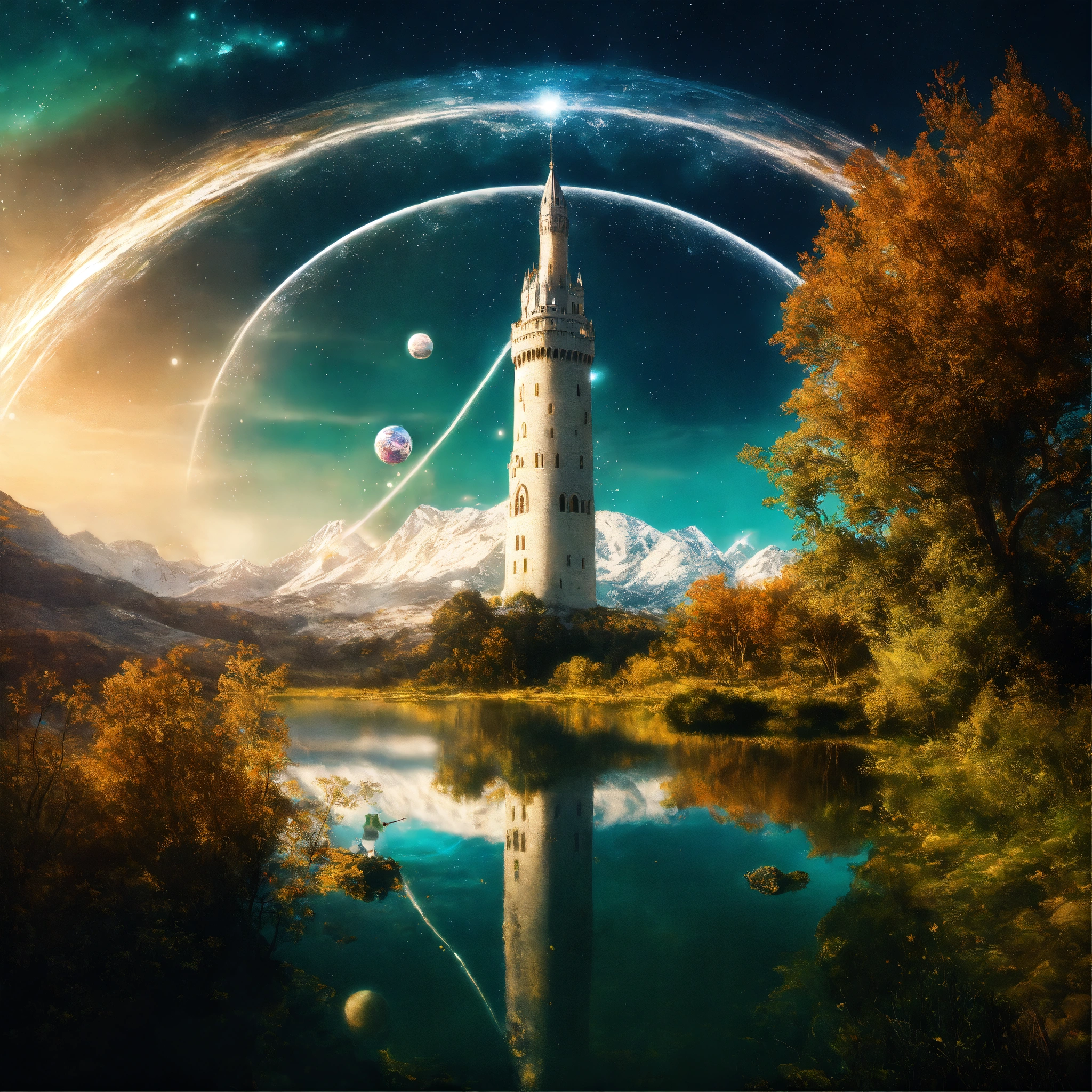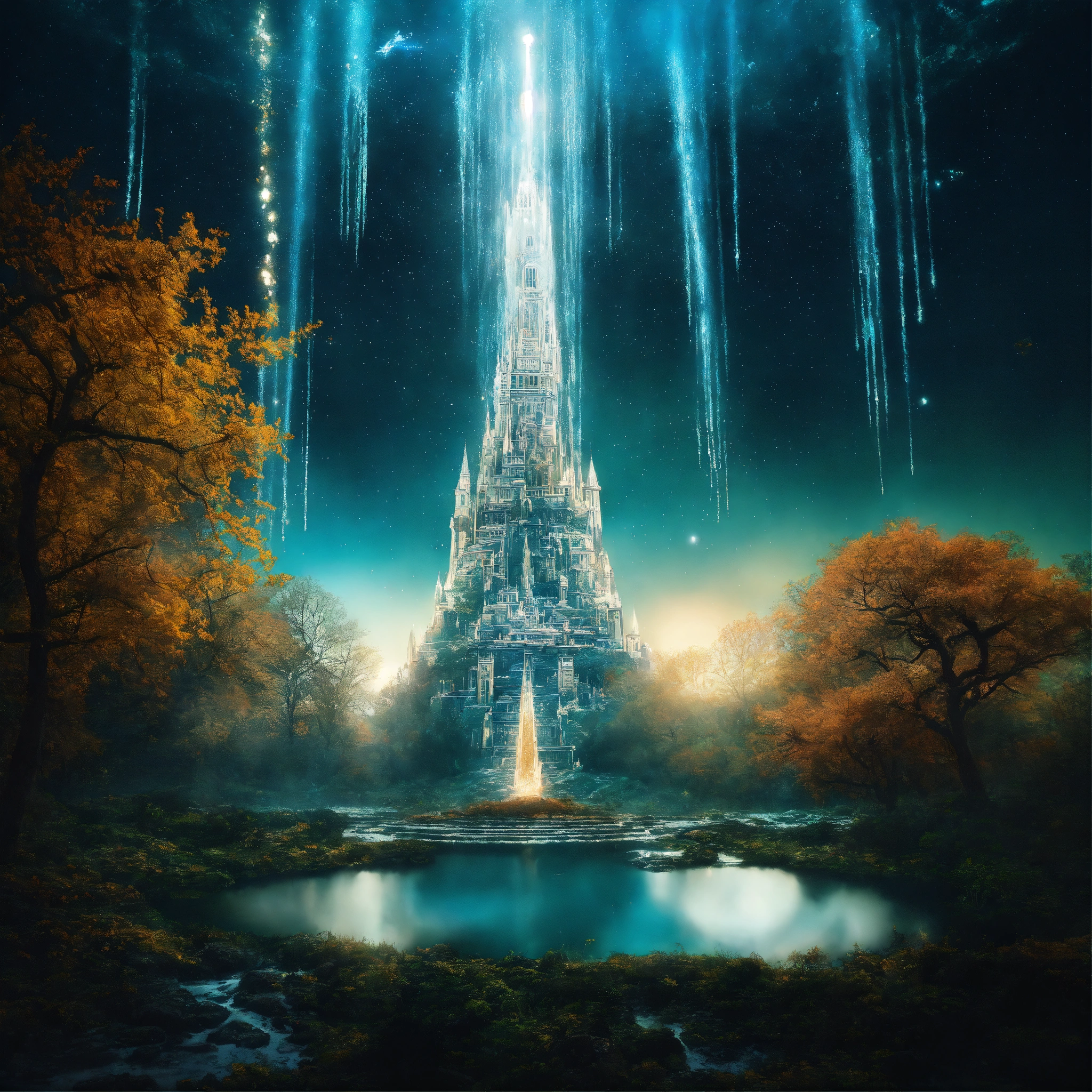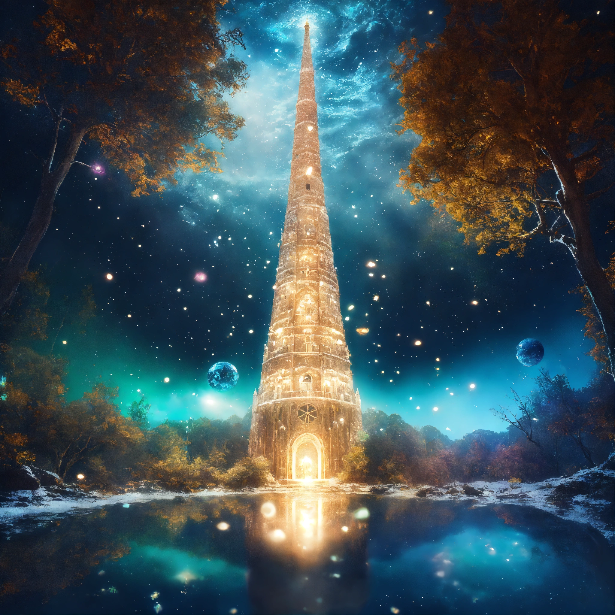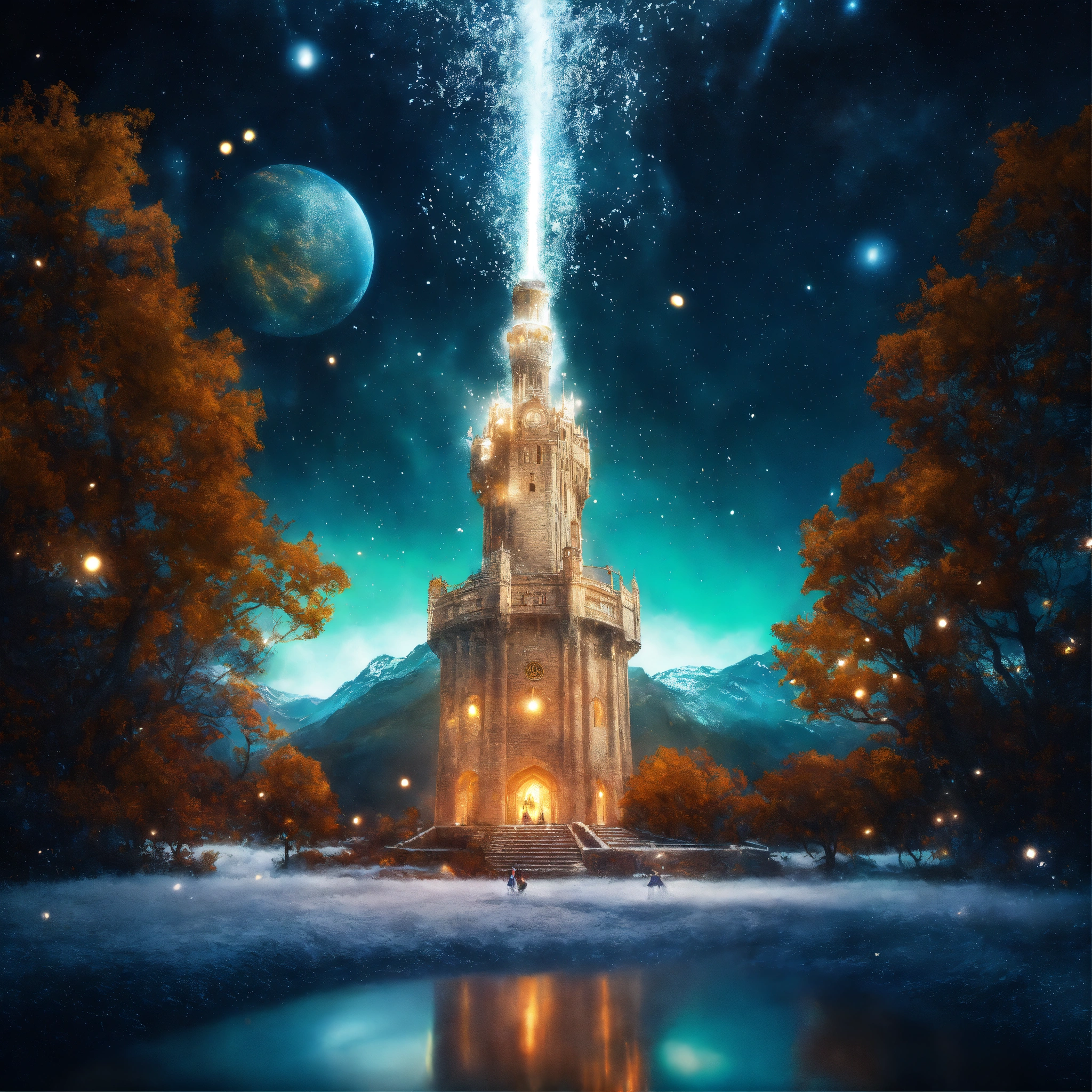 Underwater long exposure photography, giant white tower flying in the cosmos with orbs and portals, x-ray style, in the style of tim burton, lion king, the chronicles of narnia, beauty and the beast, and peter pan. with sacred geometric patterns on the body. enchanting aura. the chronicles of narnia, wizard of oz, and alice in wonderland background with snow mountains, and trees with white leaves.