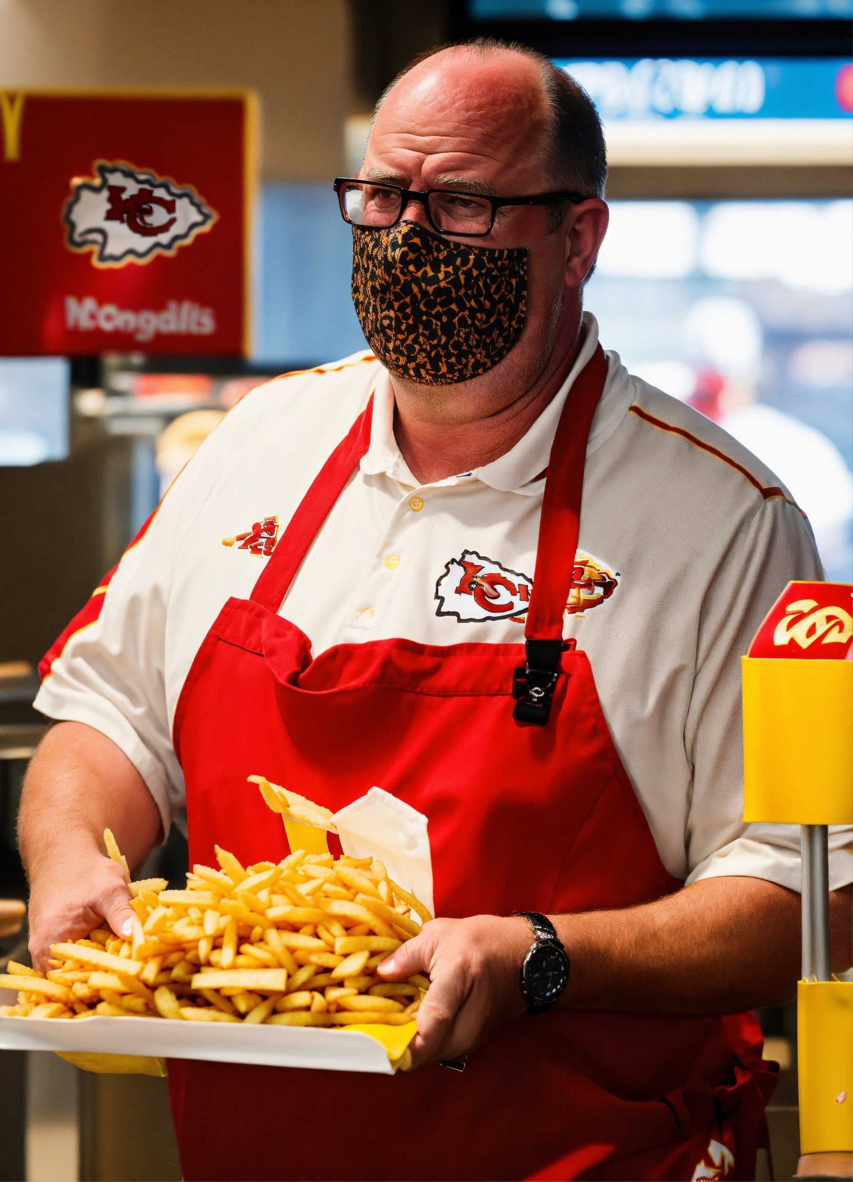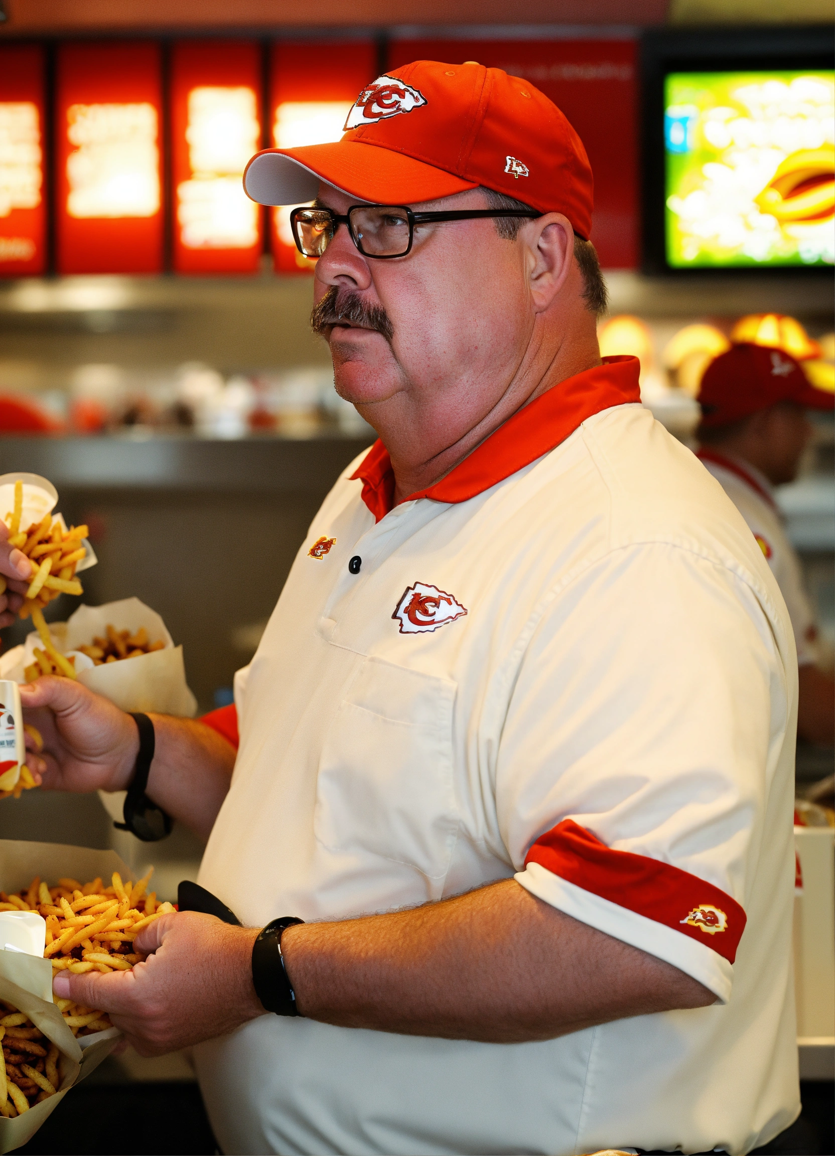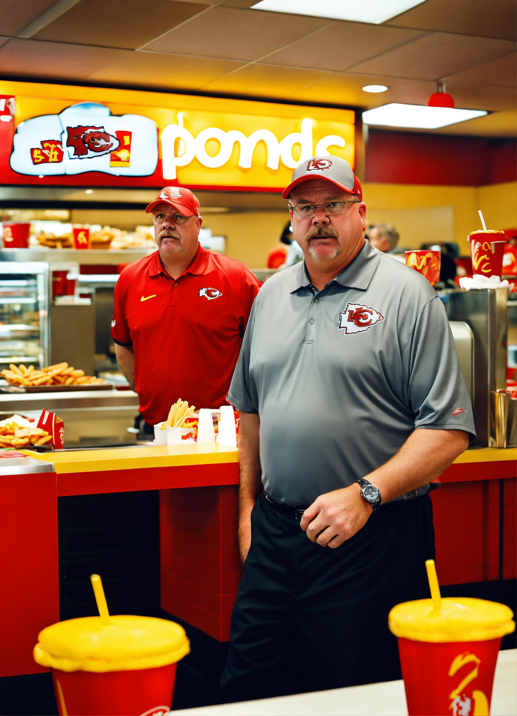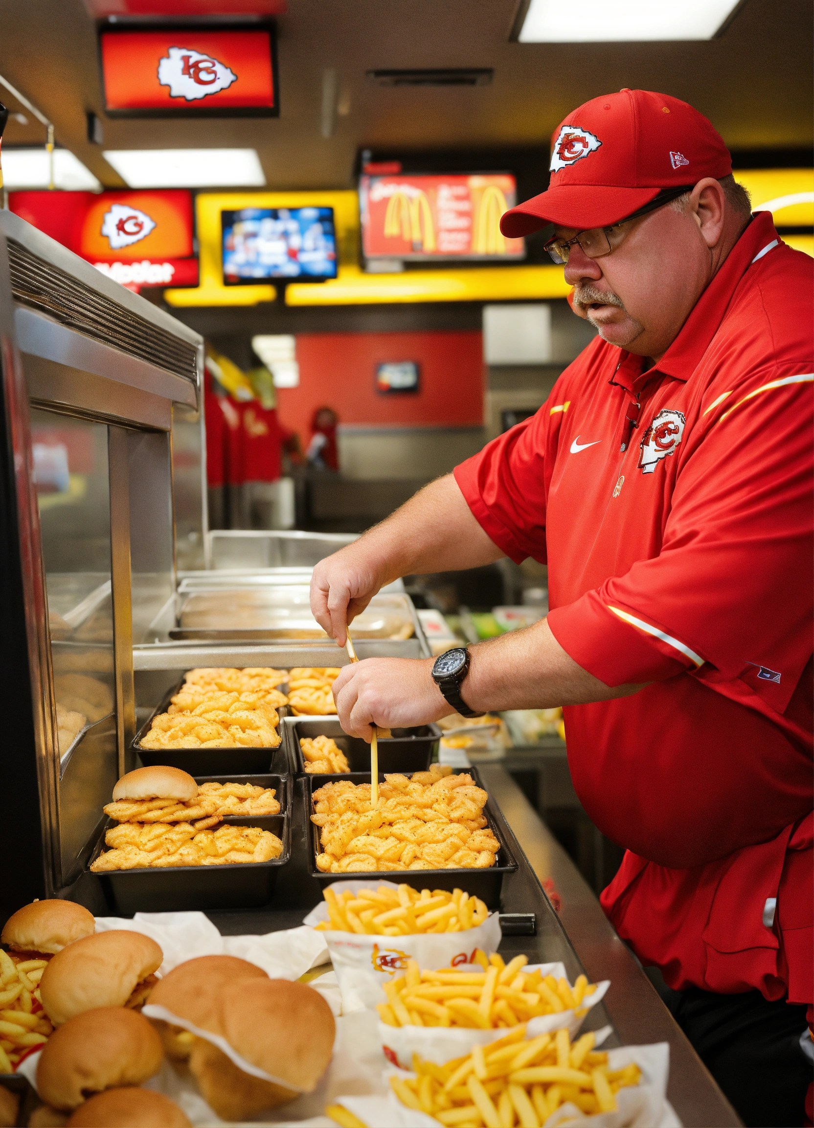 Andy reid coach of kansas city chiefs working at a mcdonalds