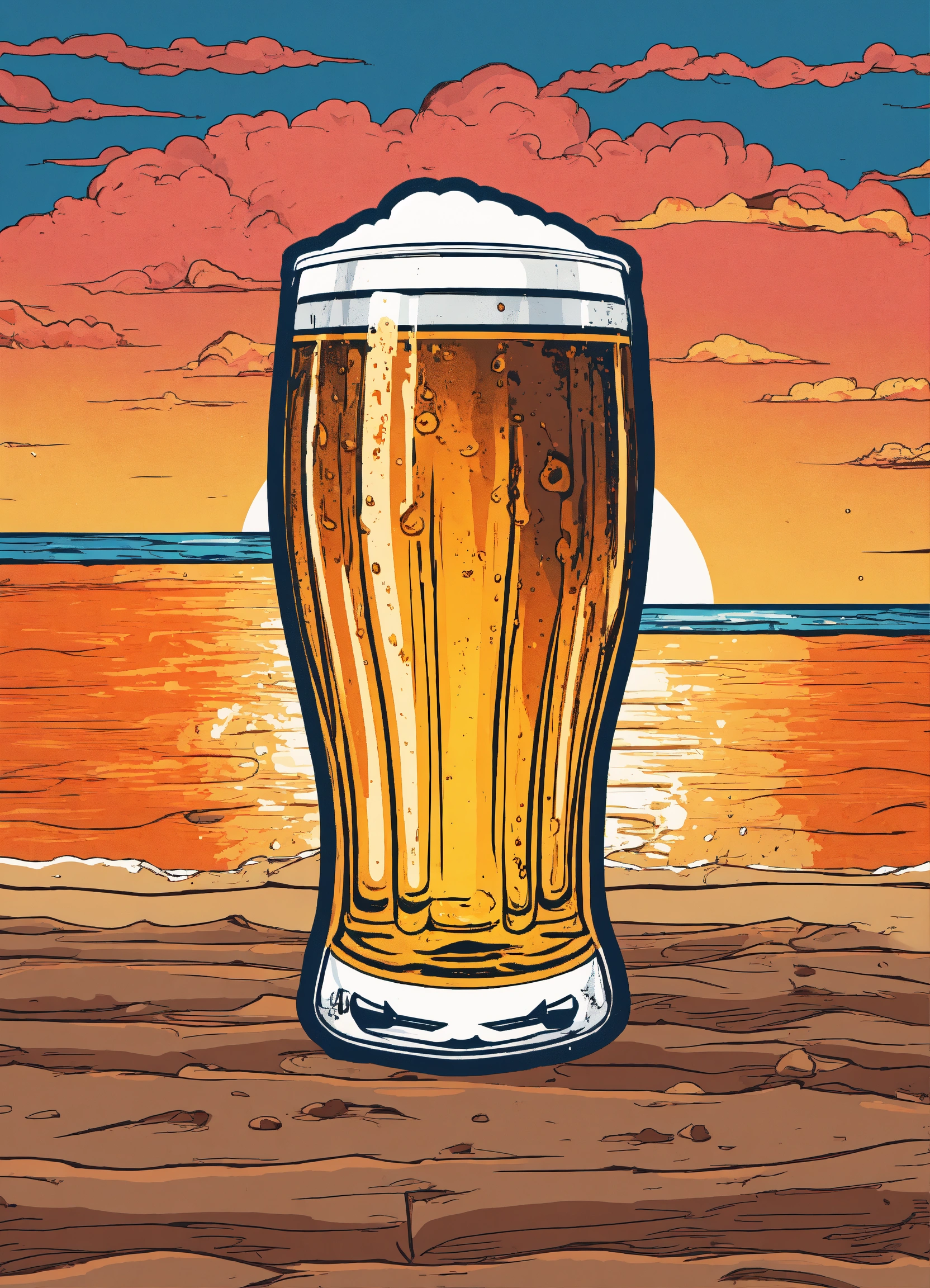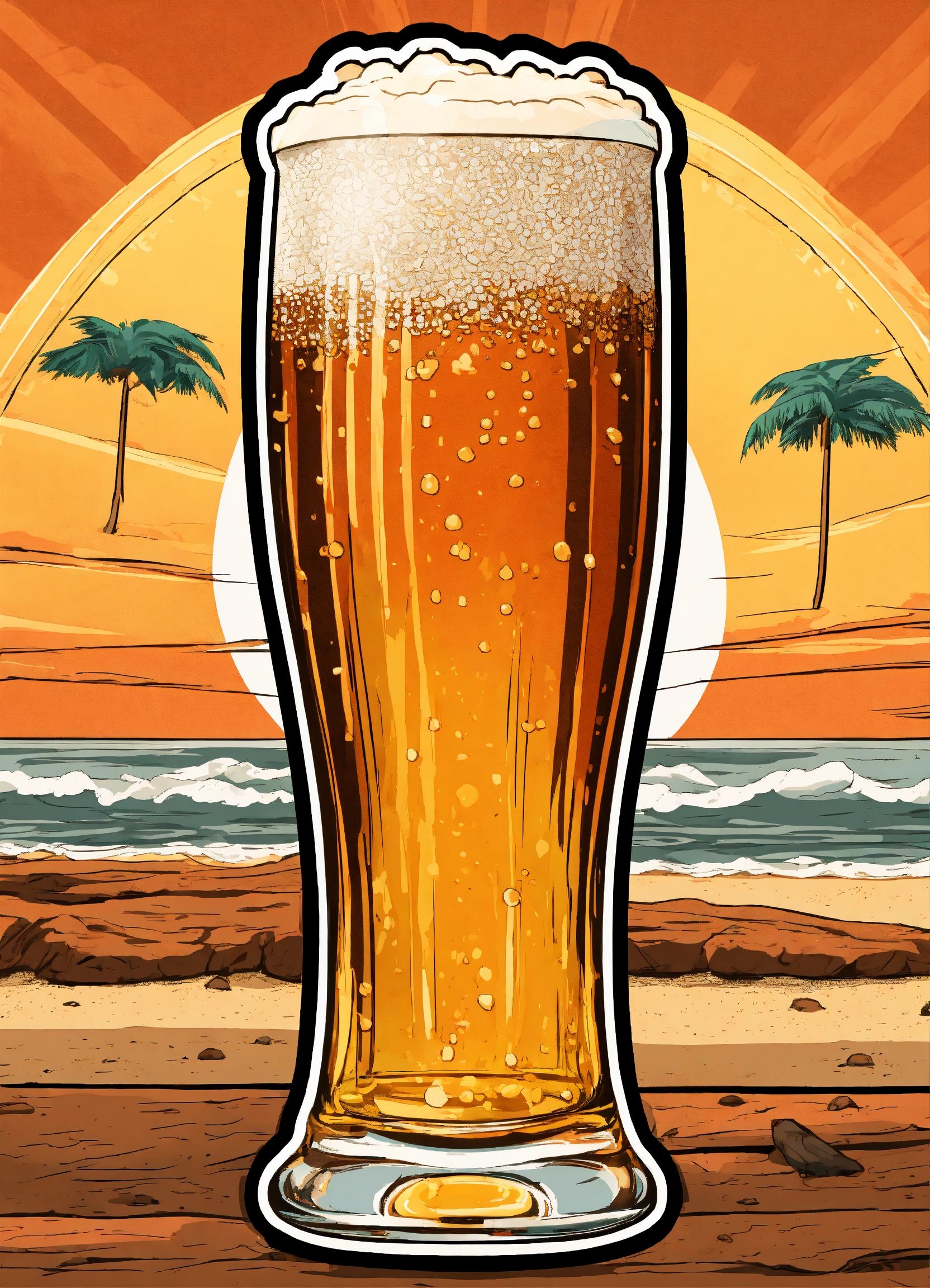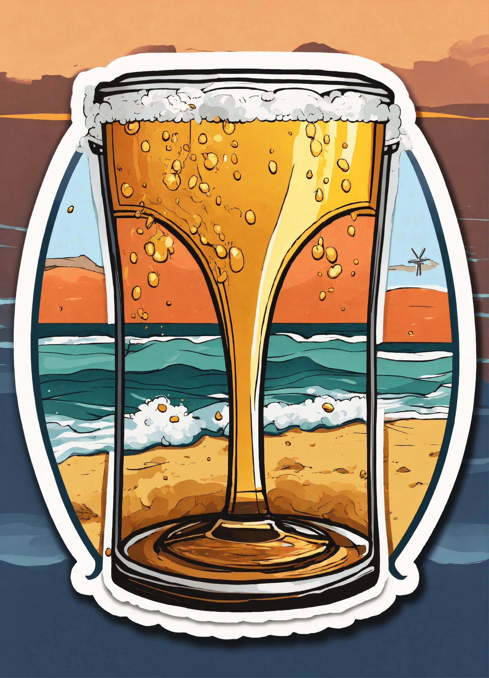 Oval sticker, very detailed beer glass, lost in beach background, t-shirt design, streetwear design, pro vector, full design, 6 colors only, solid colors, no shadows, full design, warm colors, sticker, bright colors