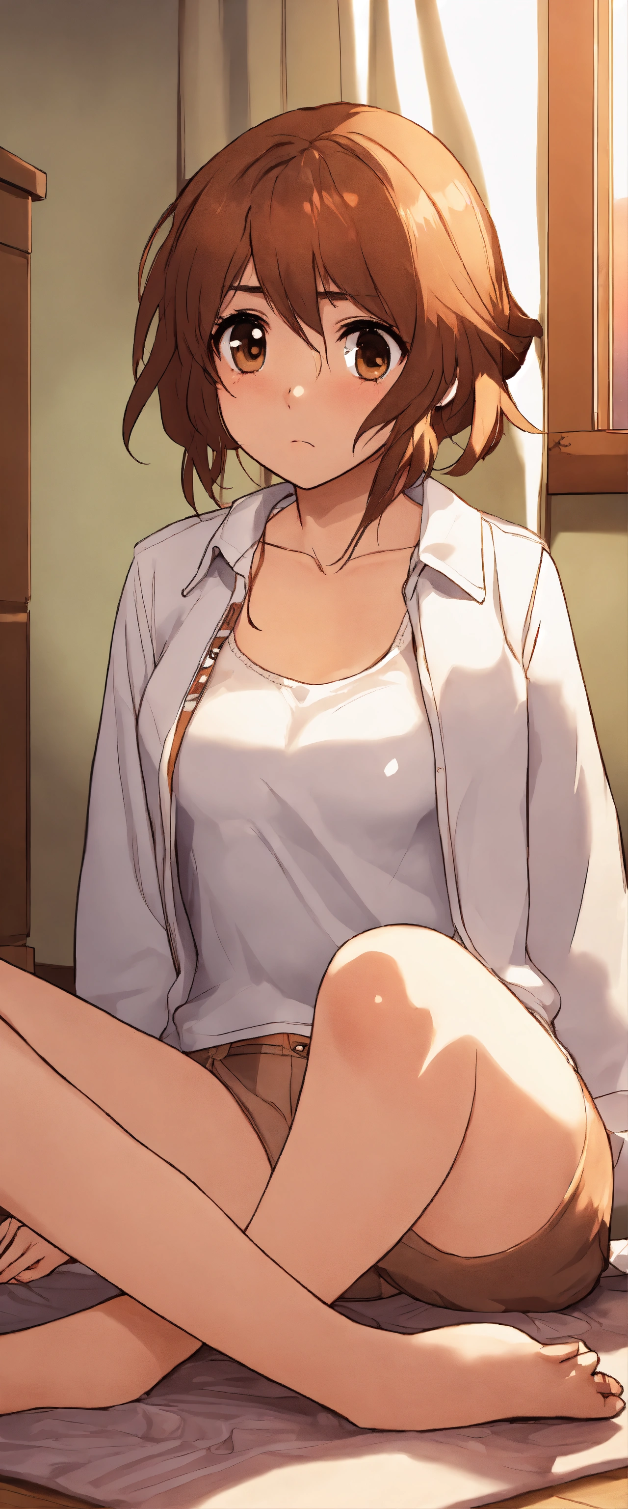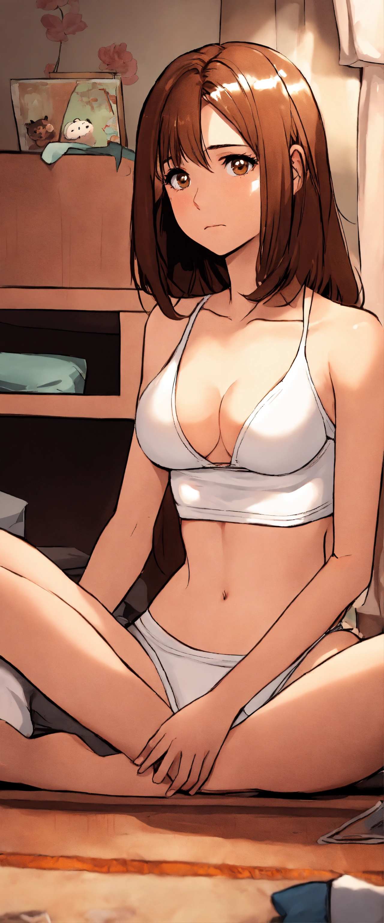18-years old girl wearing white bra, white briefs, comic character, brown hair and brown eyes, sad, bedroom, sitting on the floor
