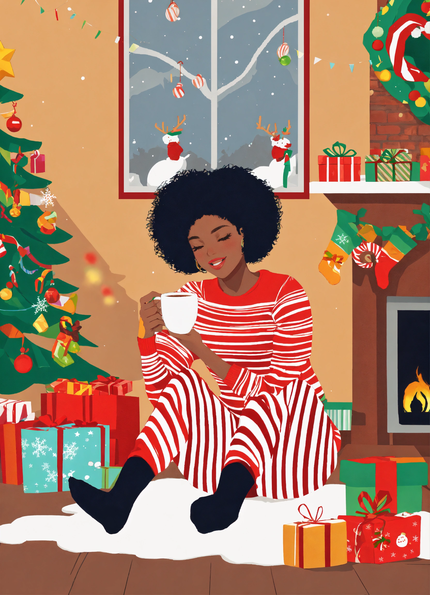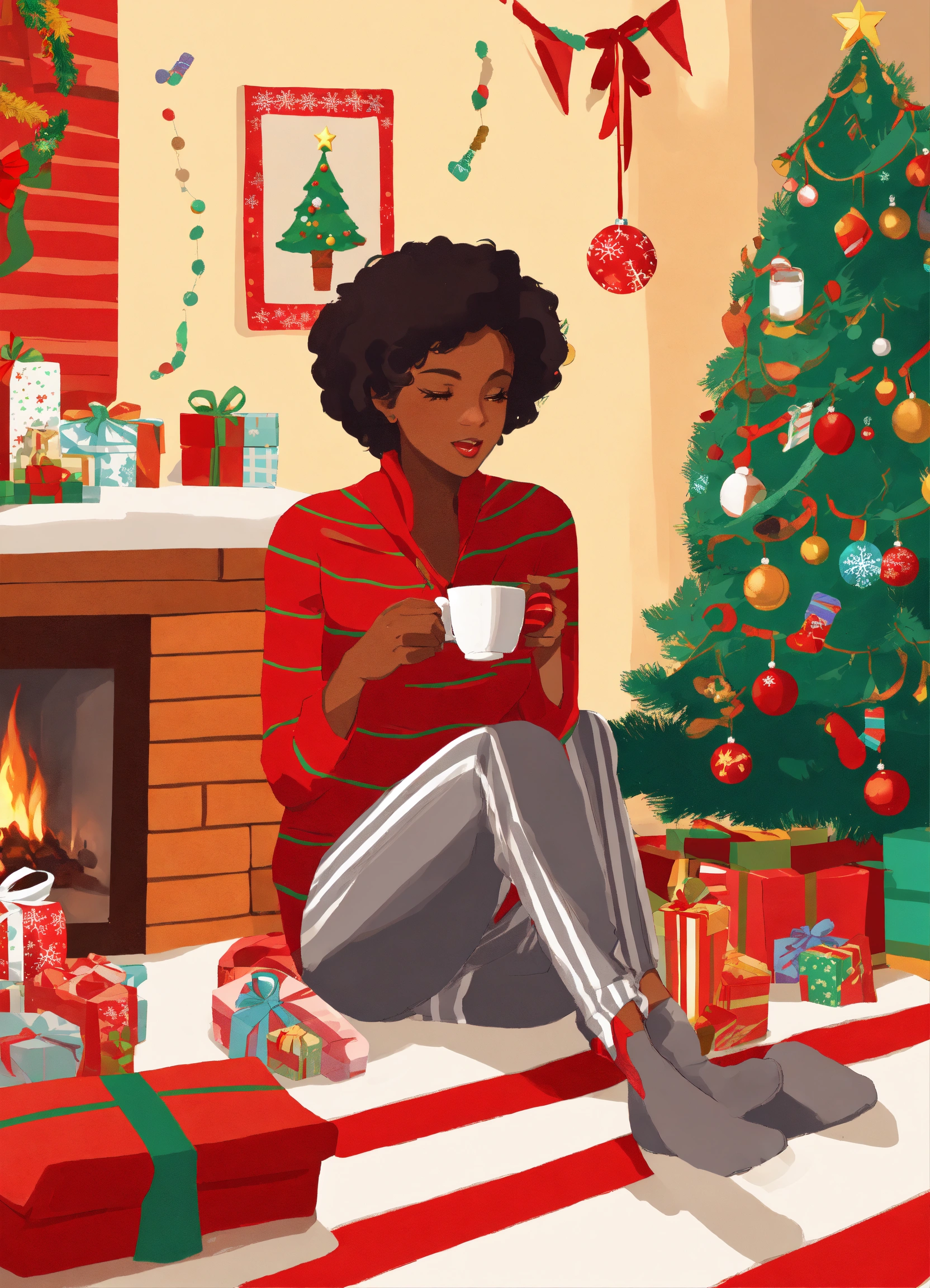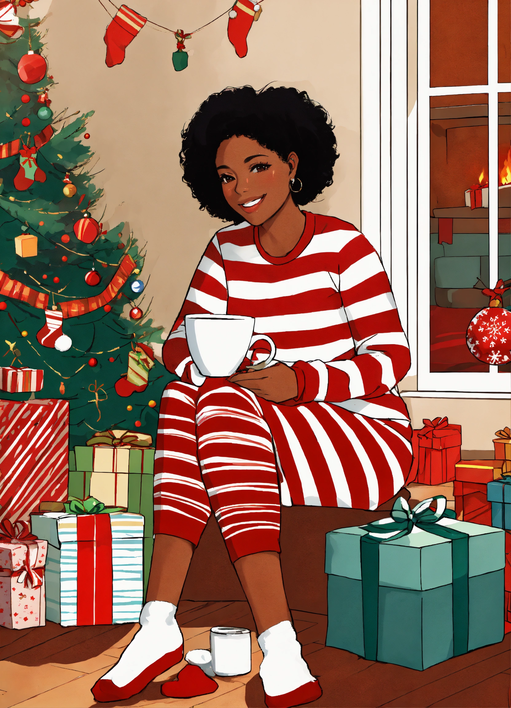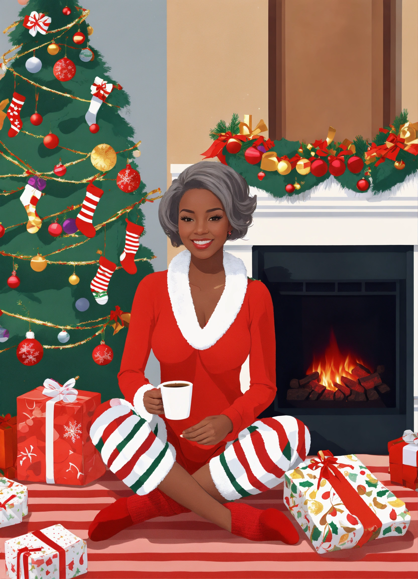 Illustrate a black female, brown skin, short gray hair, she is dressed in white and red pajamas striped, red slipper socks, sitting on the living room floor, drinking a cup of coffee, surrounded by gifts, colorful rolls of christmas wrapping paper, tape, scissors, background showcases crackling fireplace, christmas stockings hanging from the fireplace, large beautifully decorated christmas tree