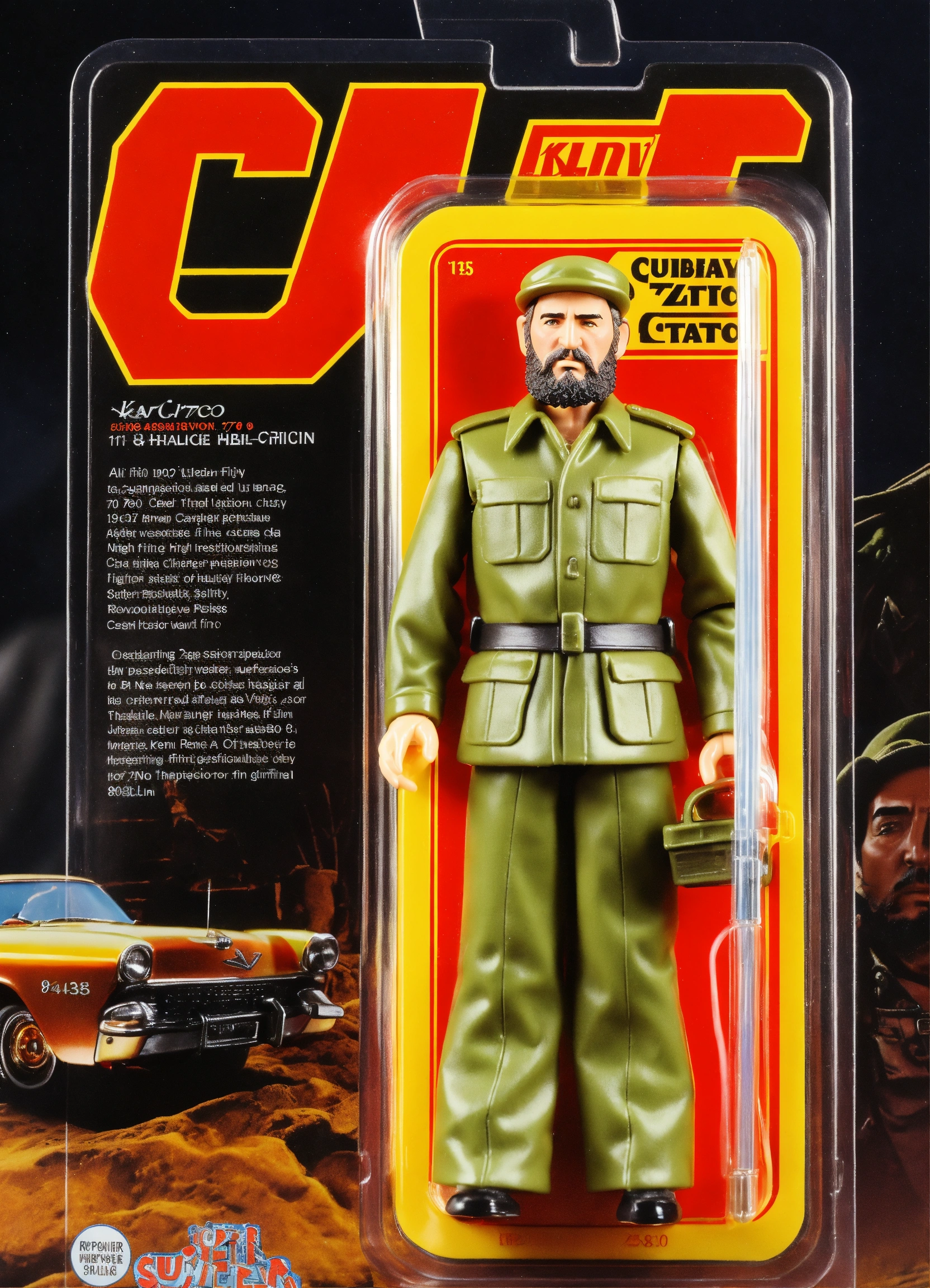 Design a kenner action figure toy or a super 7 reaction figure toy of the iconic revolutionary cuban leader fidel castro. the toy should embody the retro aesthetic reminiscent of classic '70s and '80s action figures made by kenner. incorporate fine details such as his iconic beard, cigar, olive military suit, staying true to the kenner action figures made in the 70's and 80's approach of high-quality craftsmanship and attention to detail. also with the classic packaging made by kenner company or super 7 reaction packaging.