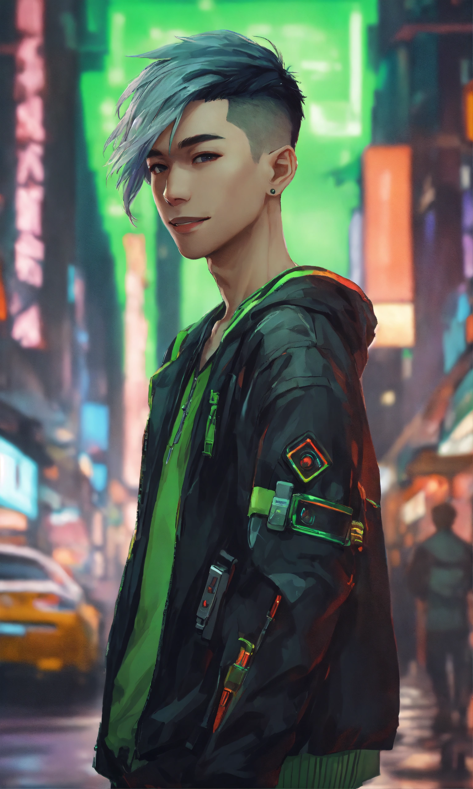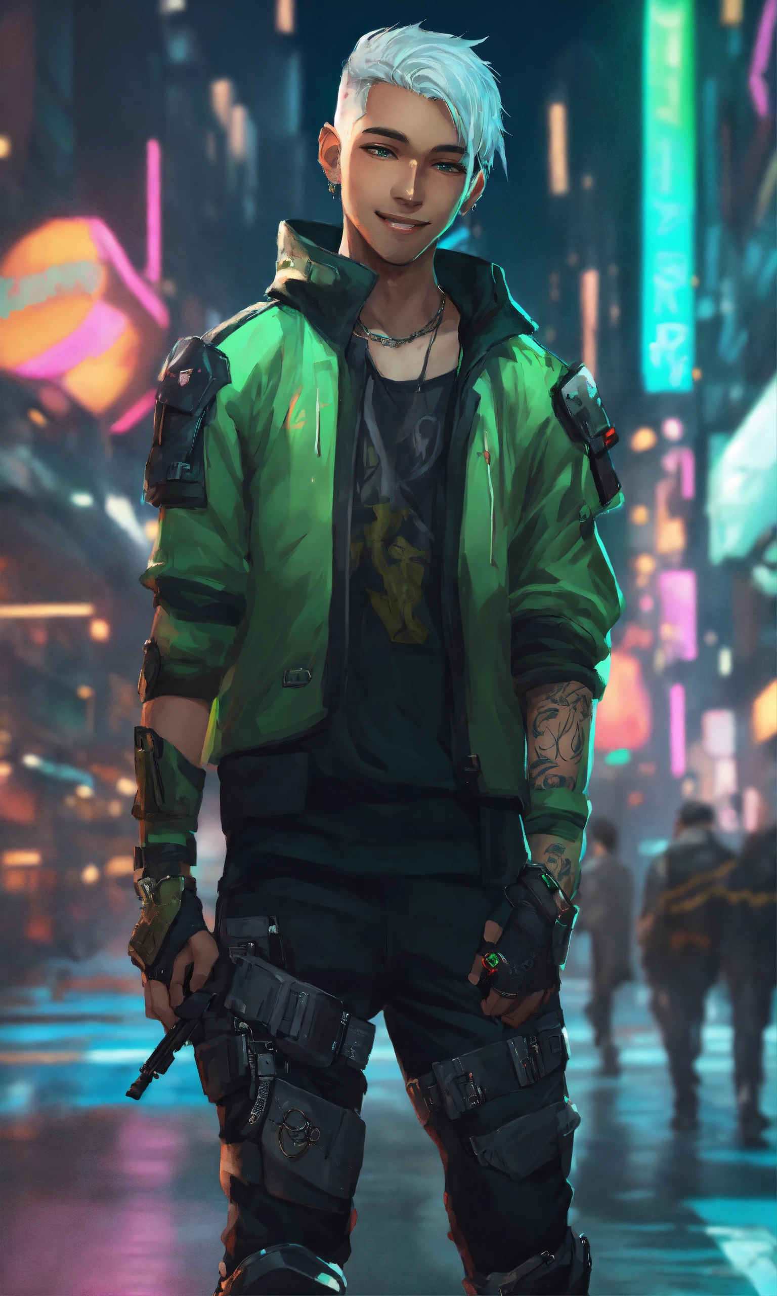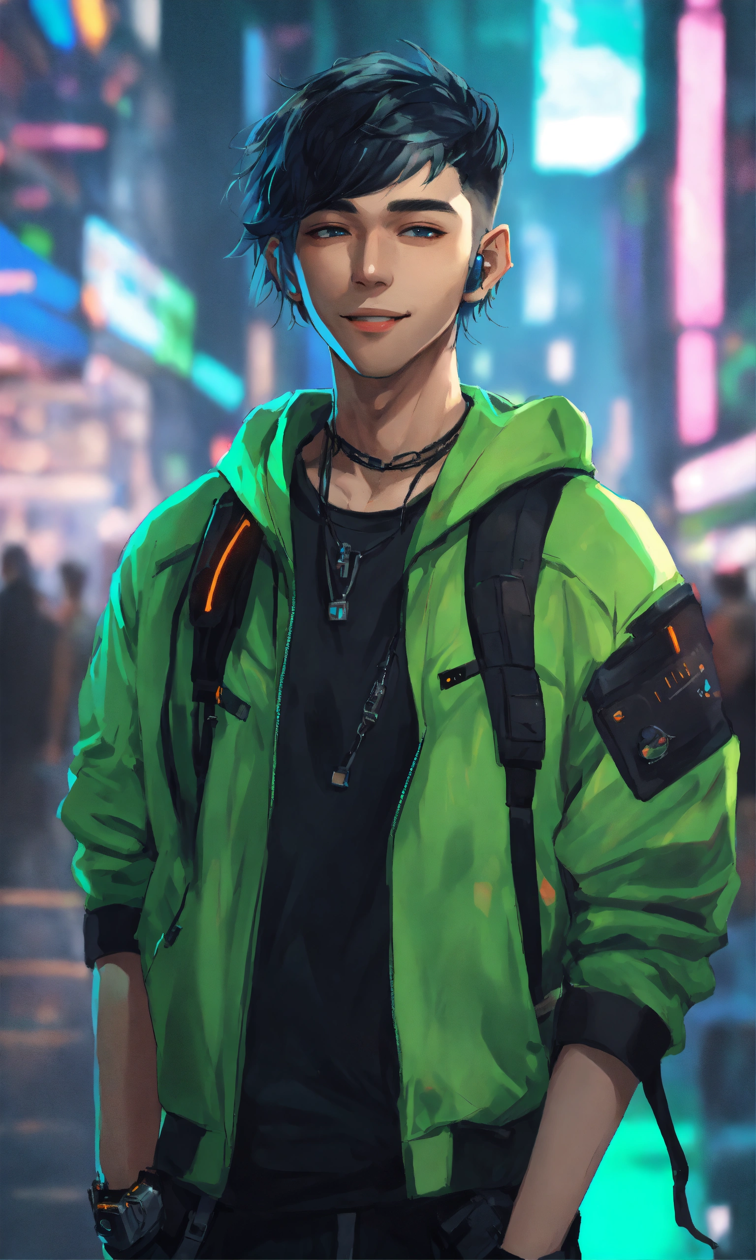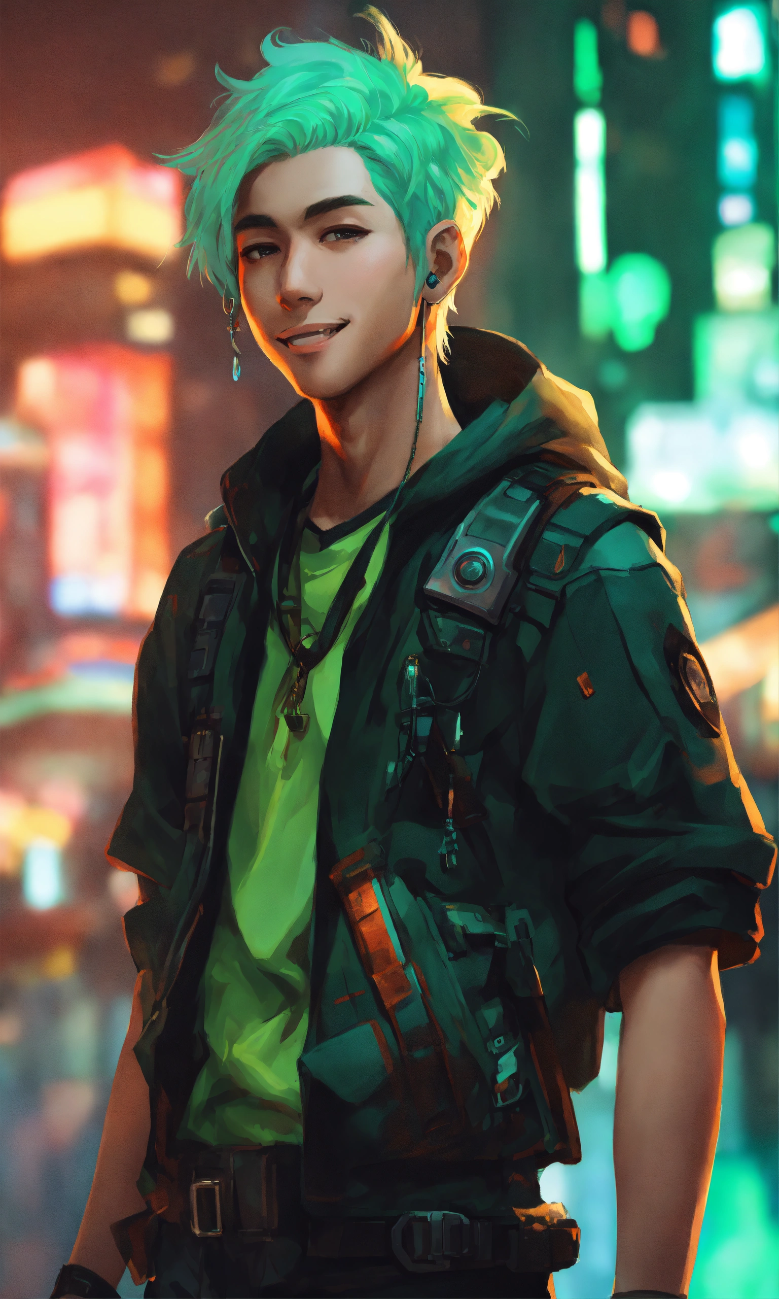 Valorant art style, highly detailed portrait, medium shot, a cute eurasian boy 20 year old soft green shoulder-length hair, smiling, elf, wearing cyberpunk black skin tight street style, cyberpunk city