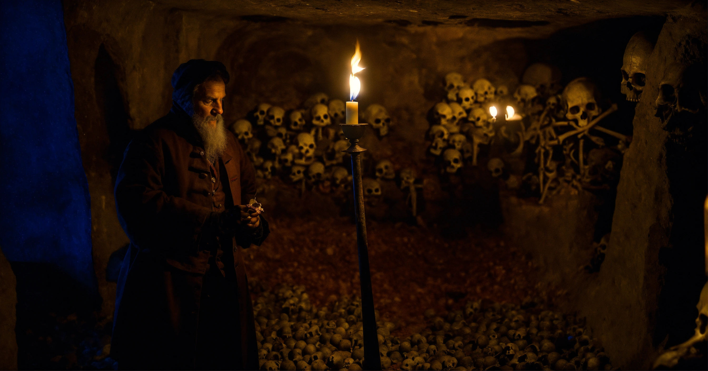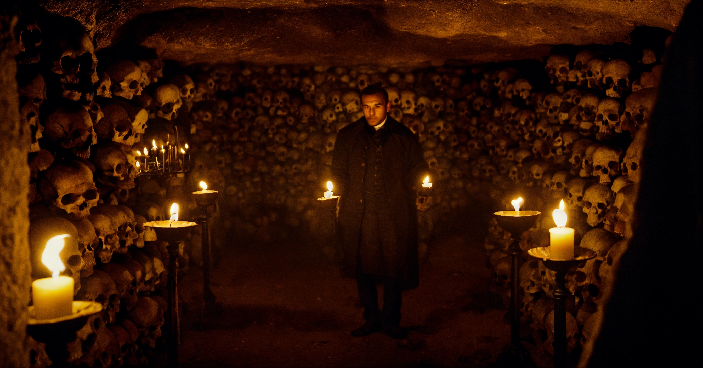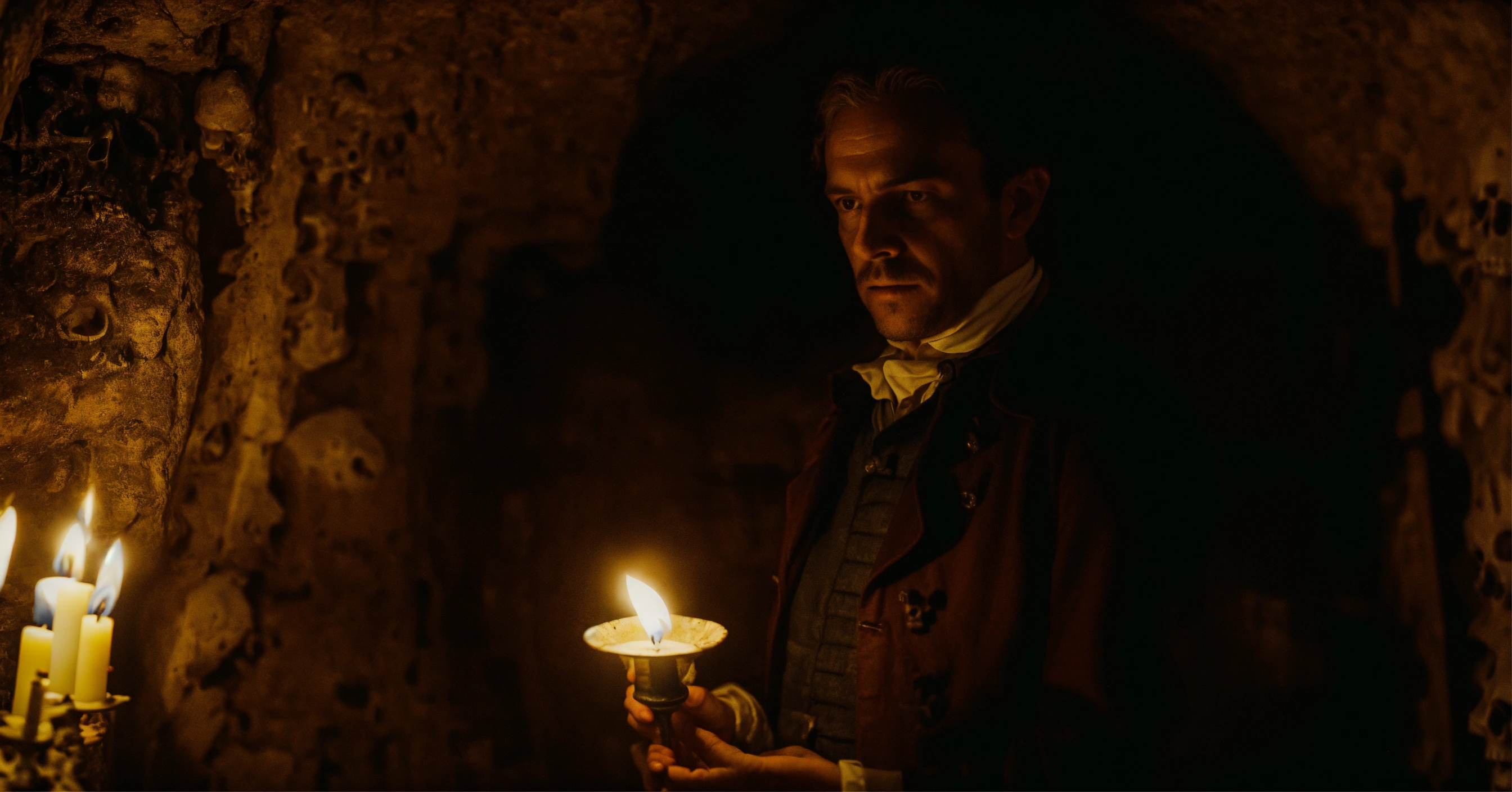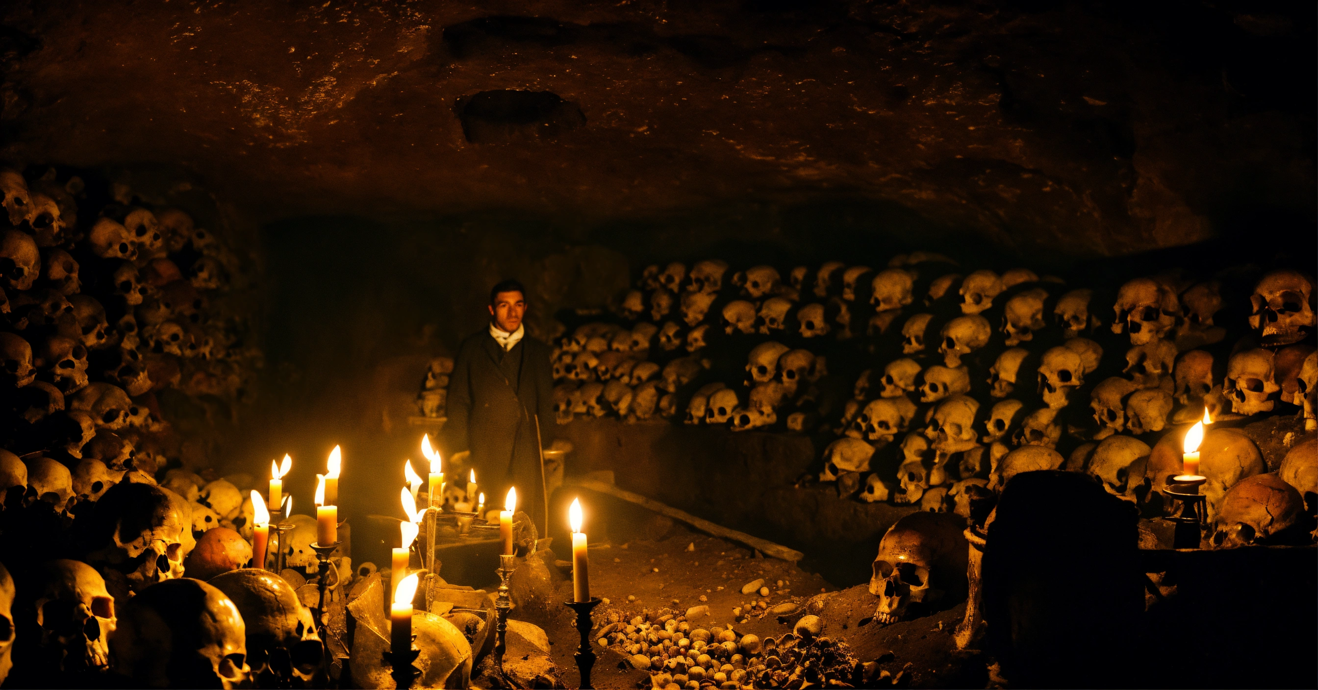 A very realistic, photographic quality picture of inside the dark tunnels of the paris catacombs, with a man from the 1700s holding a single lit candle in the picture, with lots of skulls and bones and a really scary atmosphere
