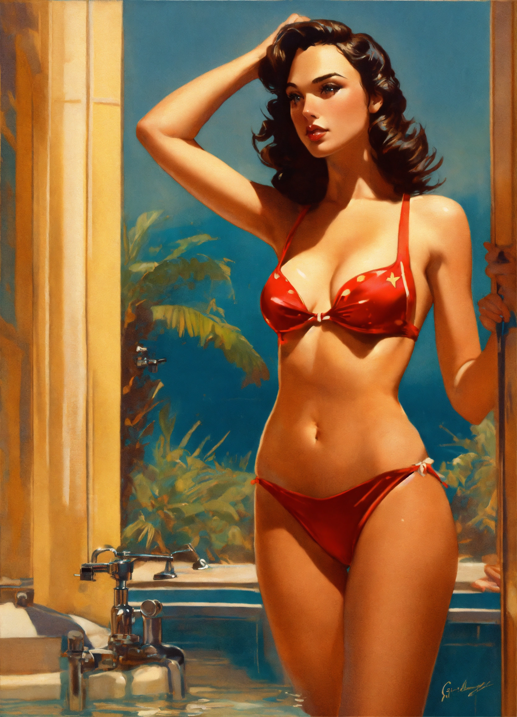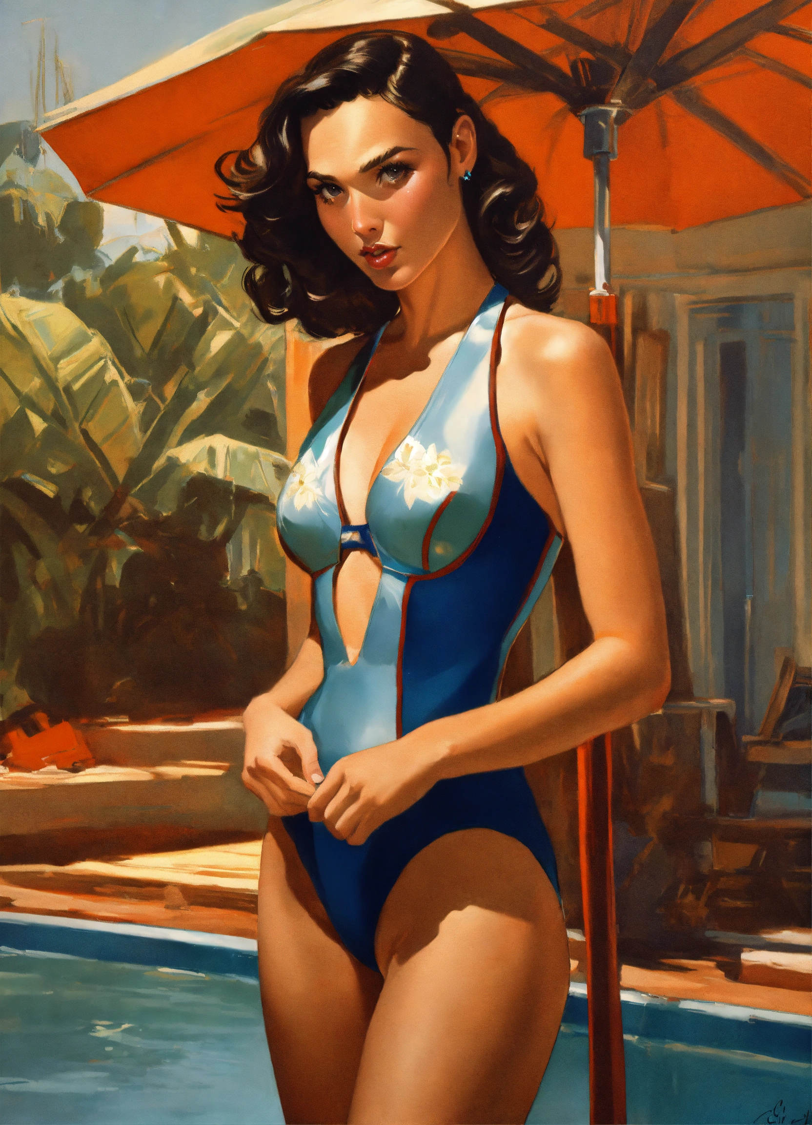 Beautiful attractive, gorgeous, woman, gal gadot bathing suit, gil elvgren, syd mead, medium, high detail