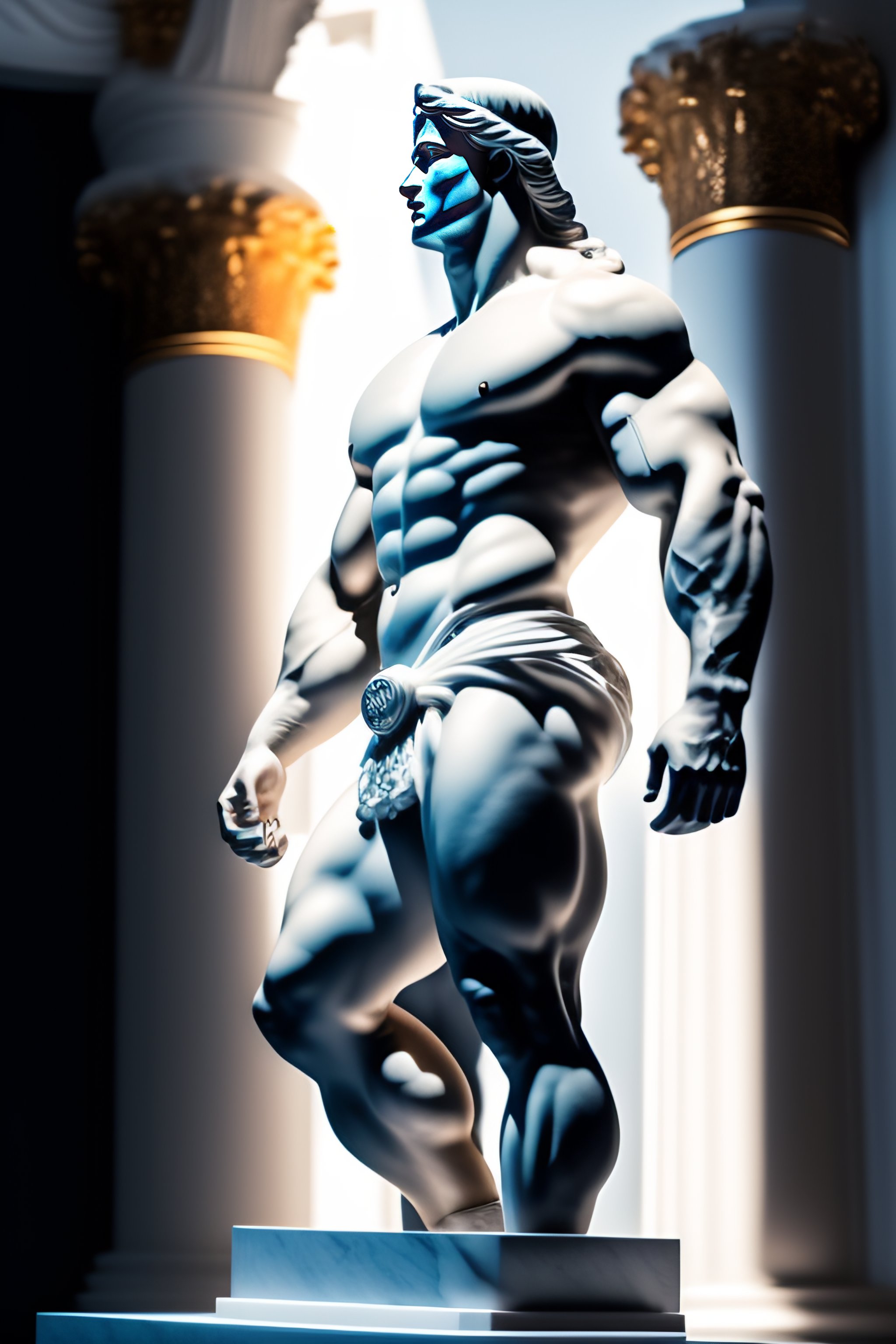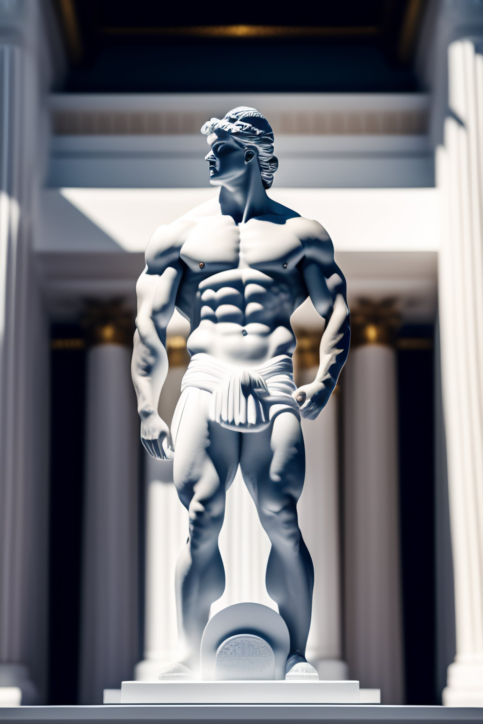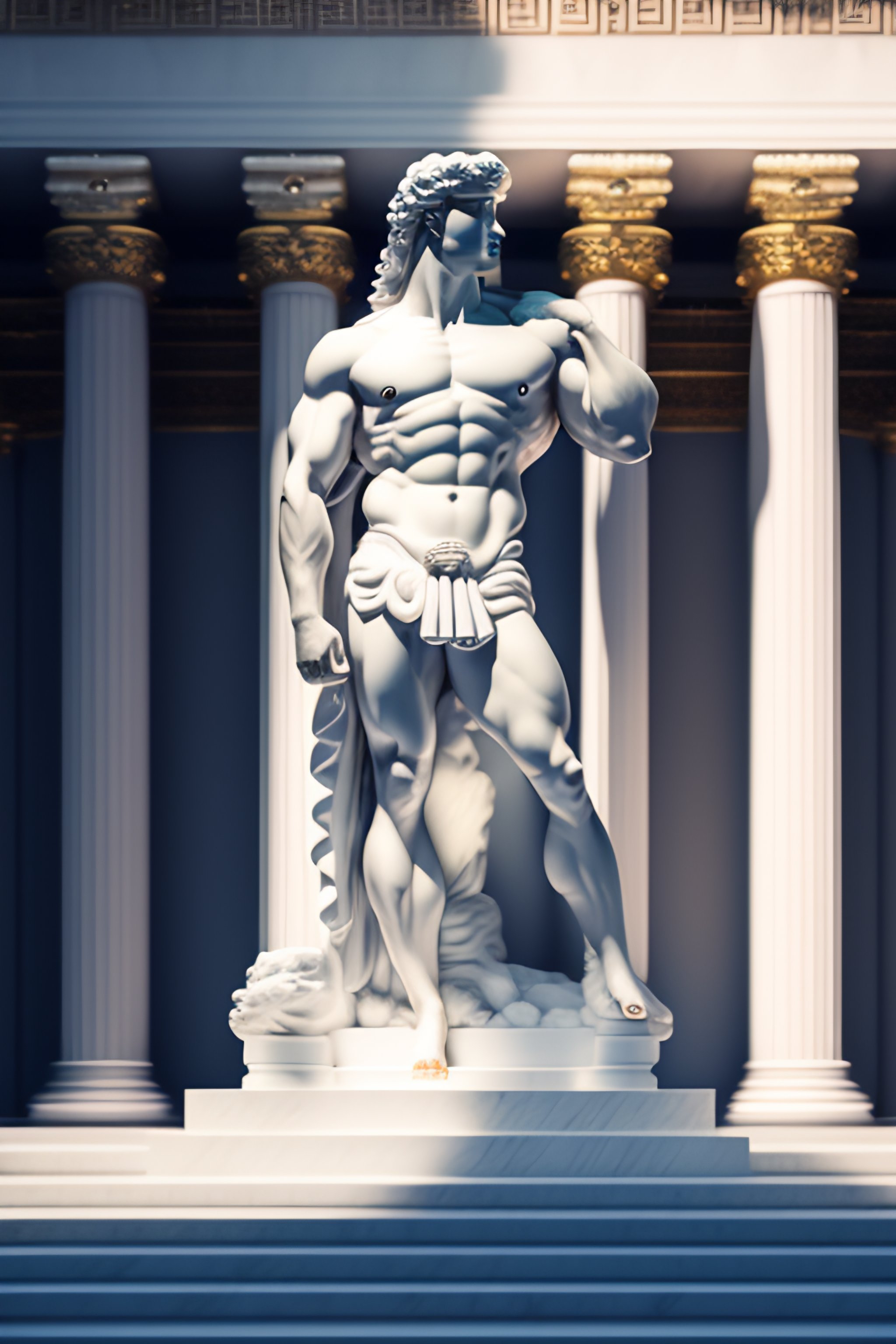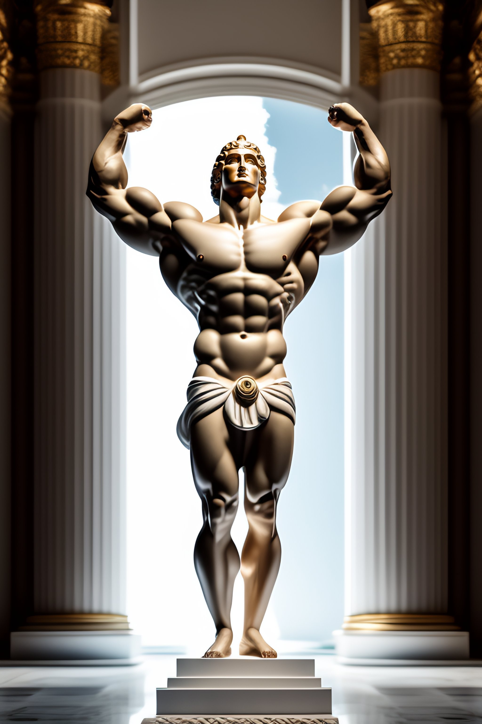 Muscular greek statue in a white temple with millions of dollars in front
