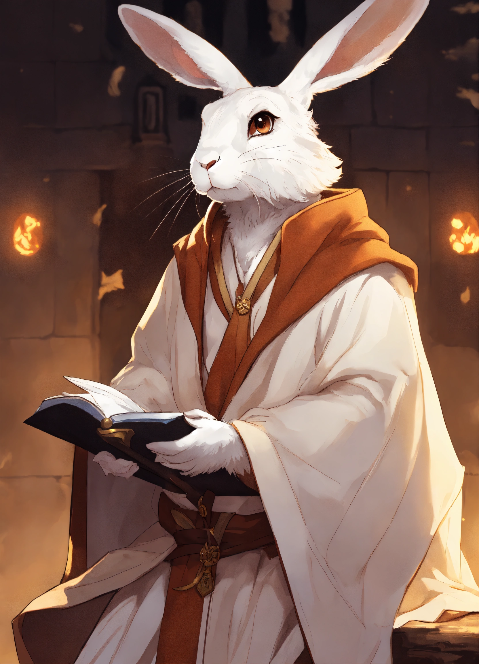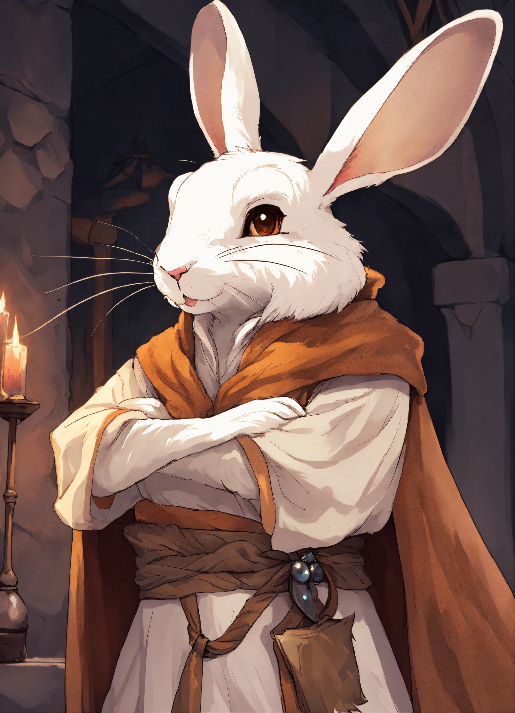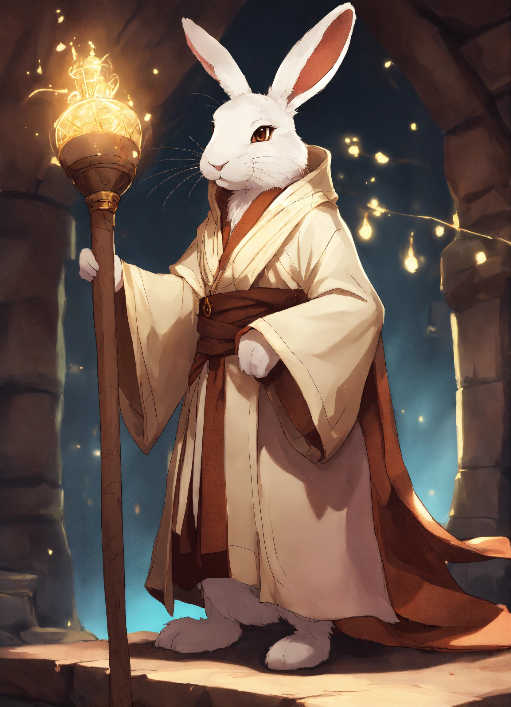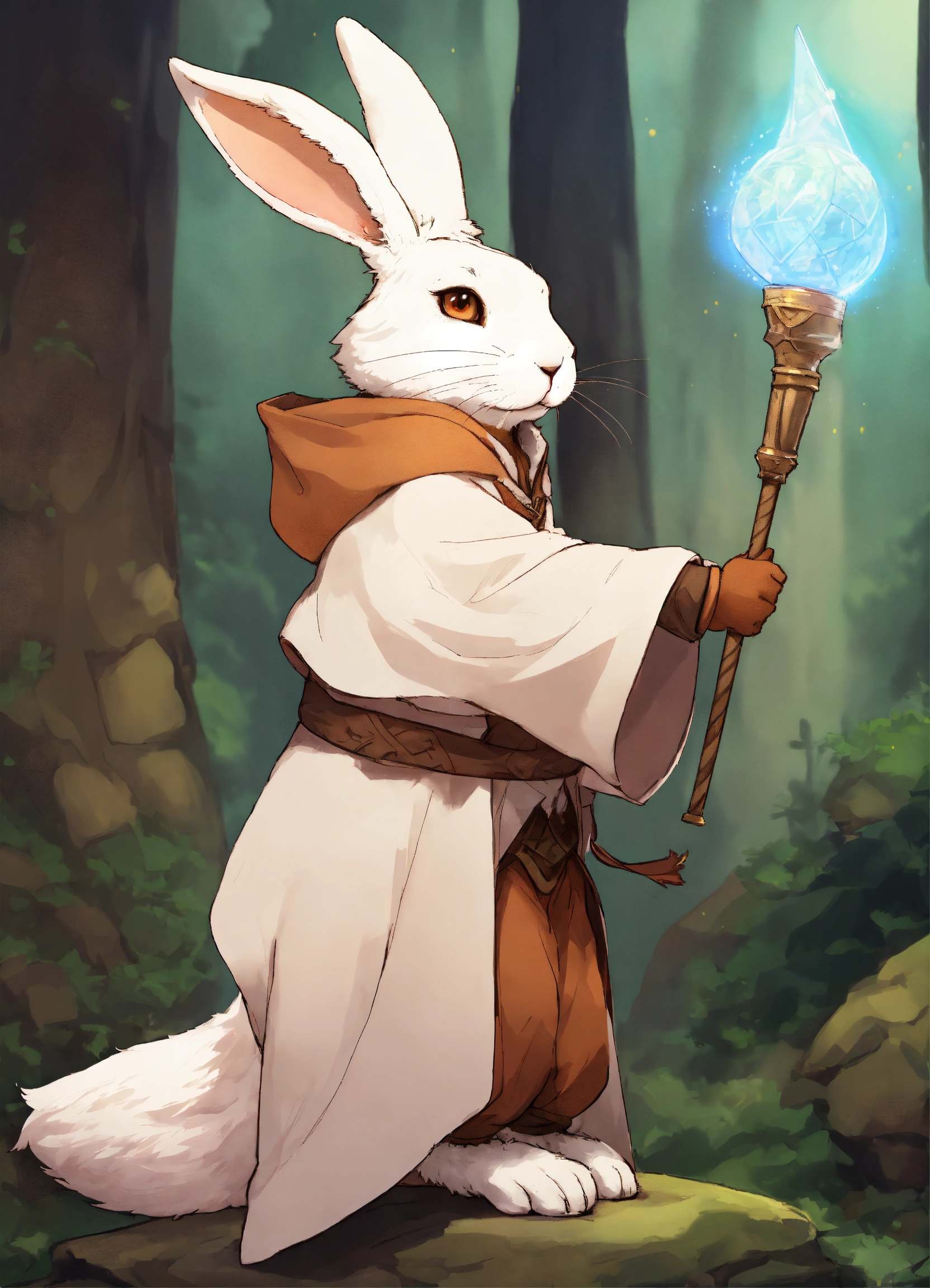 Beautiful art, hare wizard, rabbit wizard, white robe, brown fur, cute, anthropomorphic, tall, adult size, furry, hare, dungeons and dragons, good hands, great pose, skinny, profile view, side view, anime artstyle