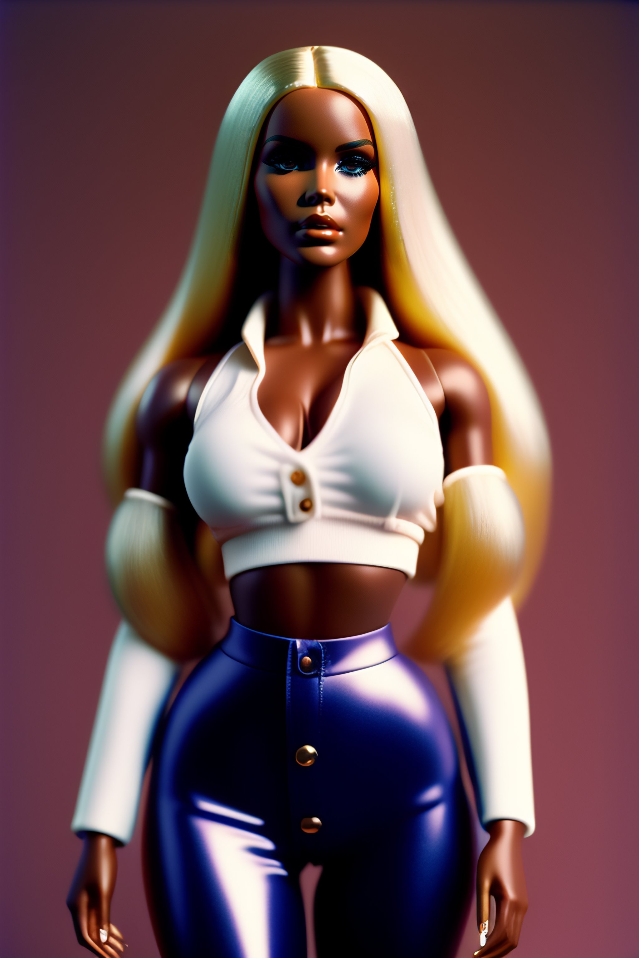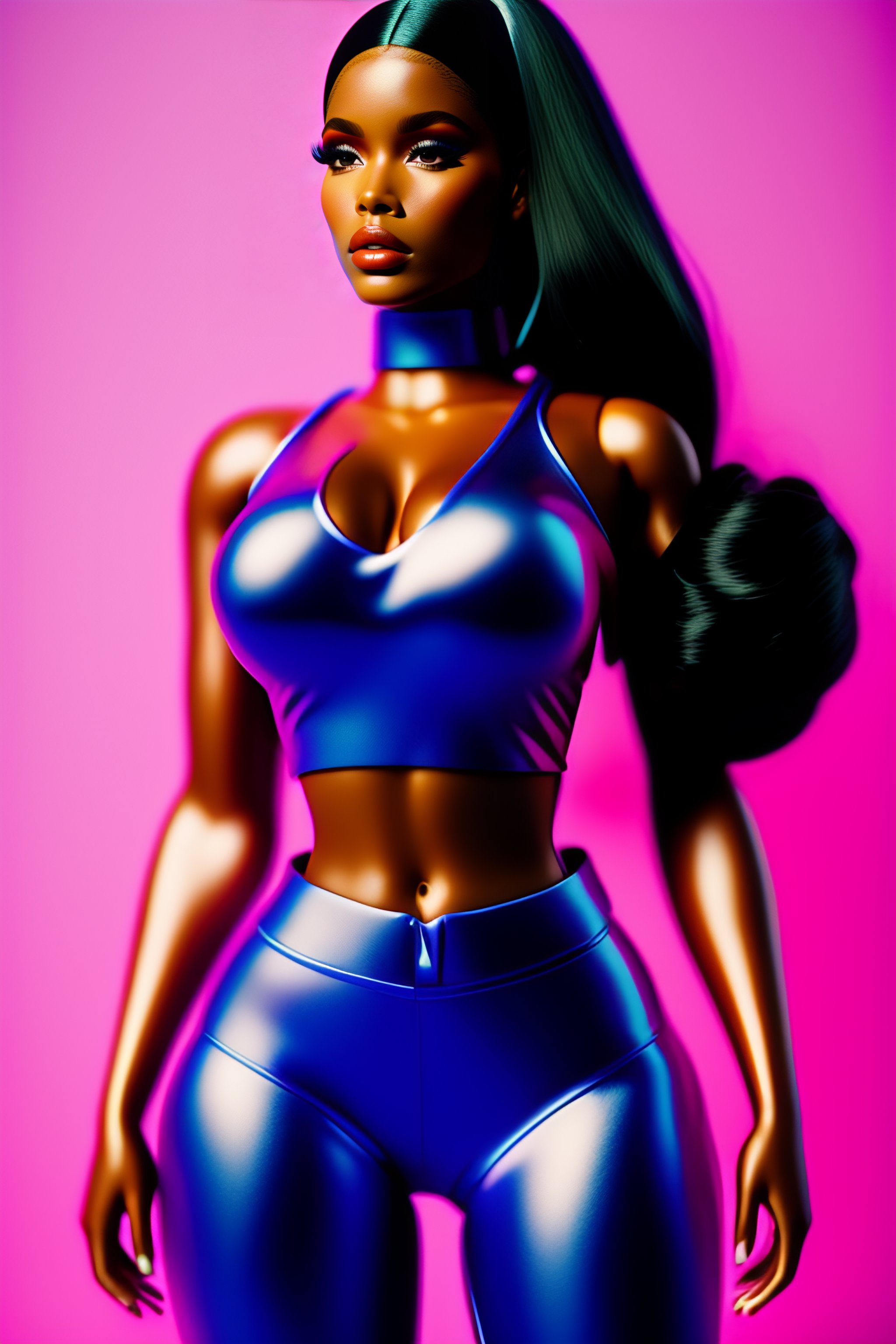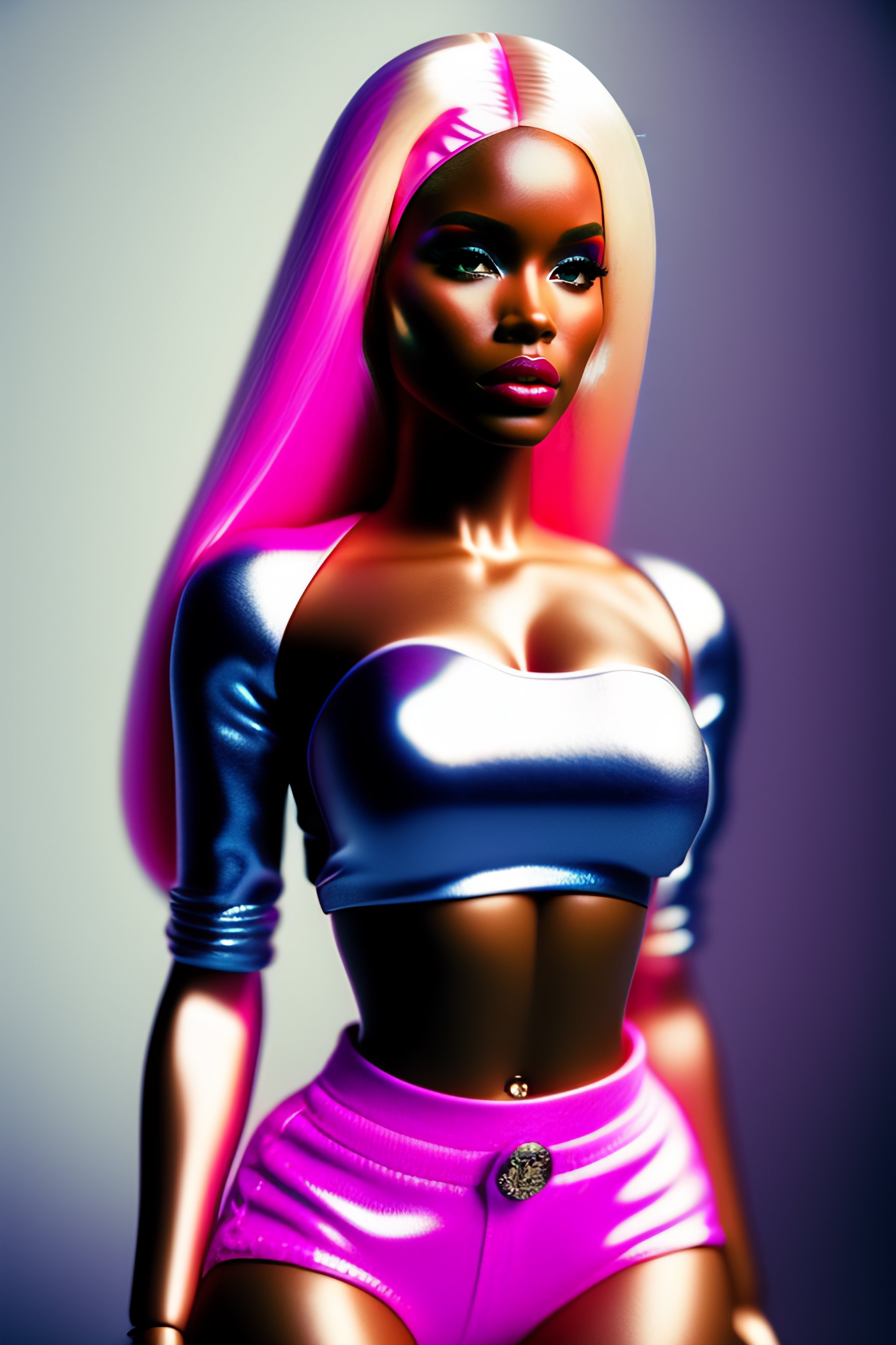 Nicki monaj tight shiny smooth perfect plastic skin, barbie doll lookalike, dream girl, science fiction, low waist jeans, 2002 product photography, portra 400