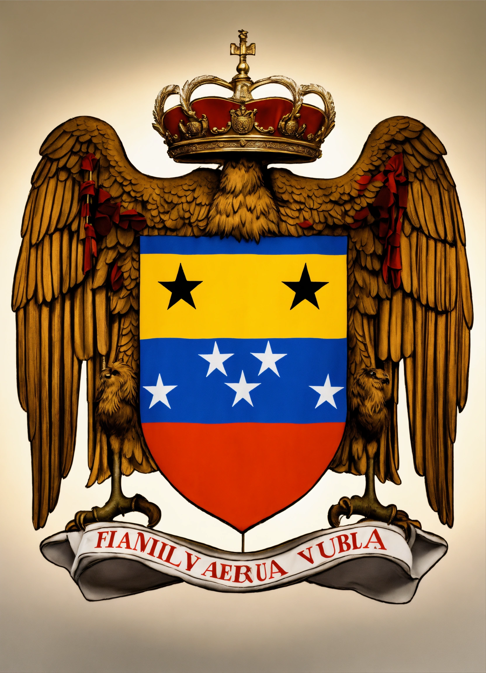 Prompt hyperrealistic family "coat of arms" featuring the colors of the venezuelan and cuban flags against a white background