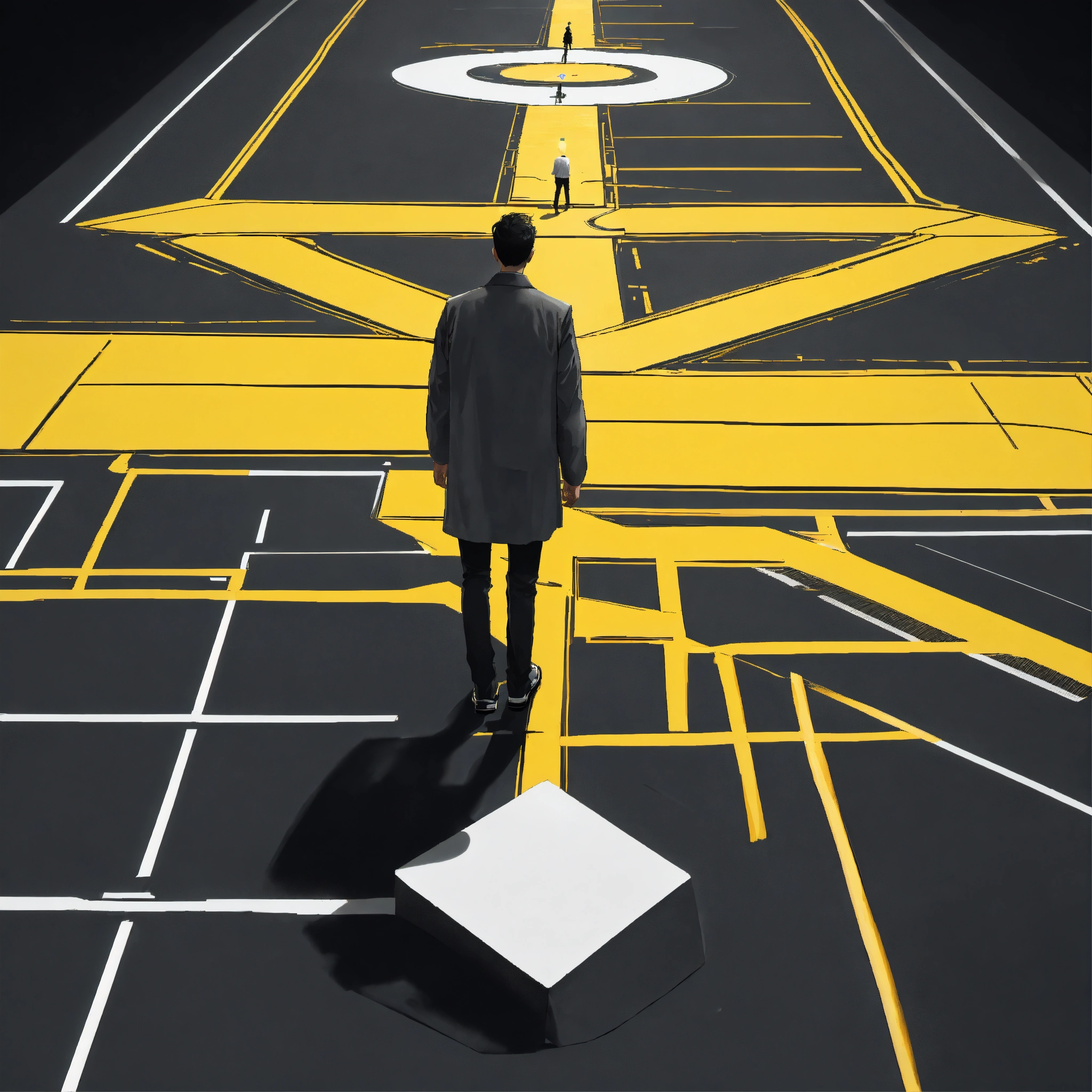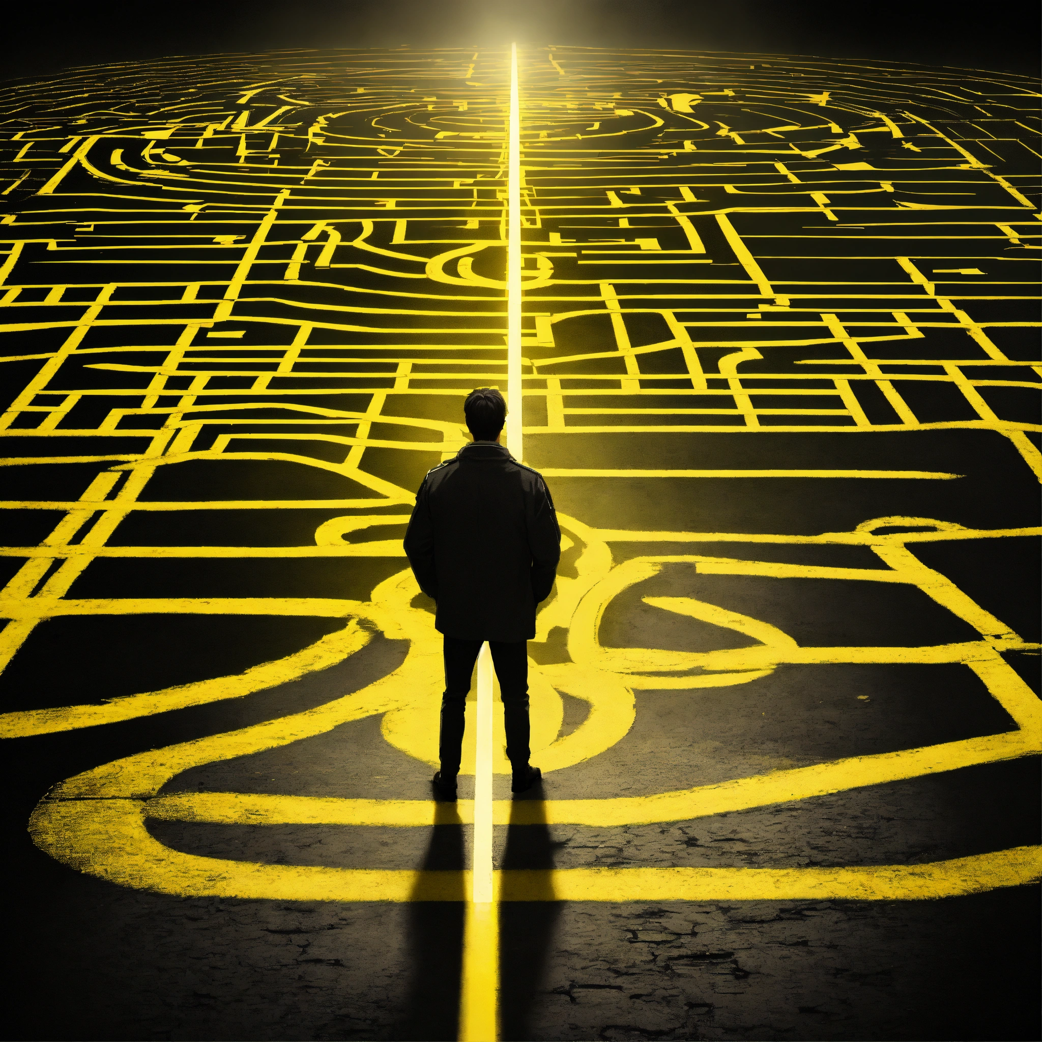 A man at a crossroads, the road splits into 3 paths, 3 trajectories, the character stands and chooses, black and white color, yellow light