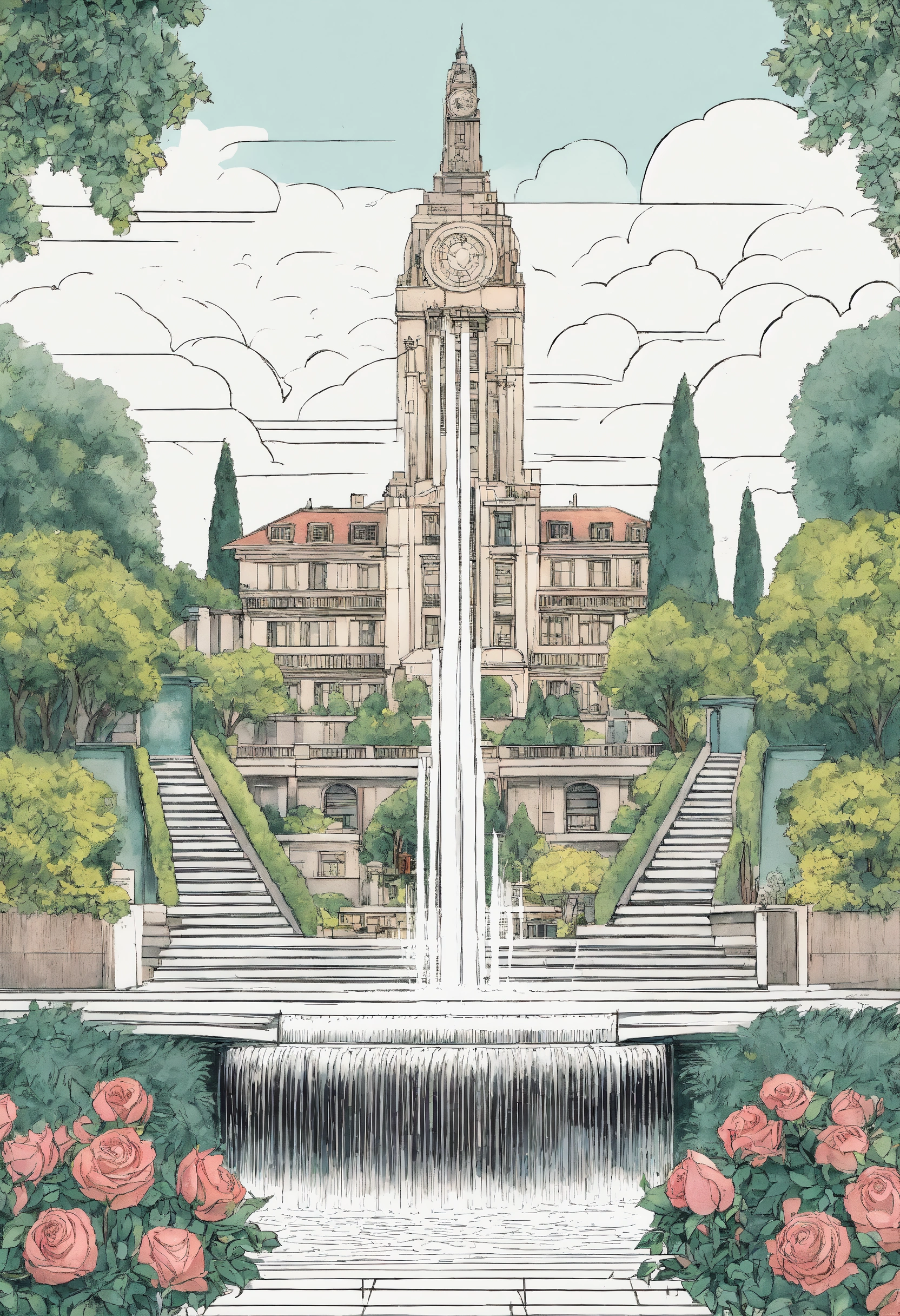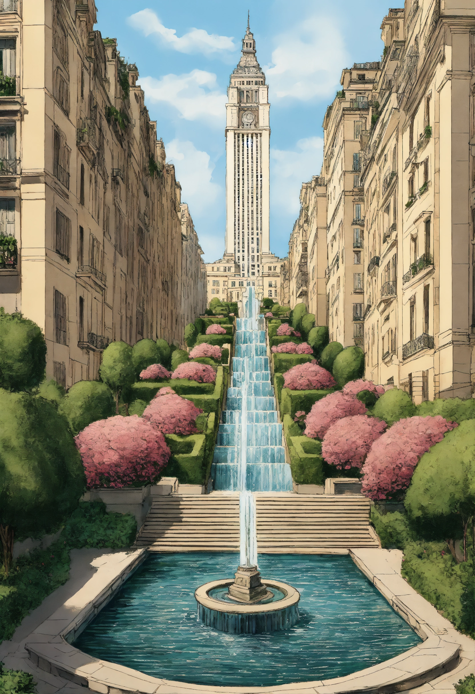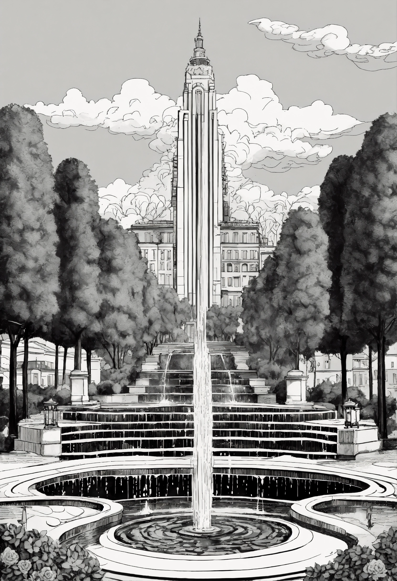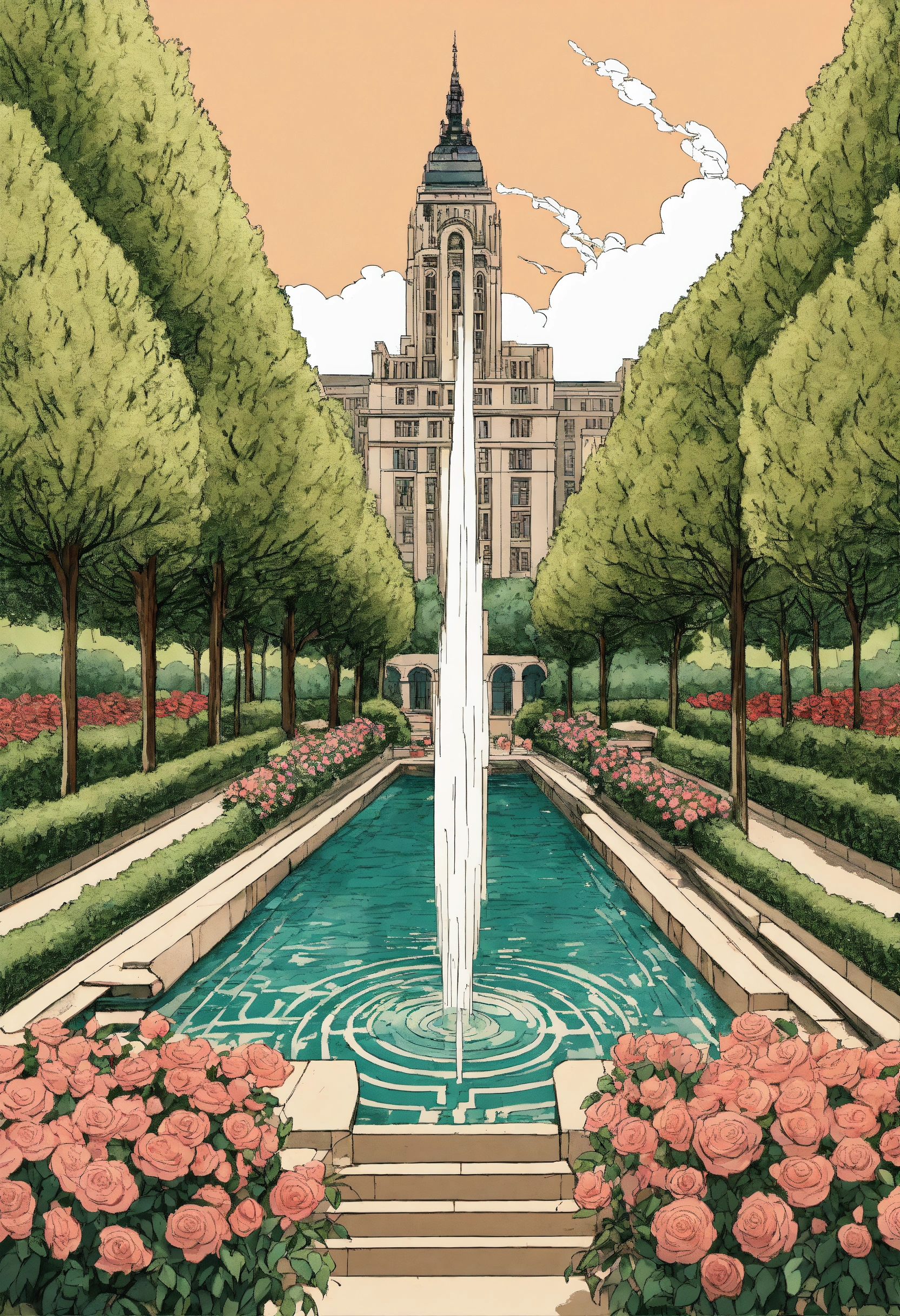 Water falls, geneva water fountain jet d’eau, cypress trees tall, roses, art deco maze hedges, pool canal, floating flying mid air ornade sculpted stone masonry haussmannian parisian style empire state building with french roof tops, symmetrical symmetry steps staircase, hanging gardens, hand-drawn technical architecture ink illustration, palm trees tall, gothic pointy edges, spikes