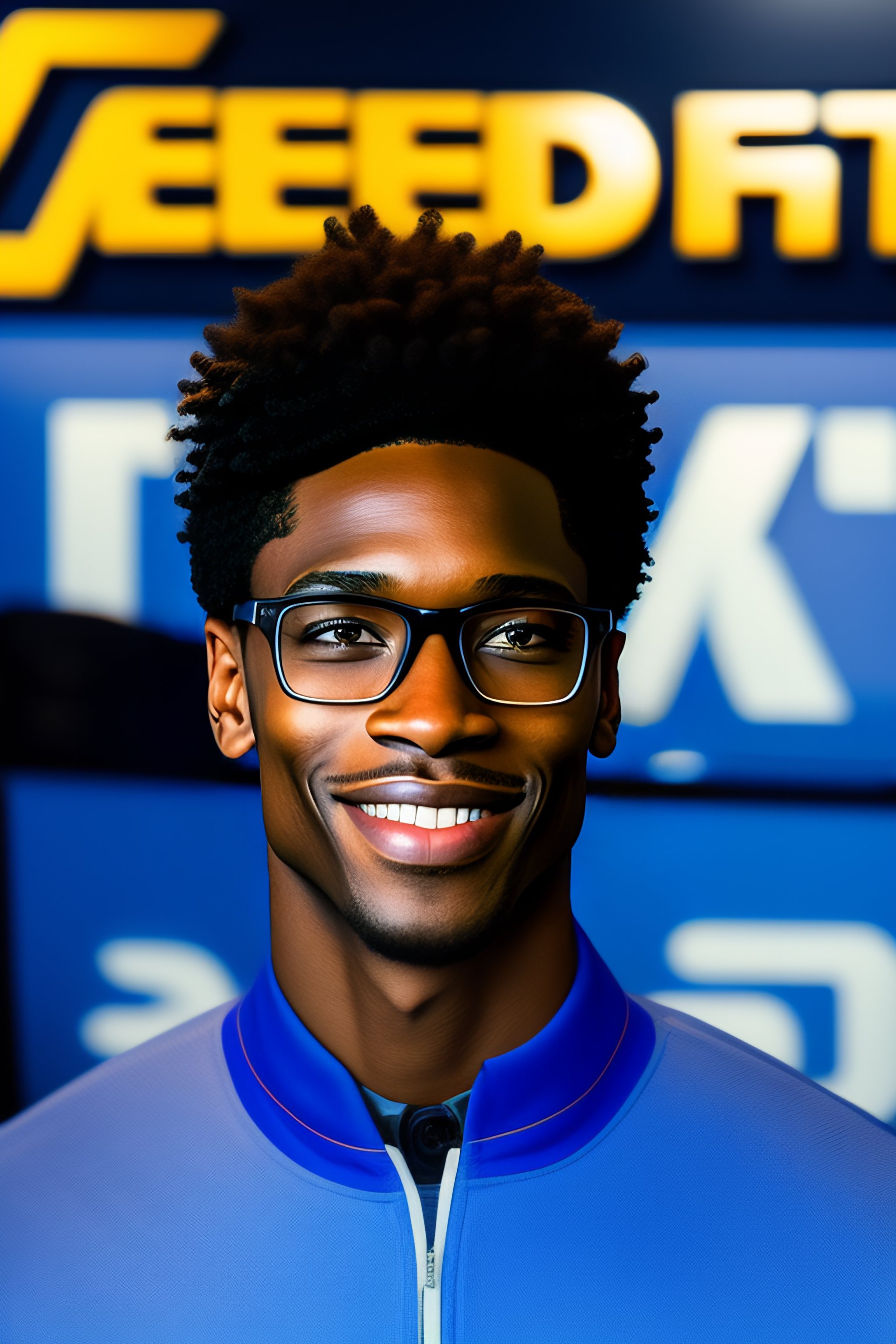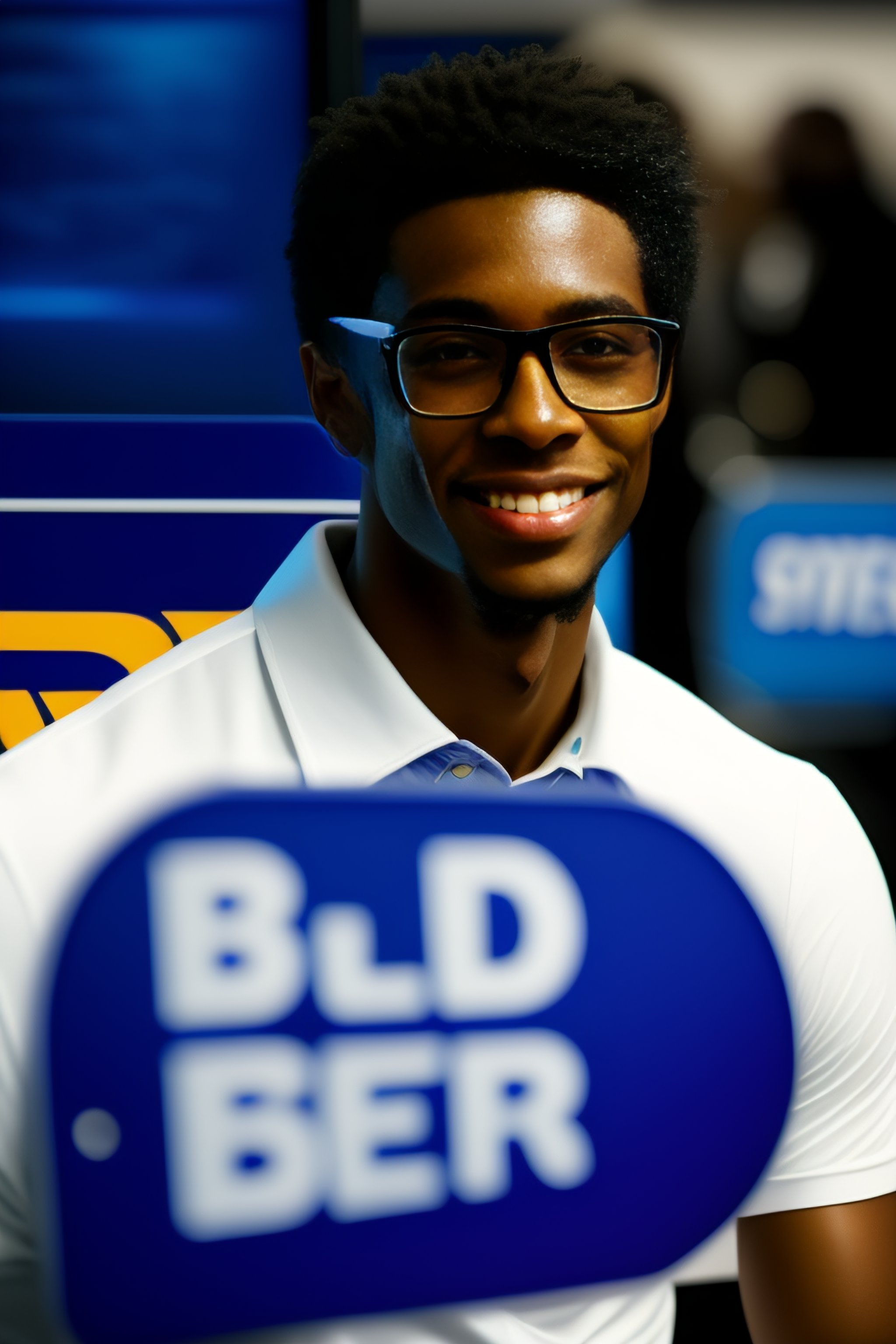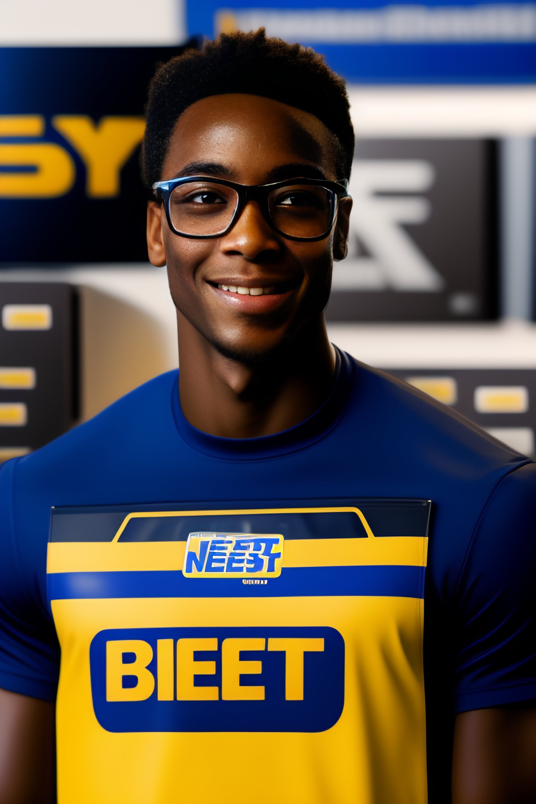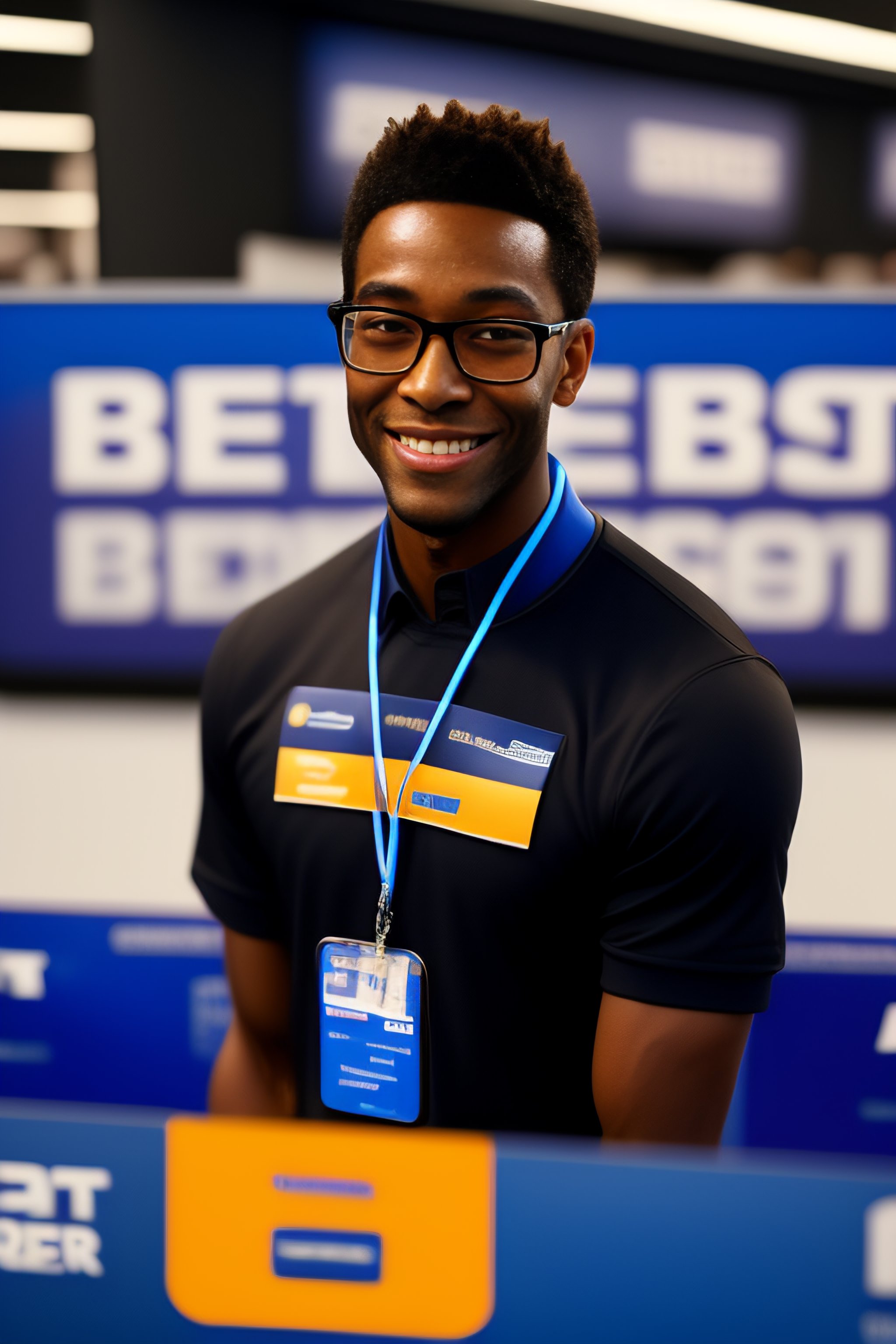 Portrait of a skinny black guy in glasses working at best buy nametag nerdy