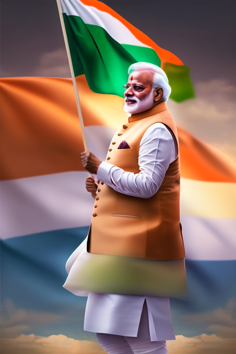 "capture the essence of pride and leadership by describing narendra modi holding the indian flag. emphasize his expression, the flag's vibrant colors against a backdrop of unity, and the symbolism this moment holds for india's present and future."