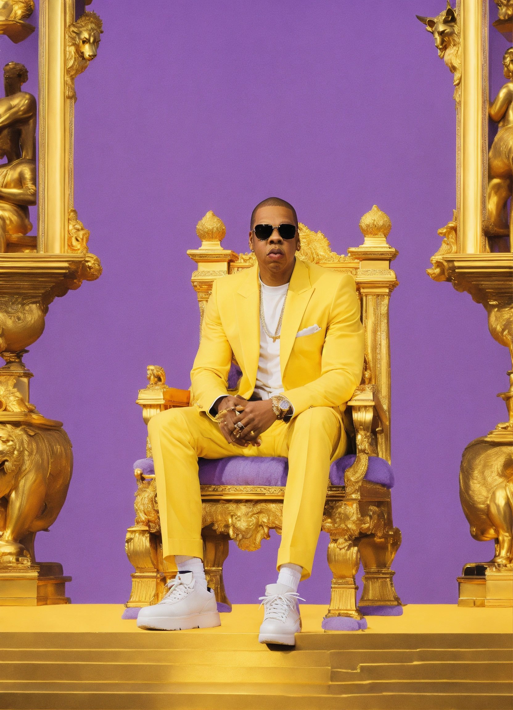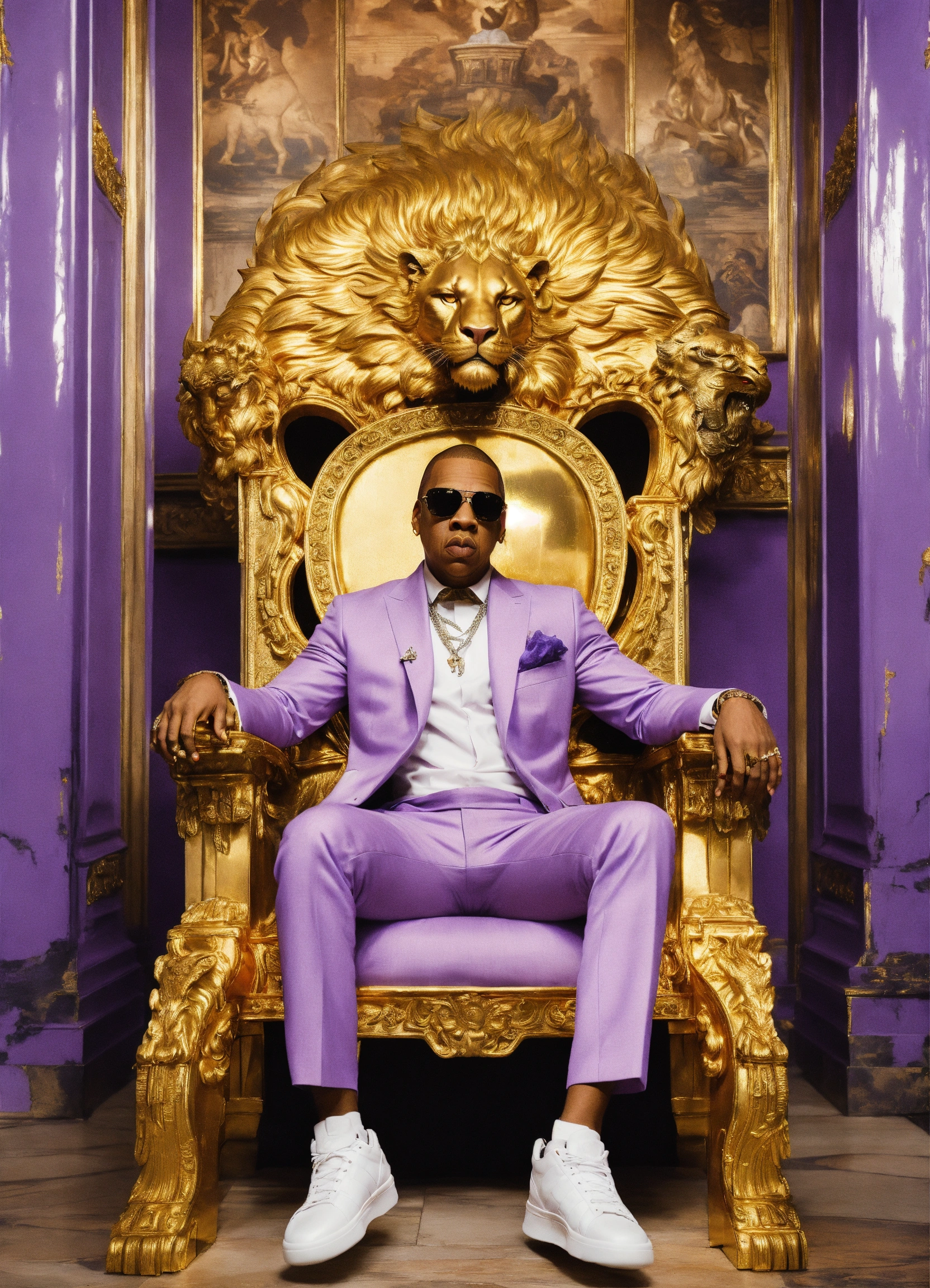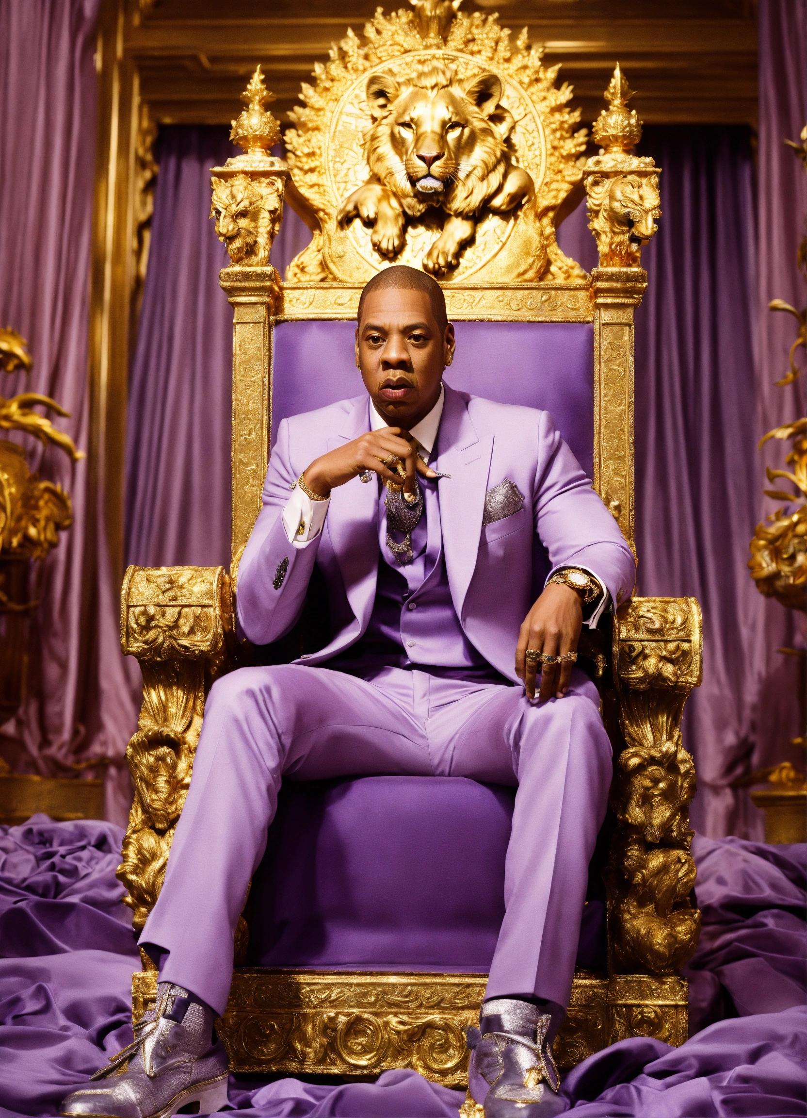 Add the face of rap artist jay-z, in a lavender suit, sitting on a golden throne, in a golden room, with ferocious silver lions flanking his sides.