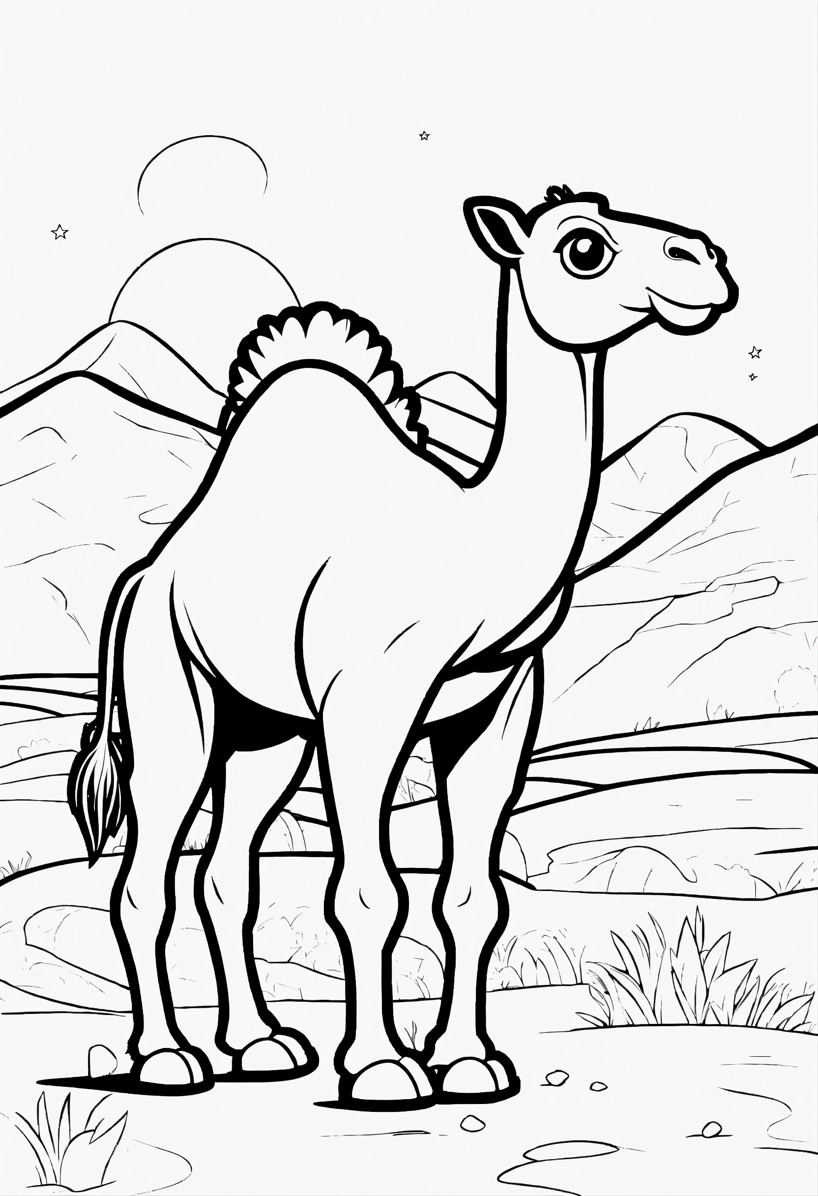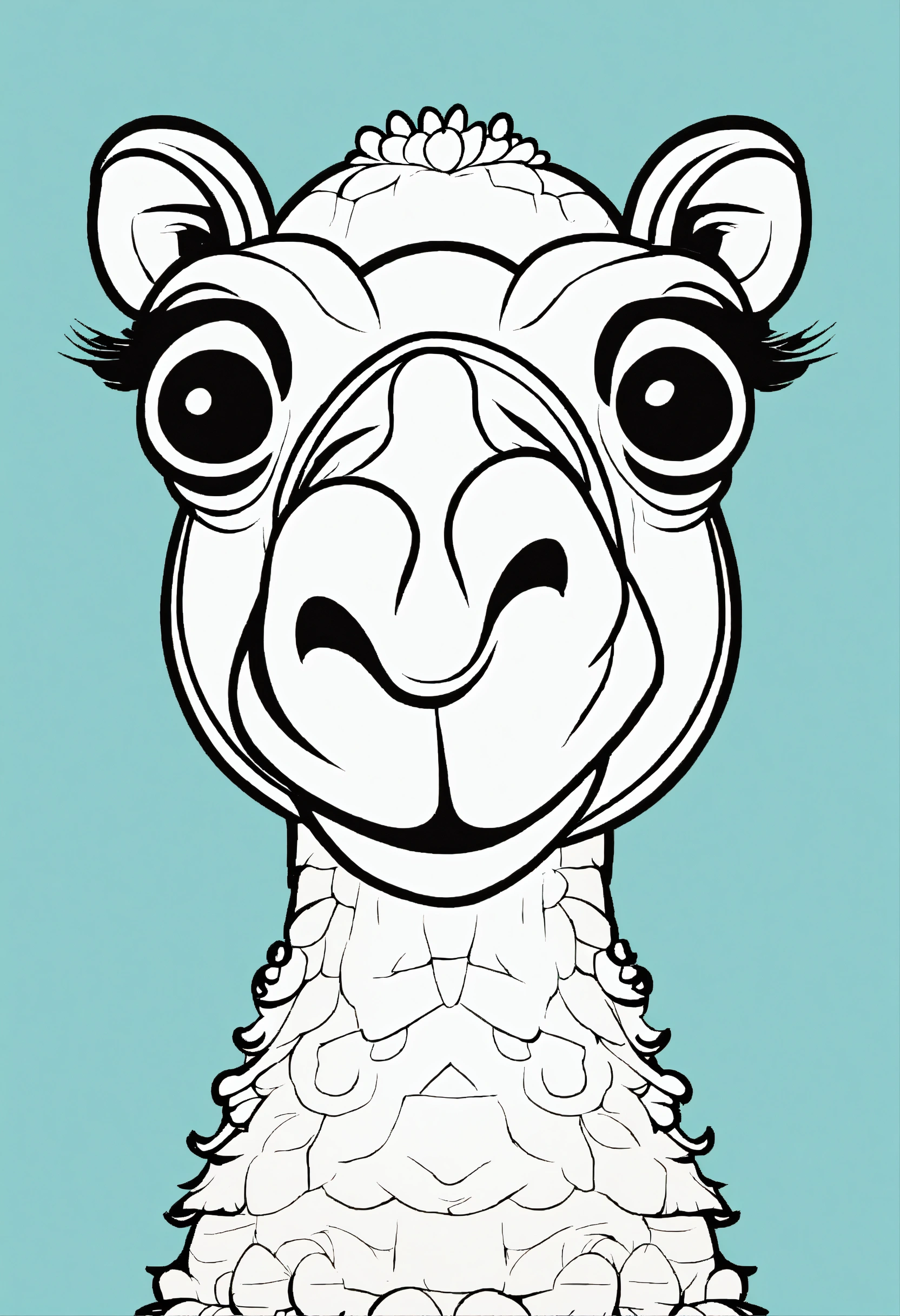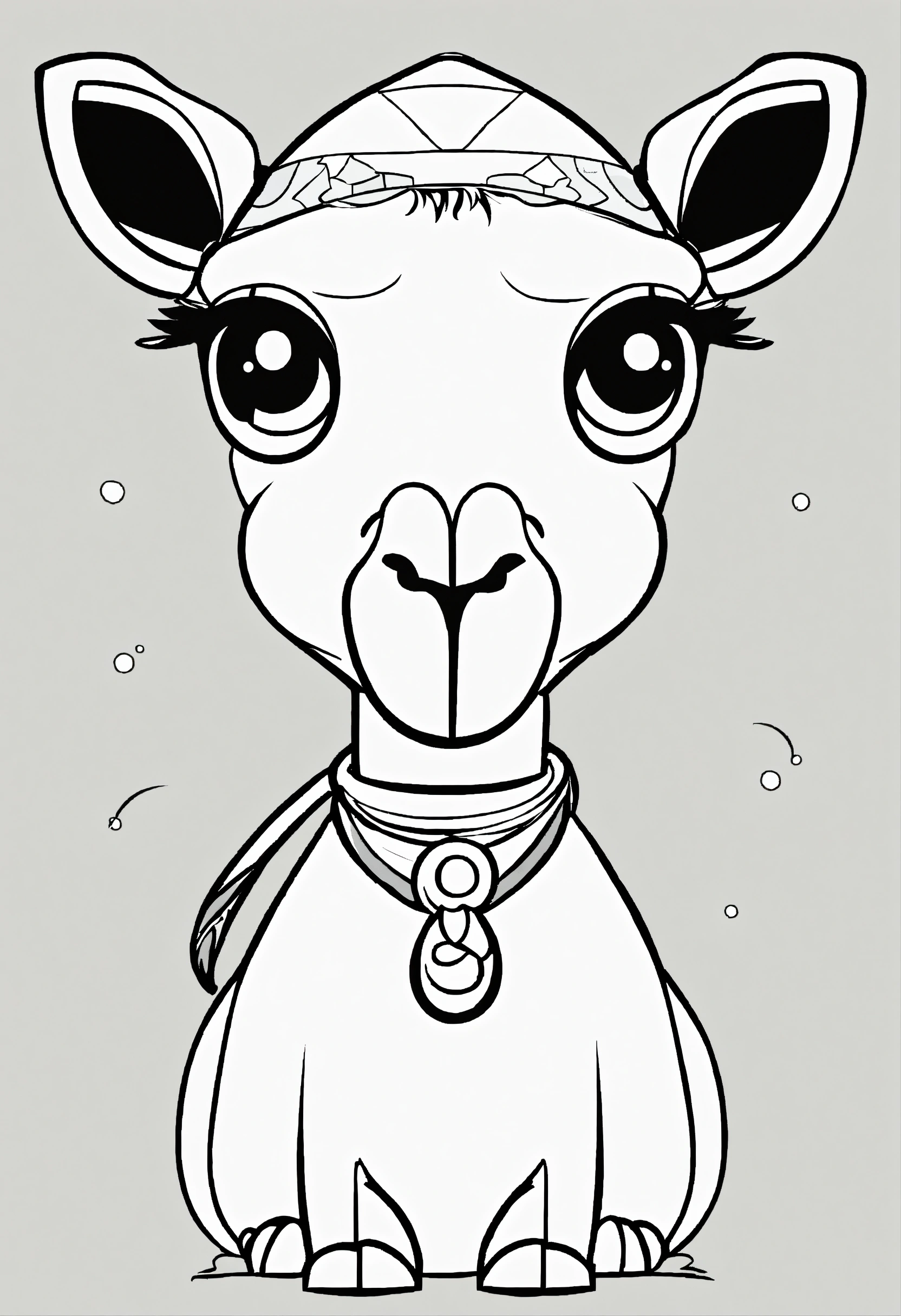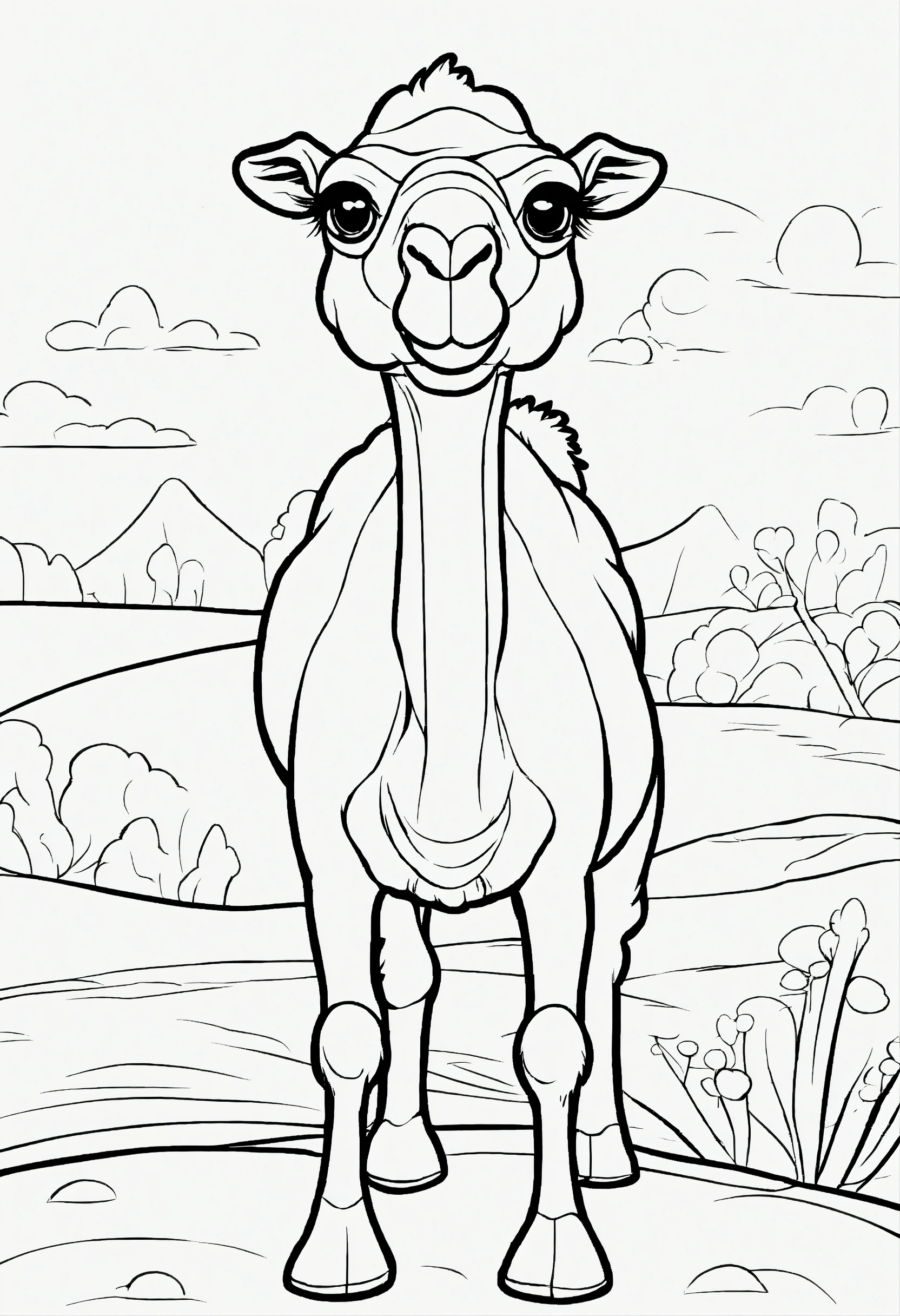 Cute camel, big cute eyes, pixar style, simple outline and shapes, coloring page black and white comic book flat vector, white background
