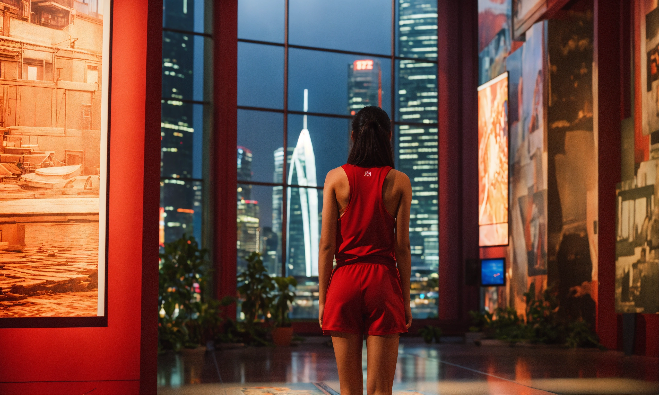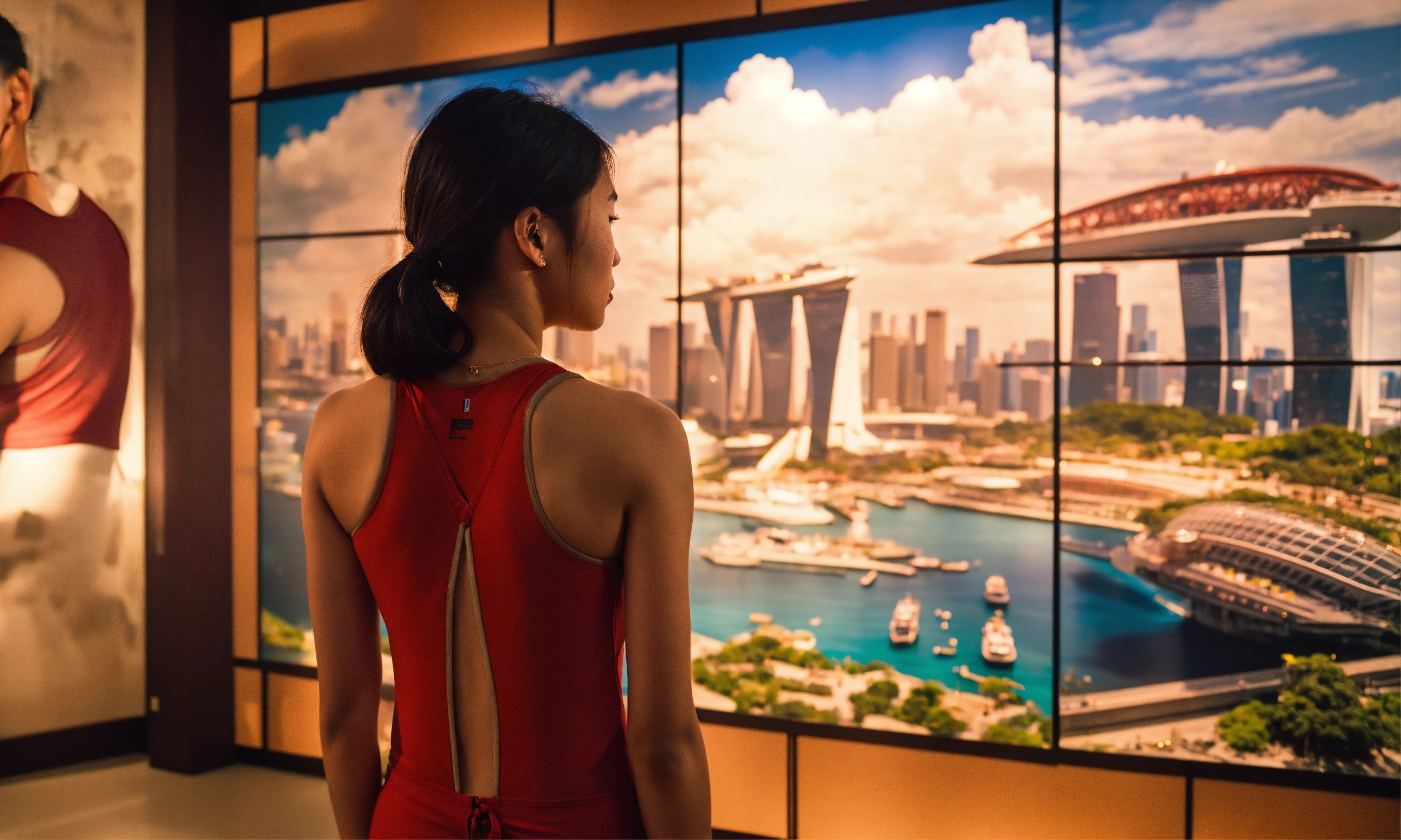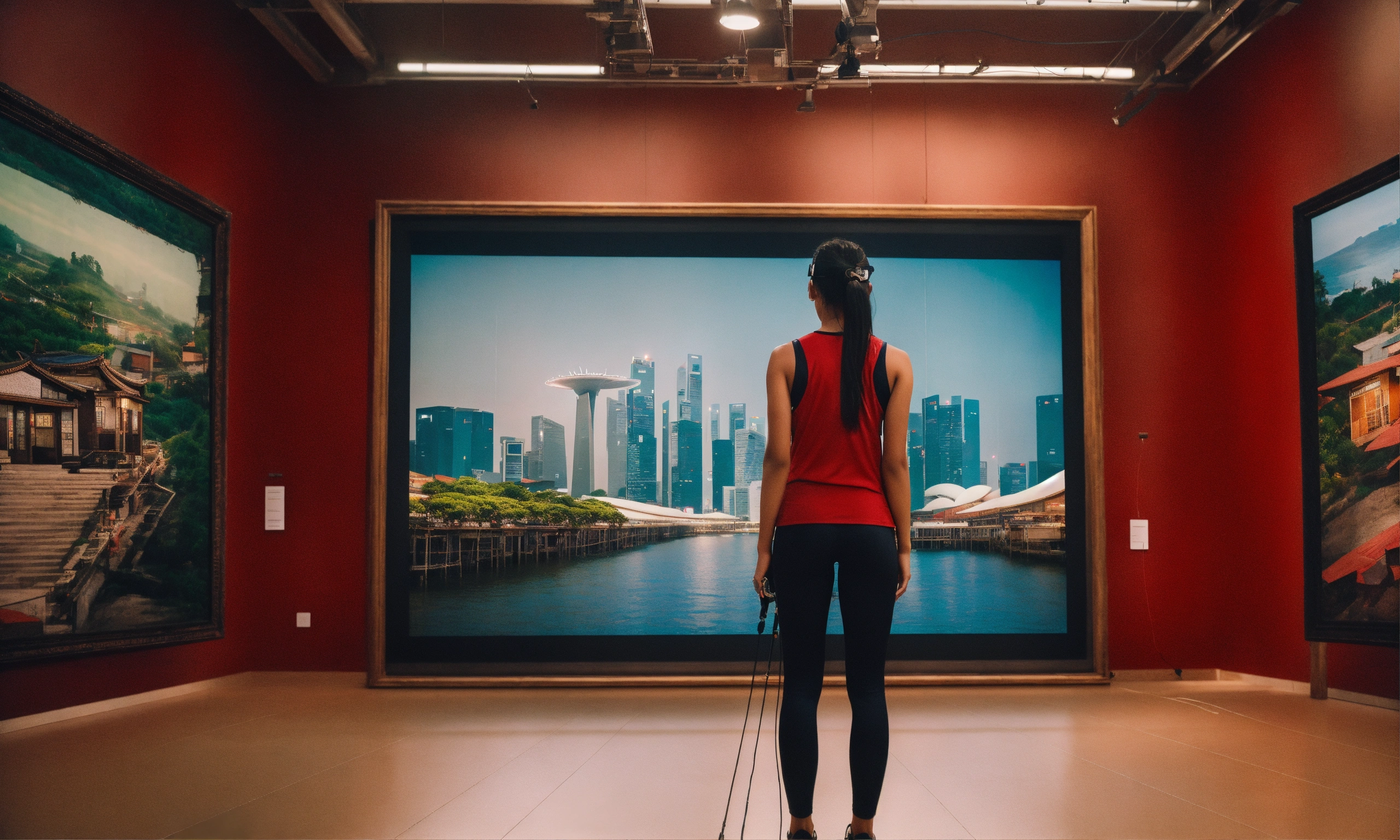 Ultra-realistic back medium shot of a tanned 18-year old asian female athlete, surprise expression, plain red singlet in a next-gen museum in singapore, in a room with highly detailed augmented reality screen as walls playing a fishing village, a window at the side of the studio showing showing singapore's city scape, sci-fi, modern nostalgia, breathtaking, highly detailed, cinematic, 70mm camera, portra 800 film, film grain, reflections on glossy museum floor