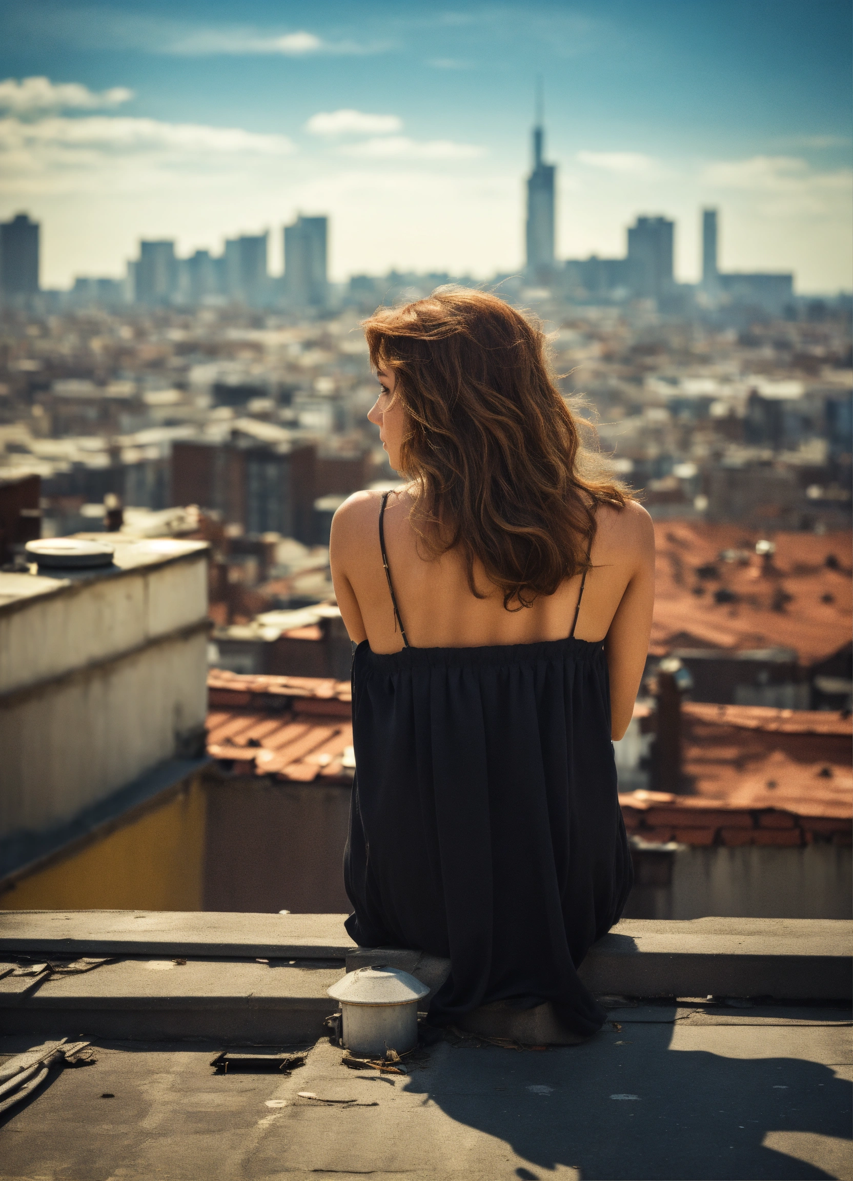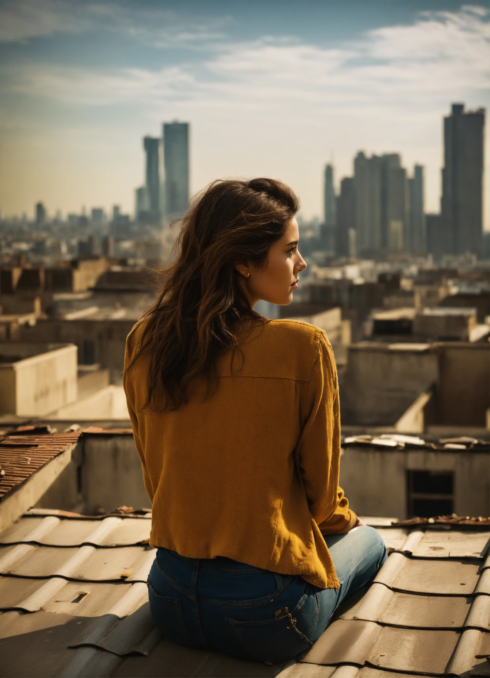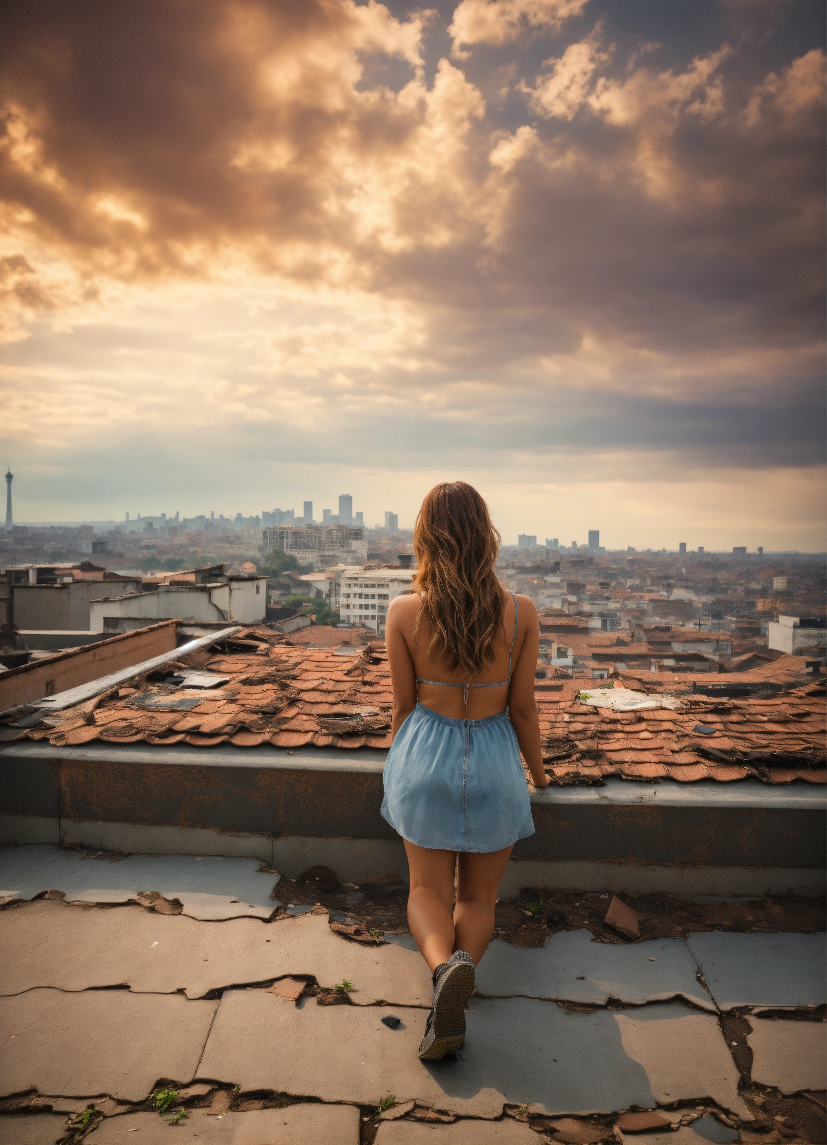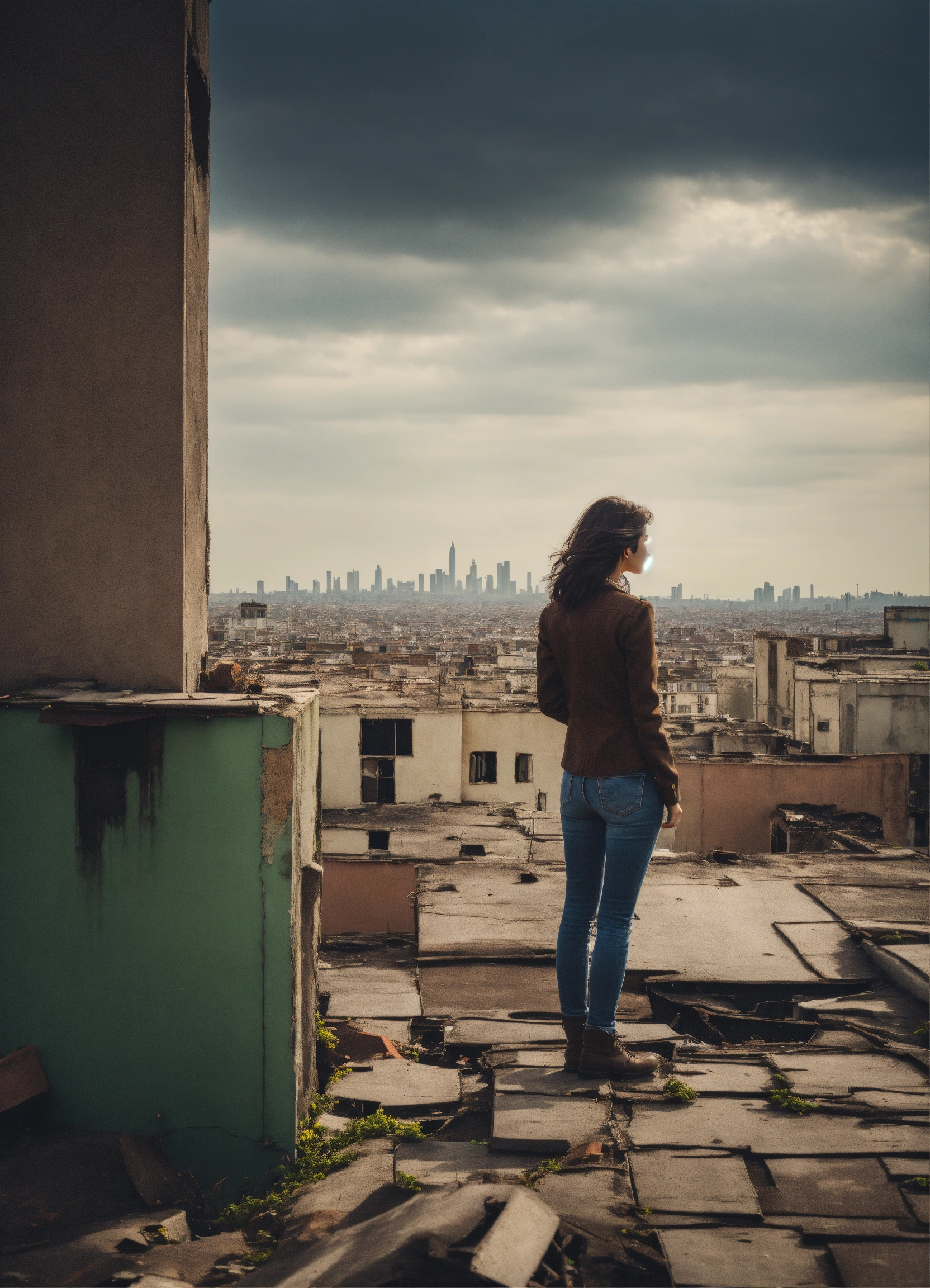 A woman looking at the horizon from an abandoned rooftop, in the background you can see a city, it is very realistic photo