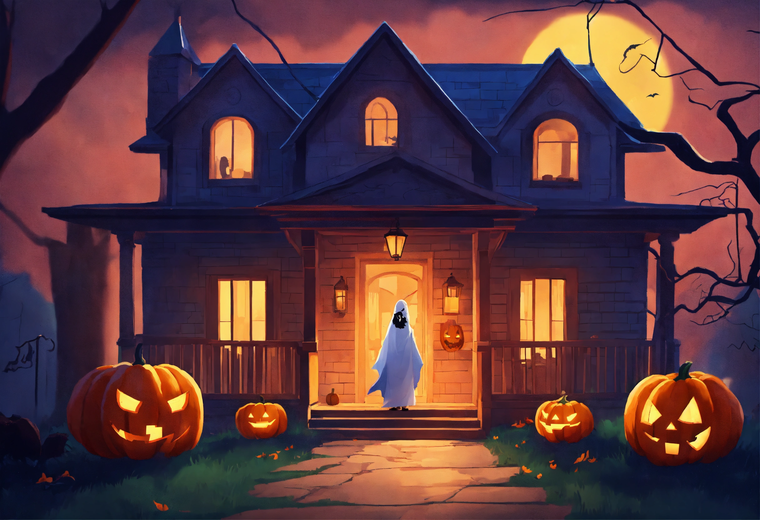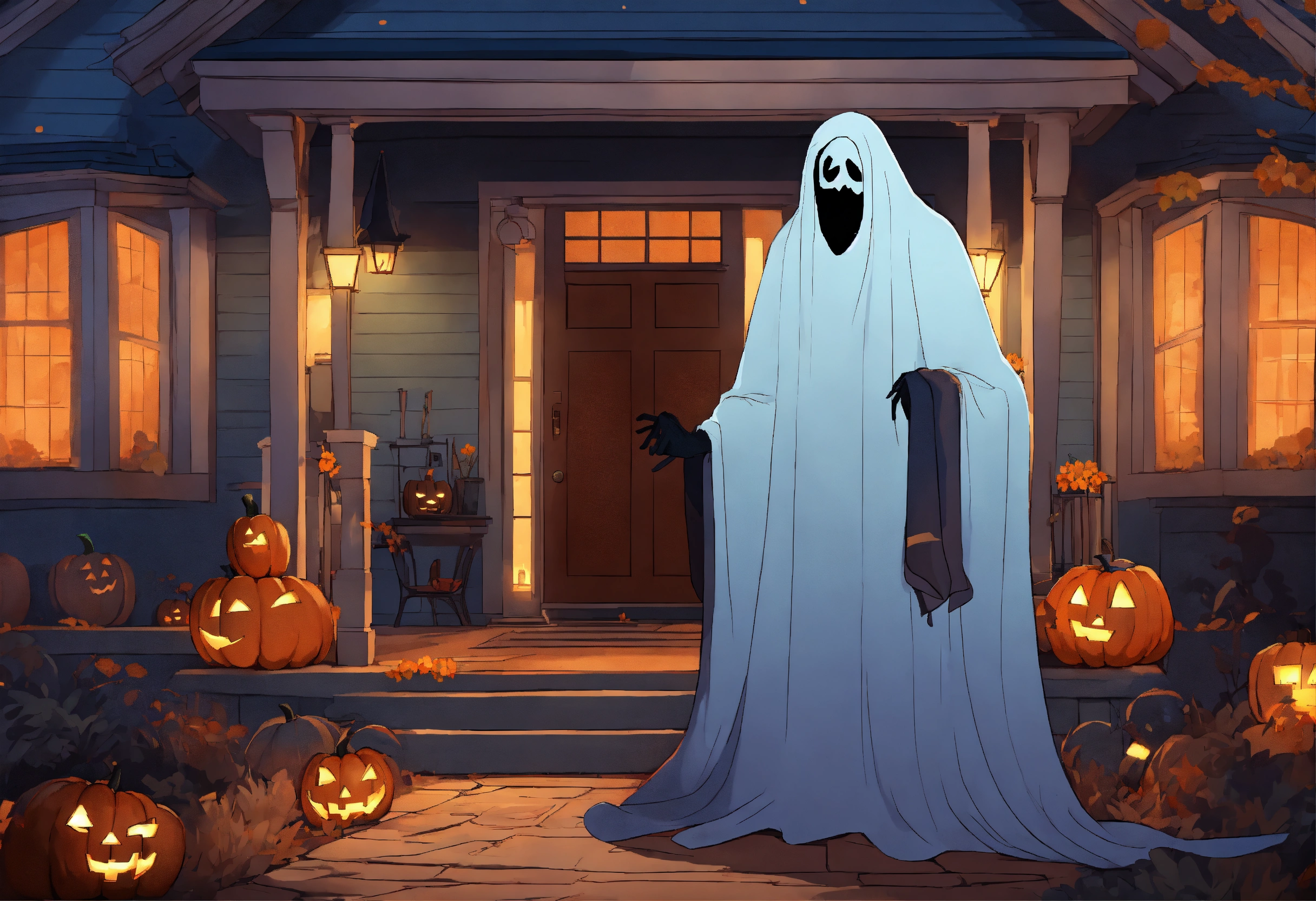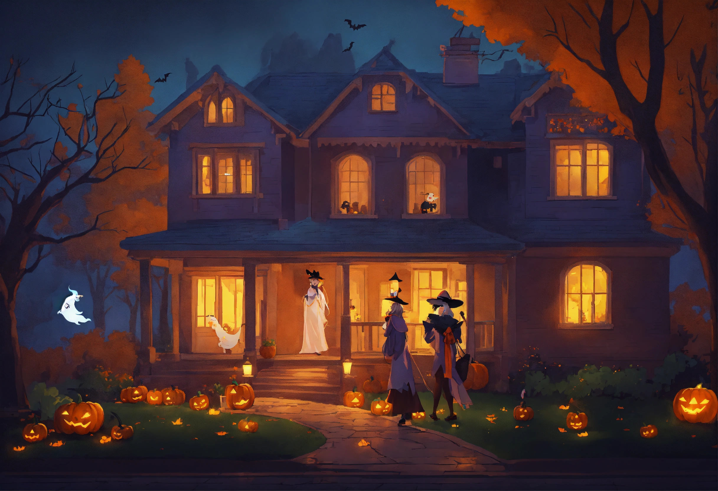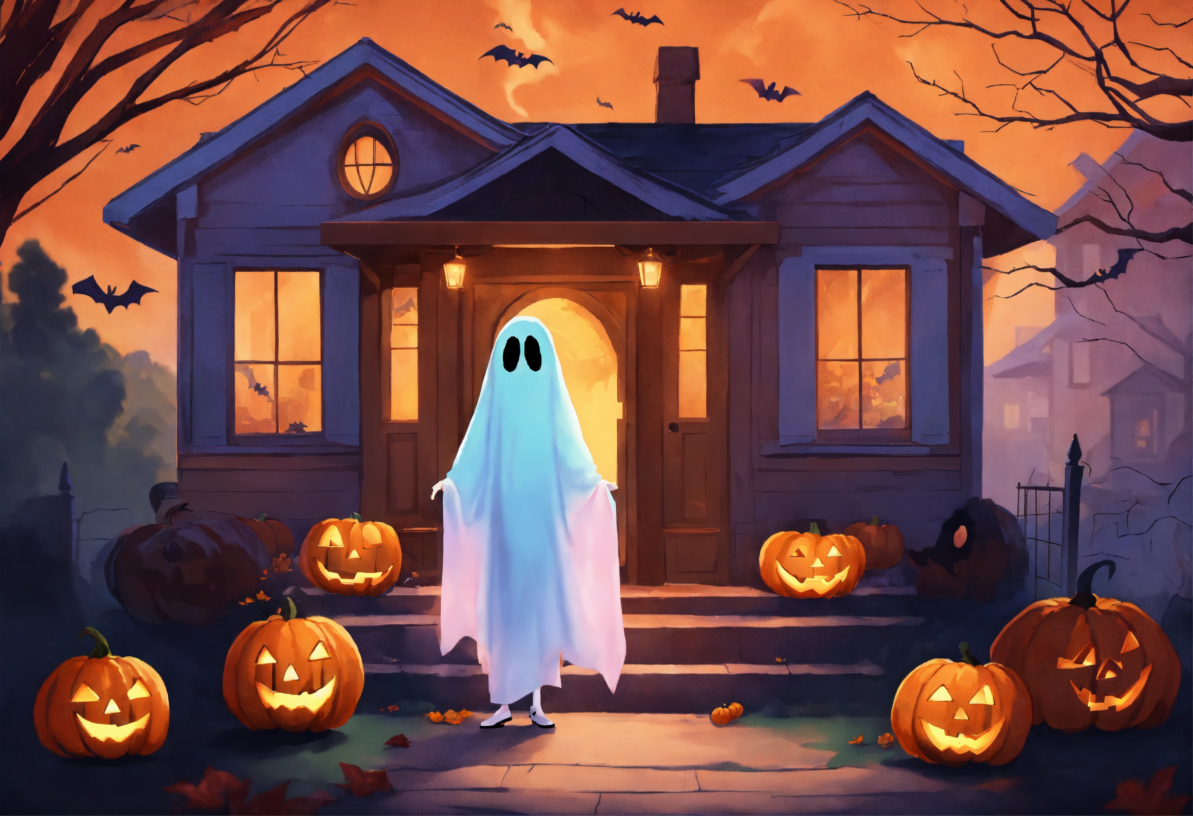 Got ready to head to his neighbor's house to join a halloween party, style of 2d animation, cartoon with ghosts.