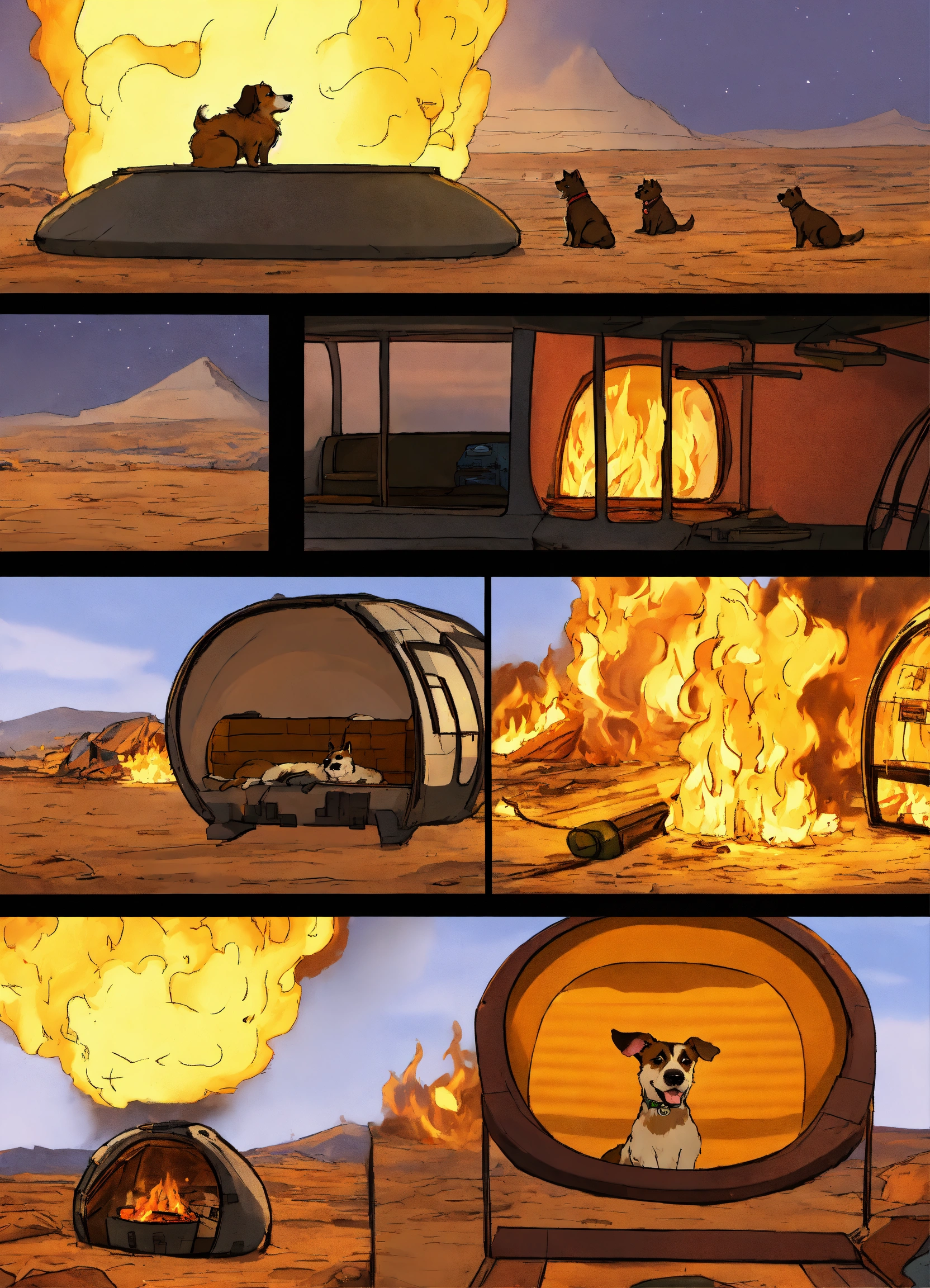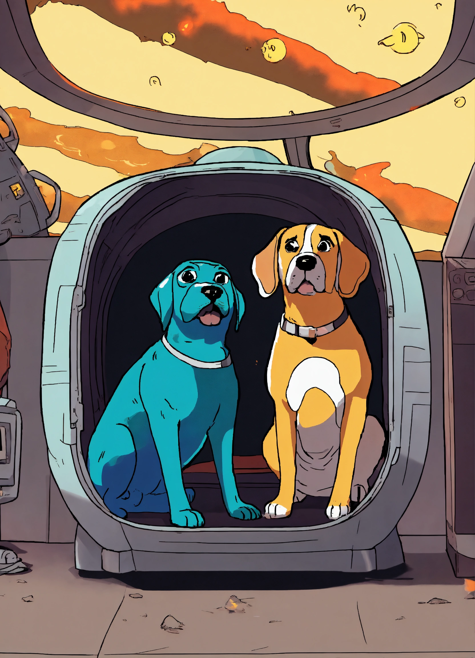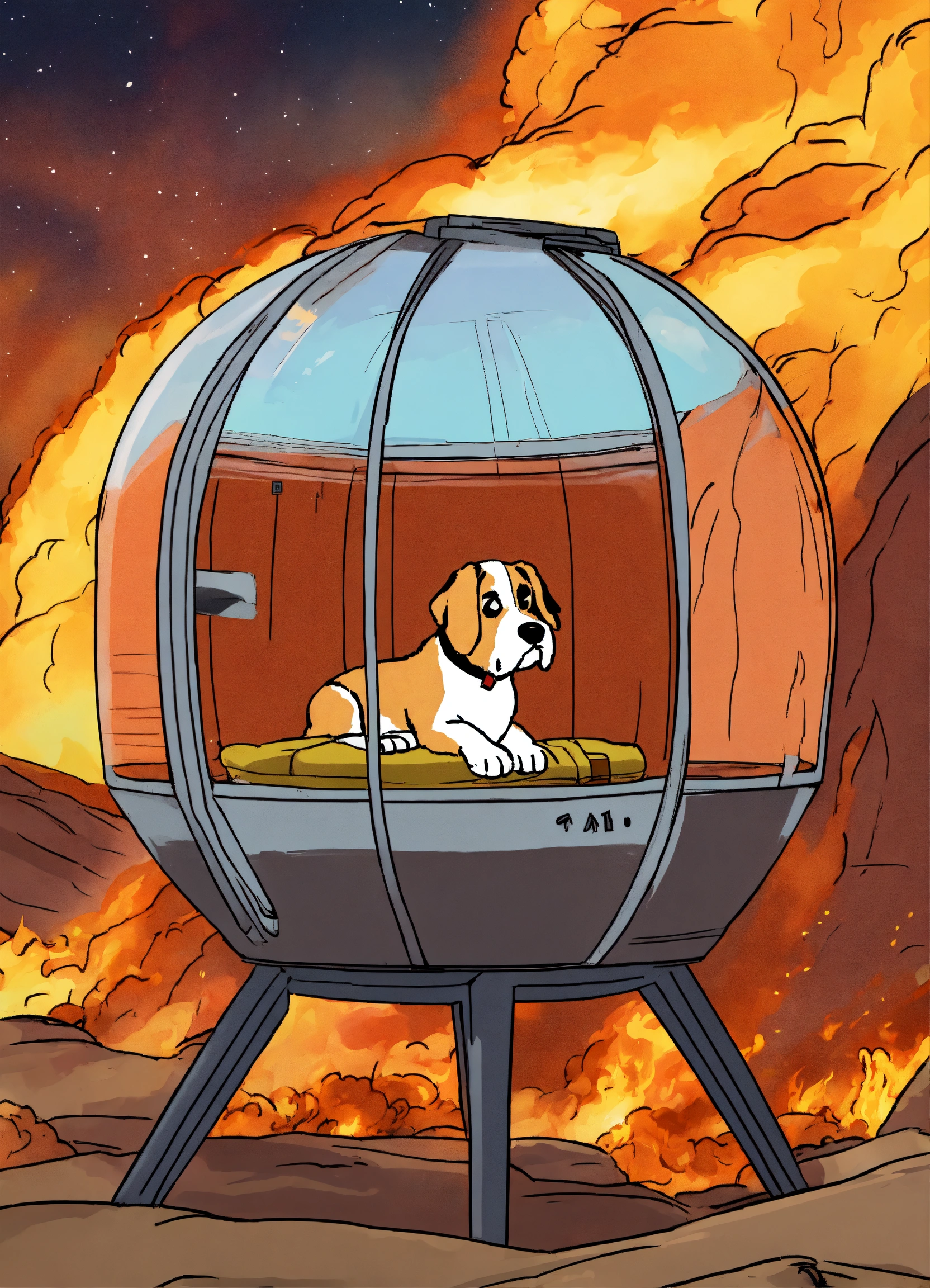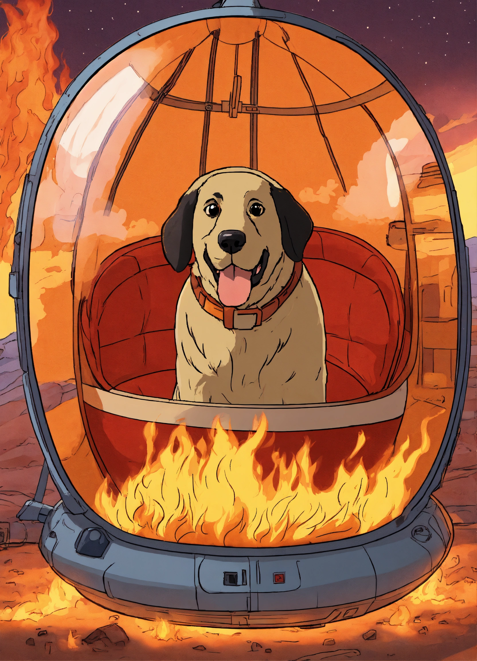 The "this is fine" meme but in a spaceship capsule. the dog should look the same as in the meme, and outside of the capsule should be on fire