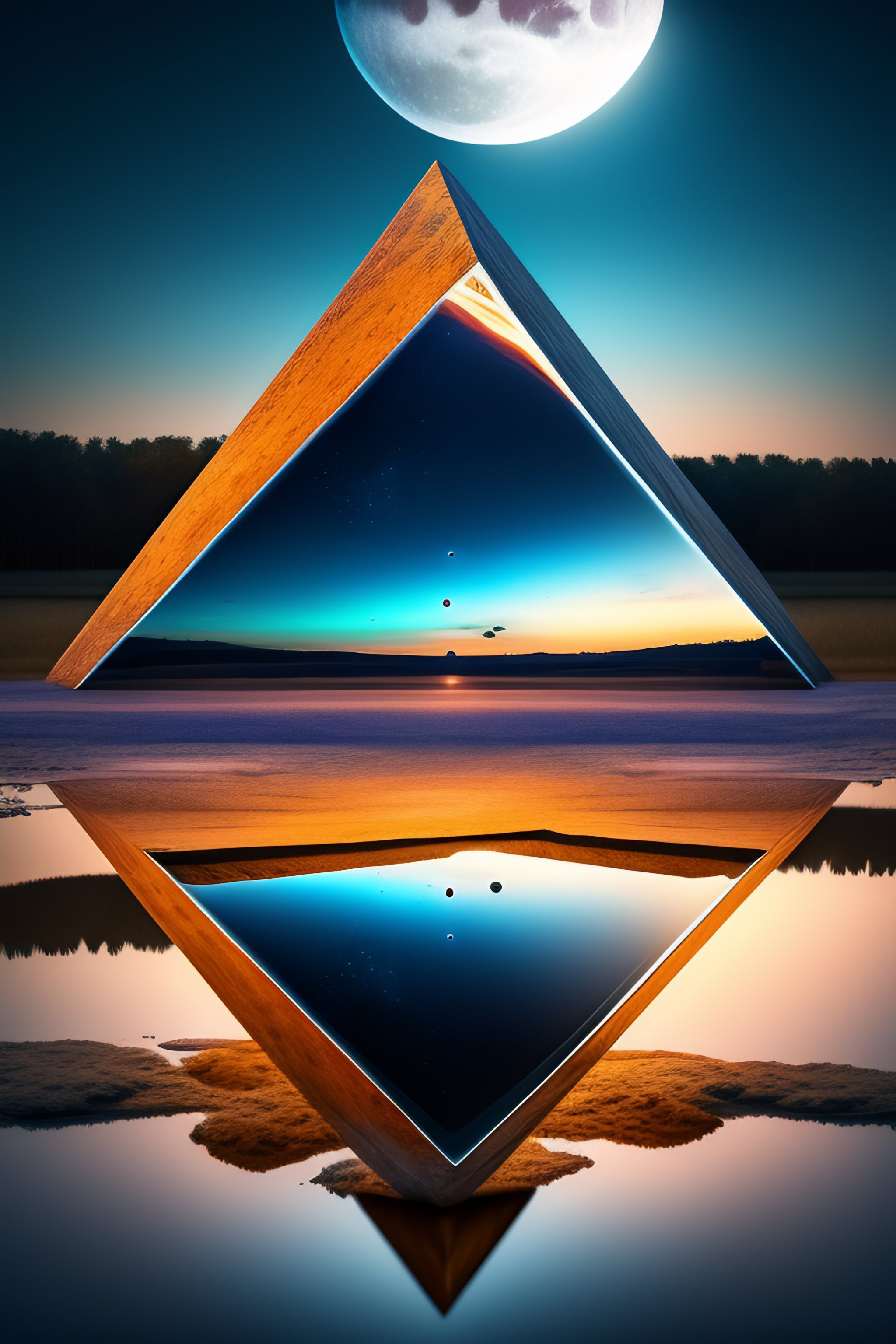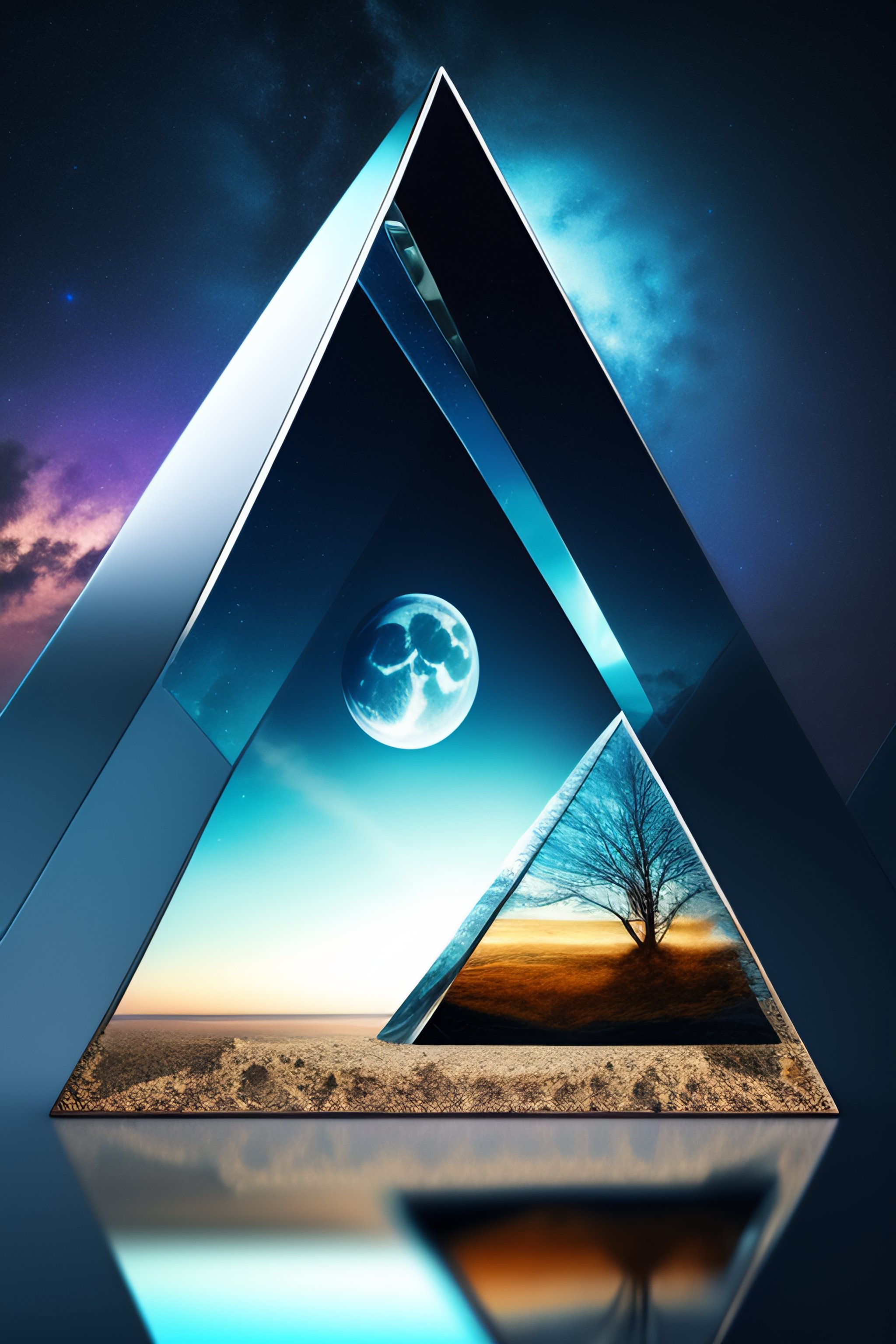 3d floating flipped upsidedown down mirror triangular pyramid polyhedron mirrored with reflected one tree inside, empty dried and cracked ground, background with big moon rising, planet moon night, blue vivid darkness colors
