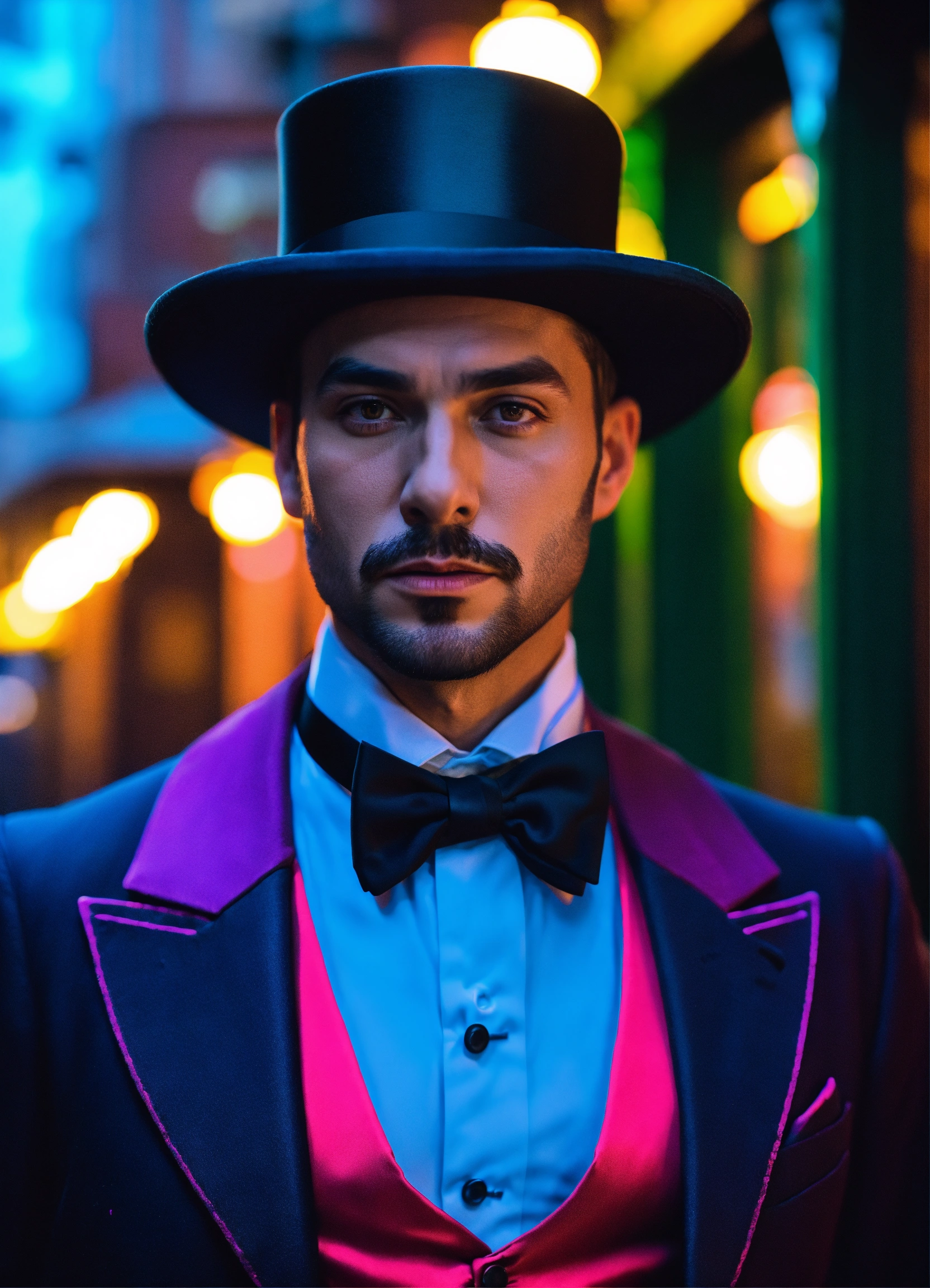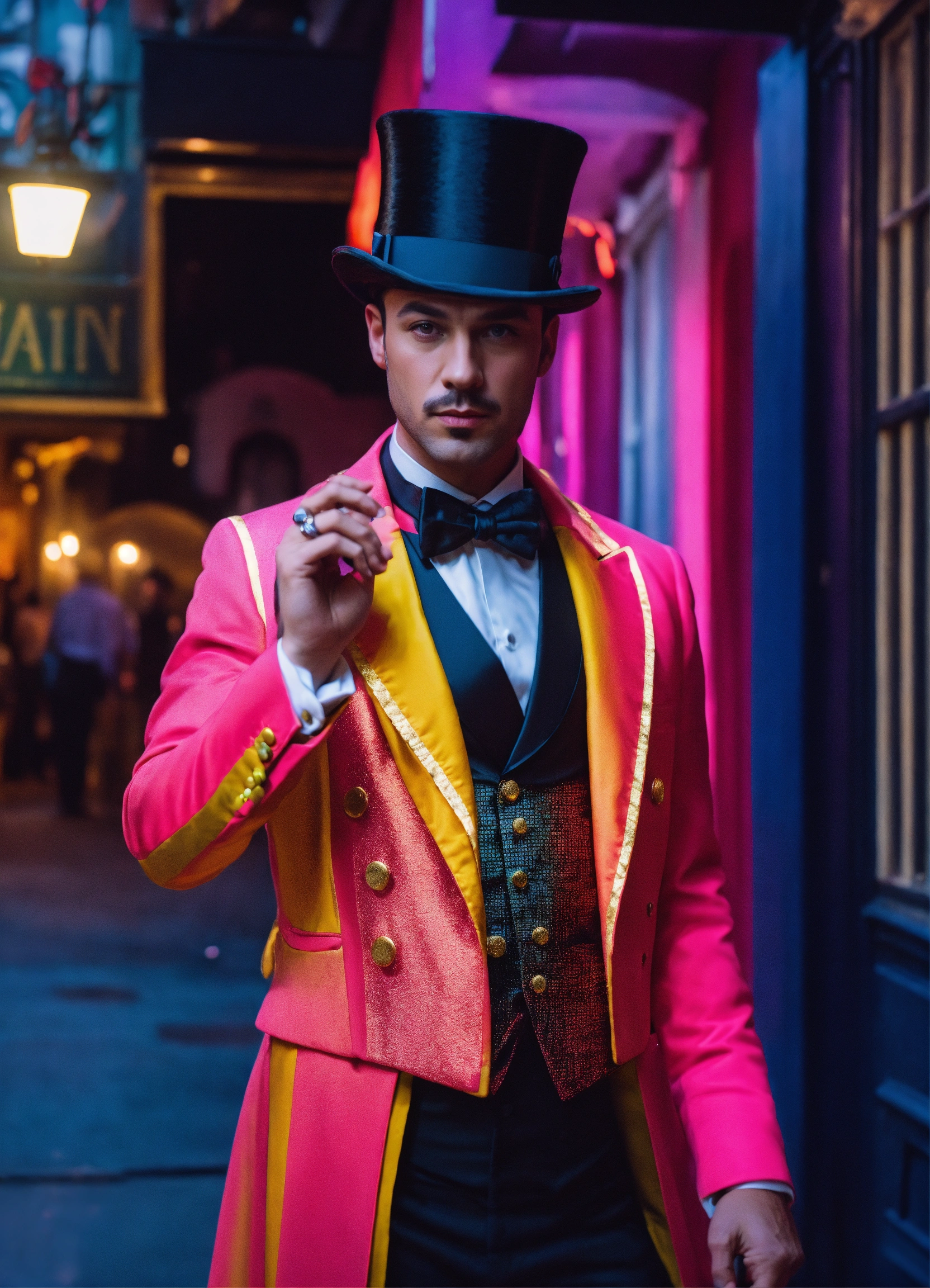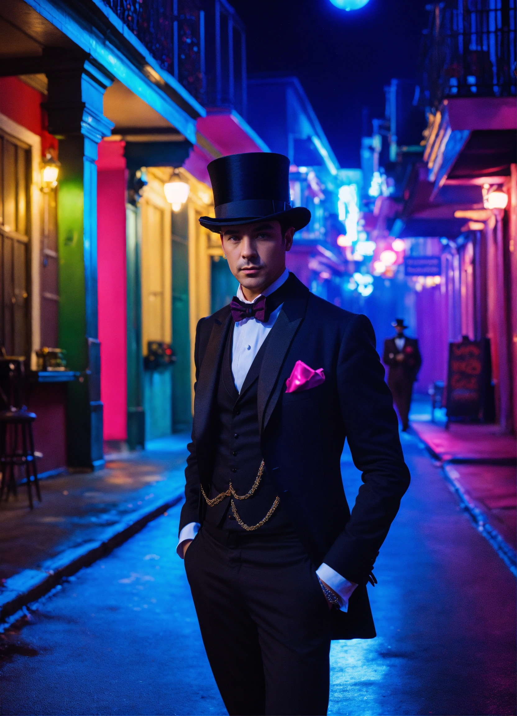 Cinematic photography, modern, male magician in top hat in french quarter, proportionate, neon colors details, realistic, ultra 8k resolution