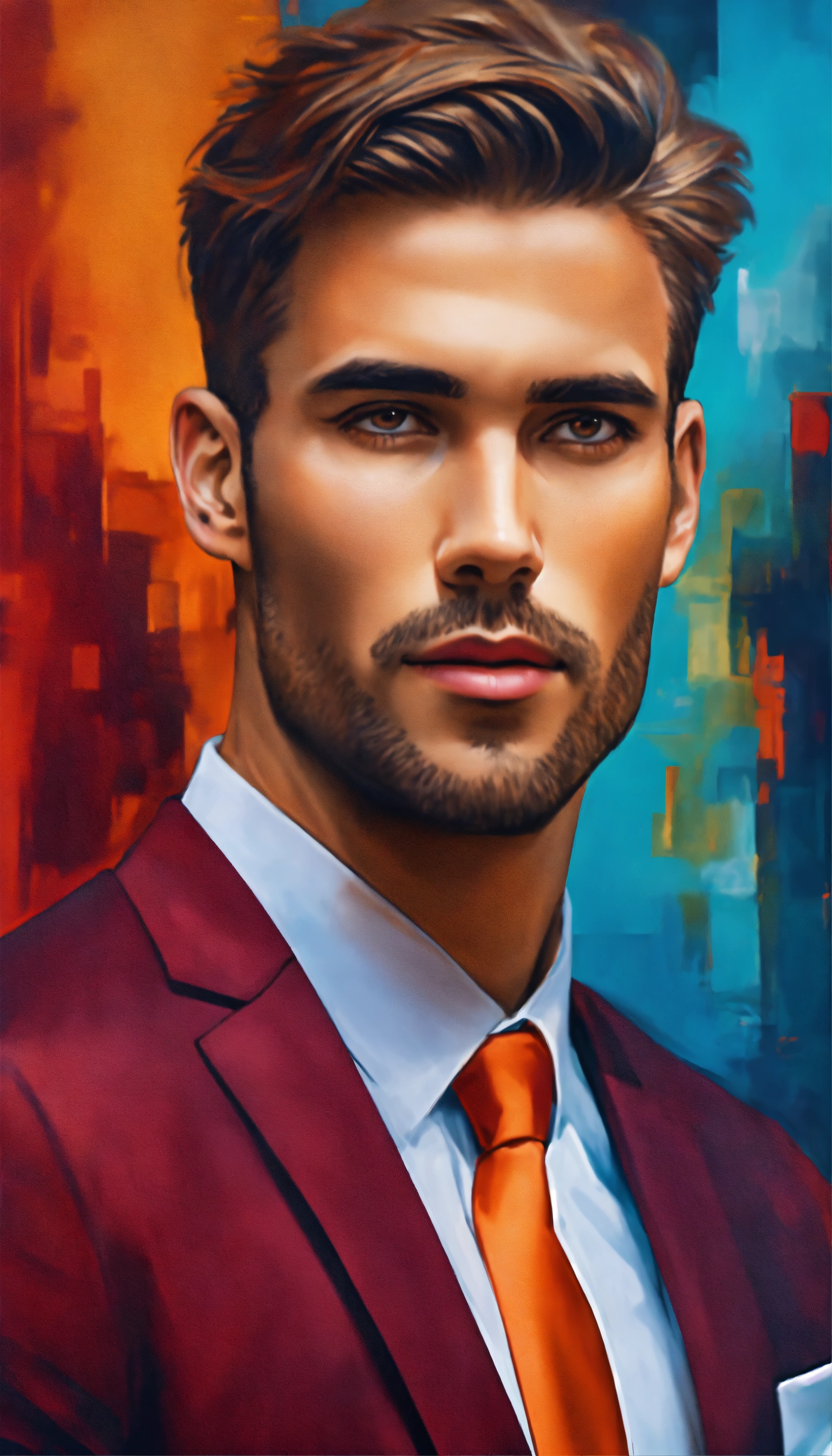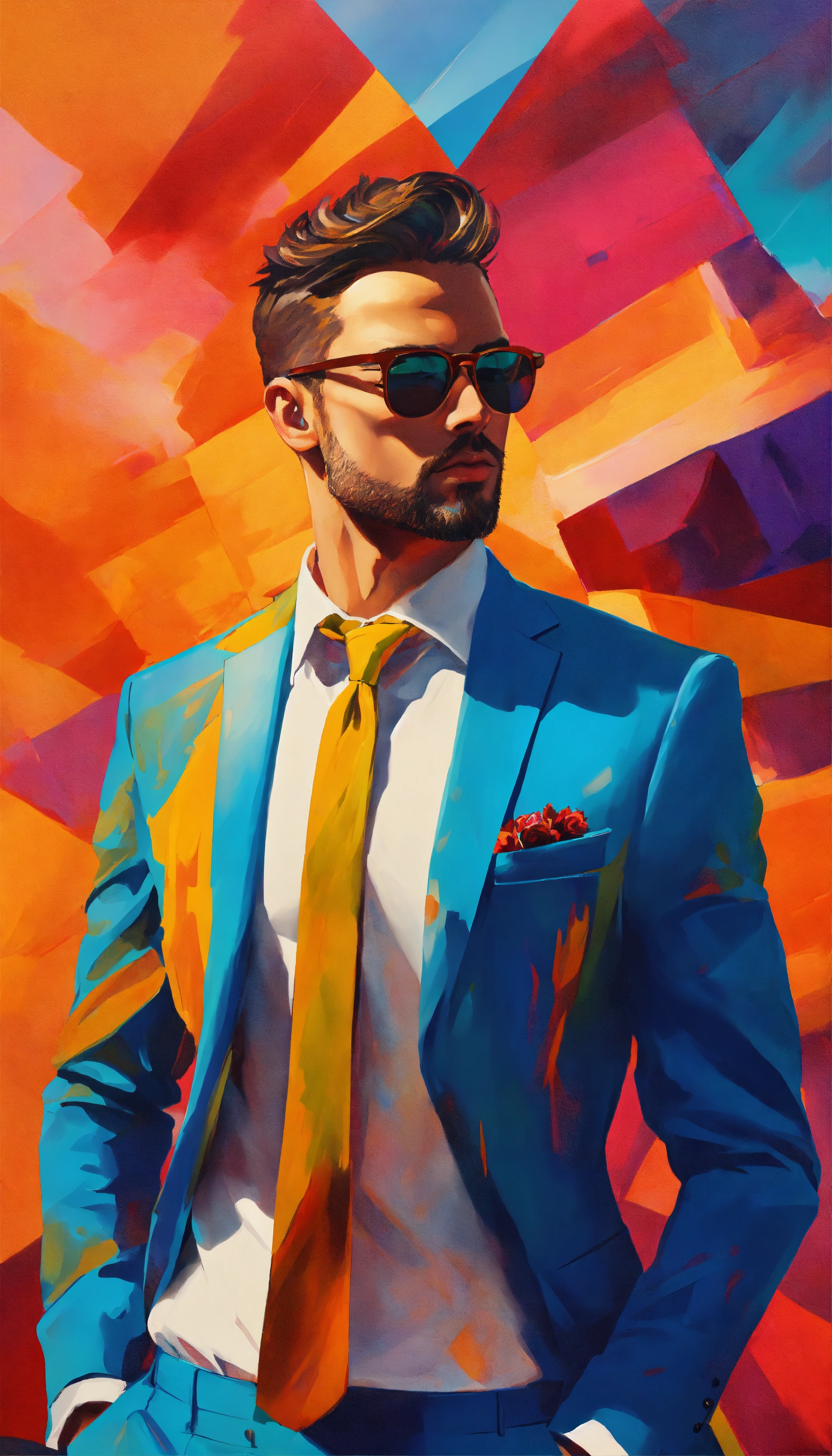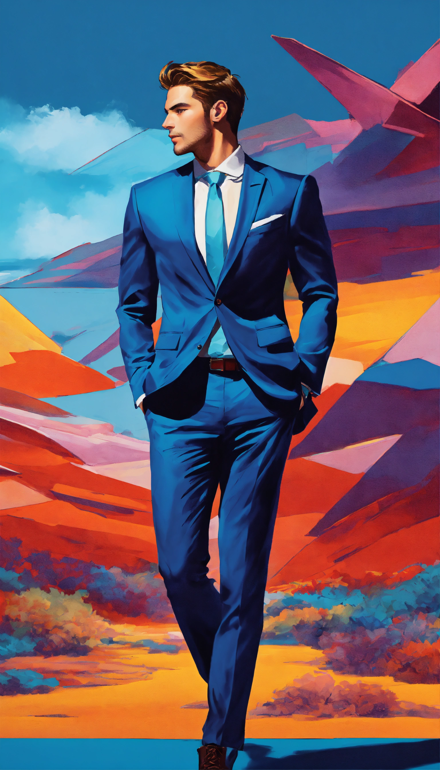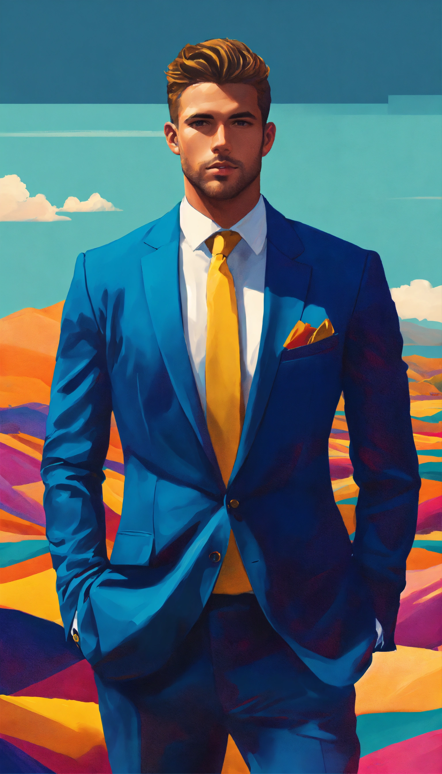 Design a compelling image, contemporary but bold and vibrant, attractive man with broad shoulders, in suit. active landscape that represents the vitality and confidence of individuals in the contemporary world. no text added.