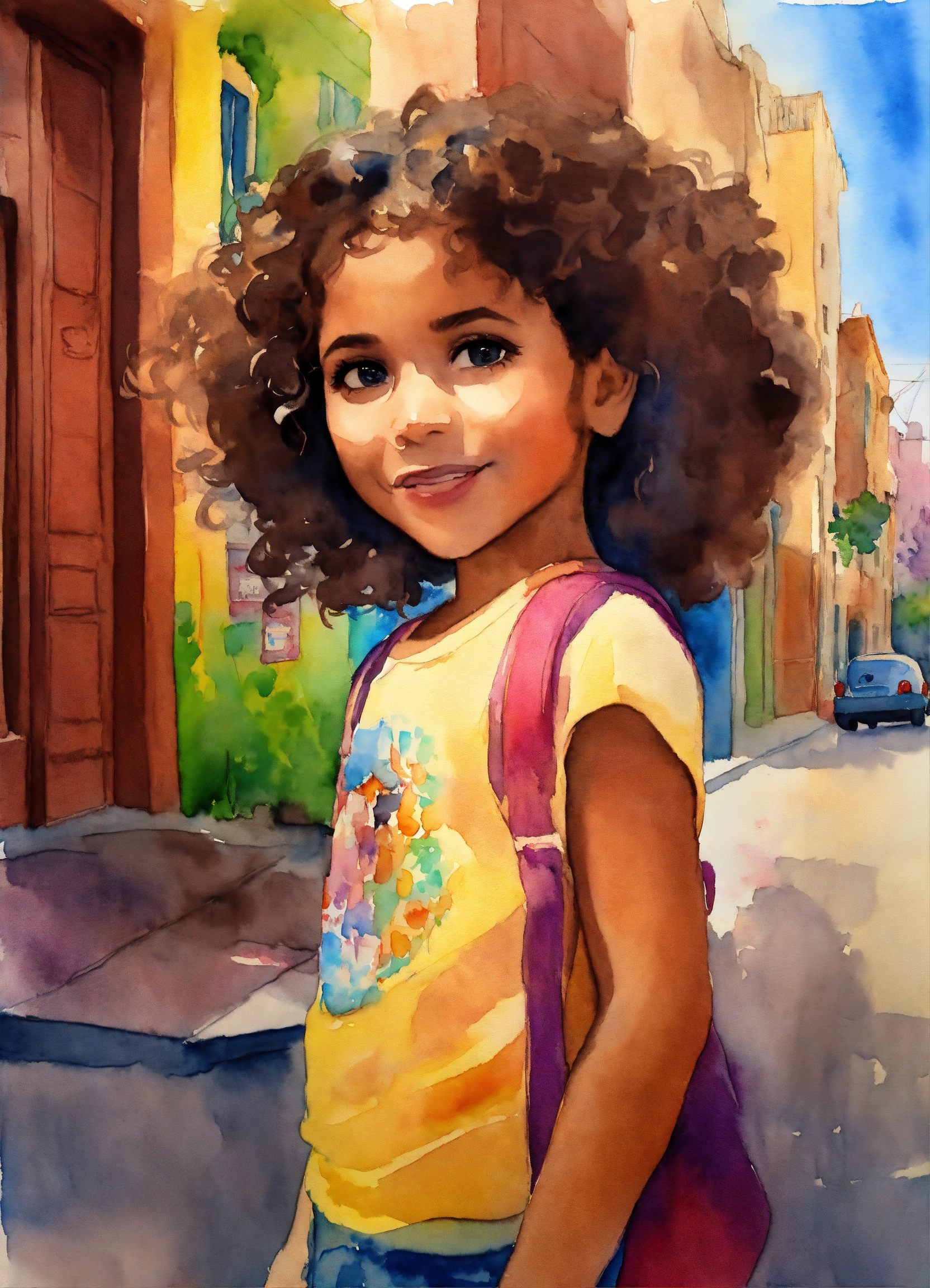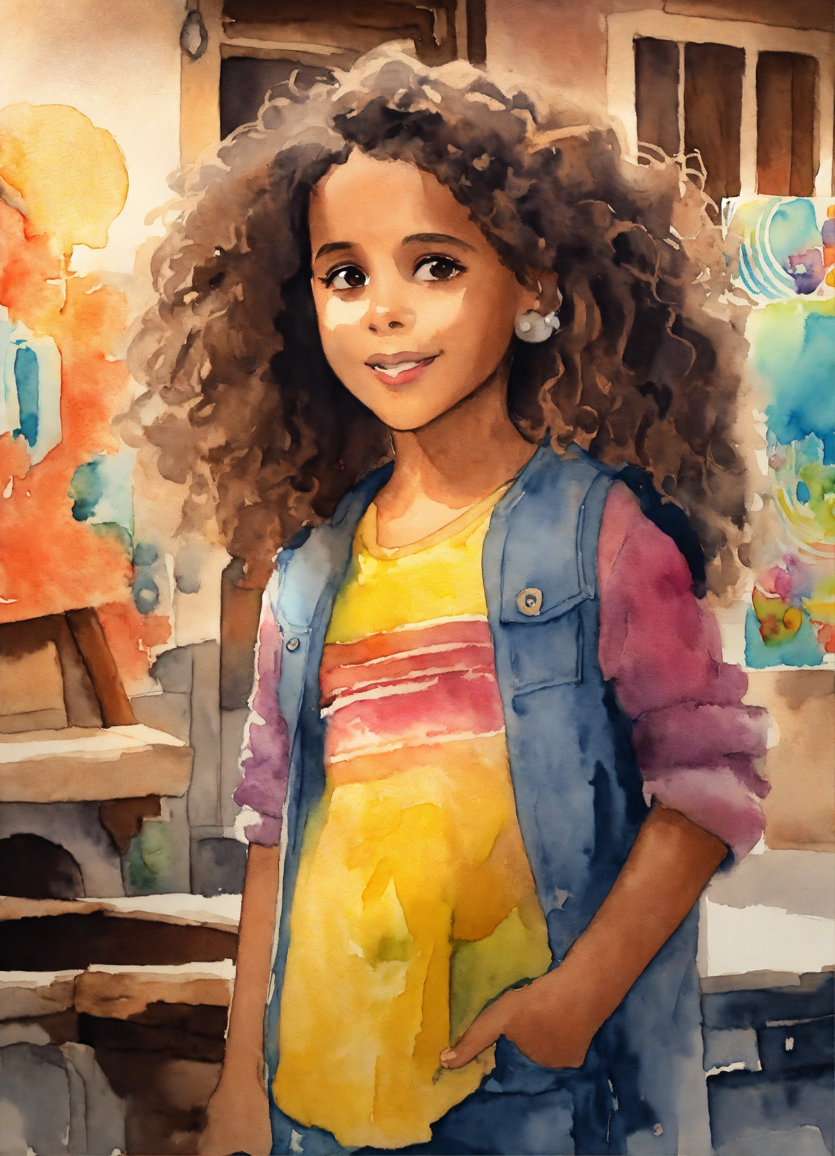Watercolor pixar painting of hispanic 8 year old halle berrywitn curly dark brown hair talking to local artists with colorful murals in the background, watercolor pixar style cartoon