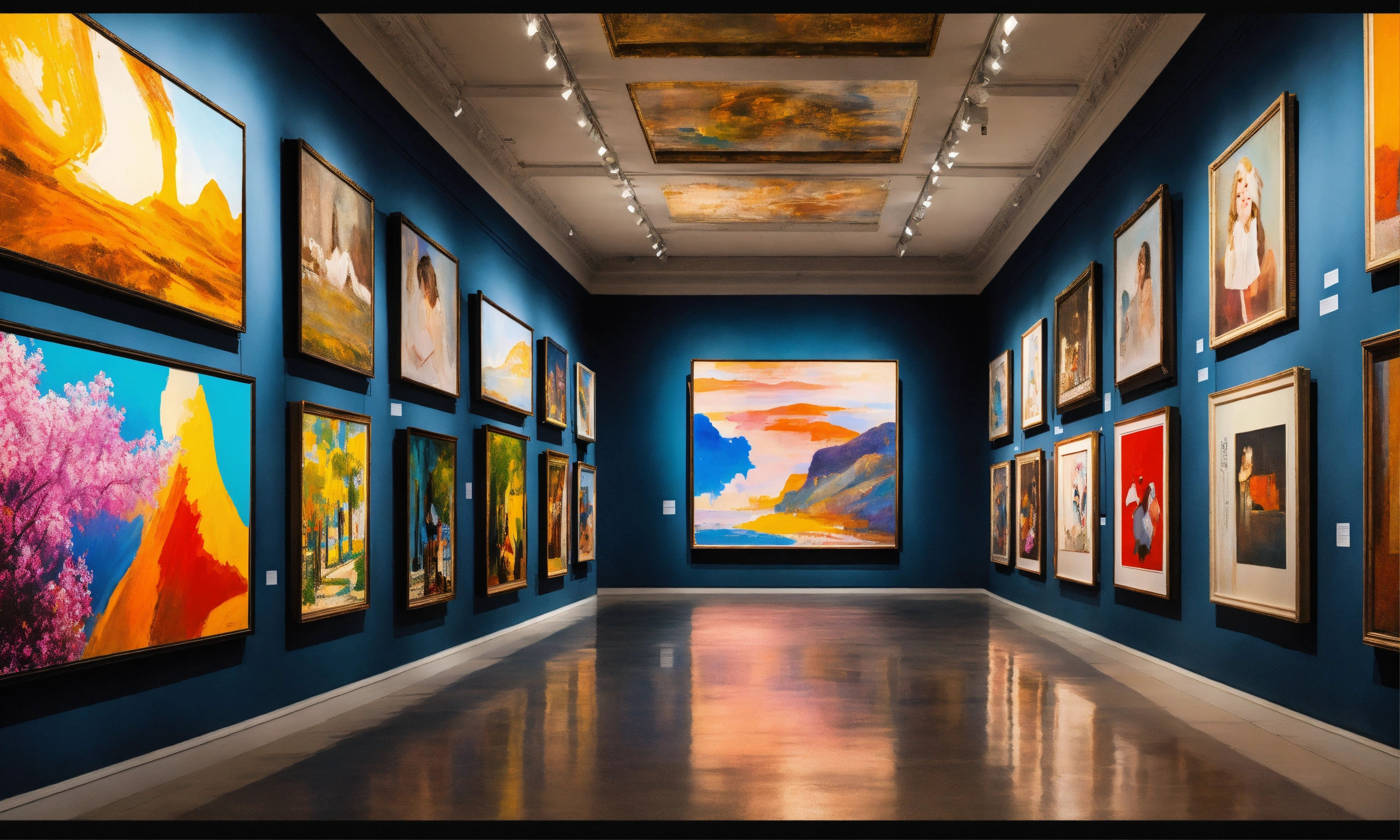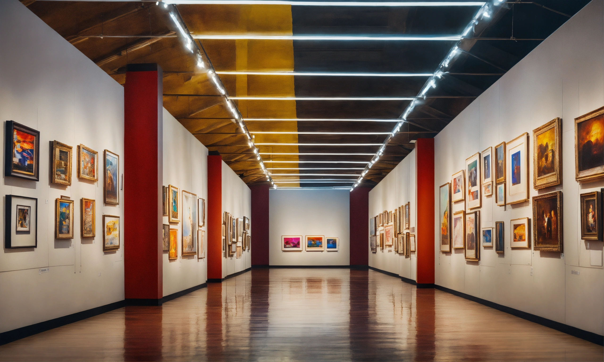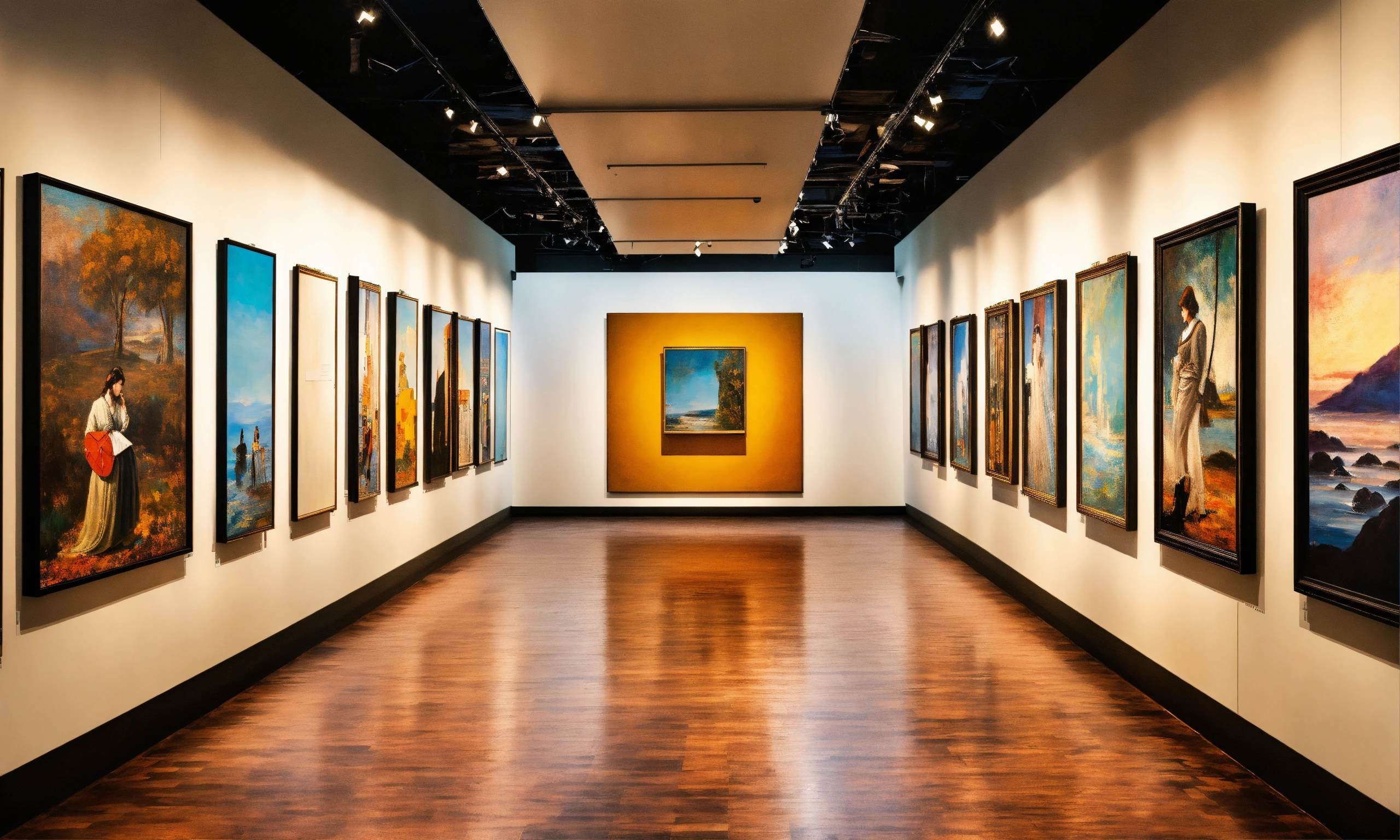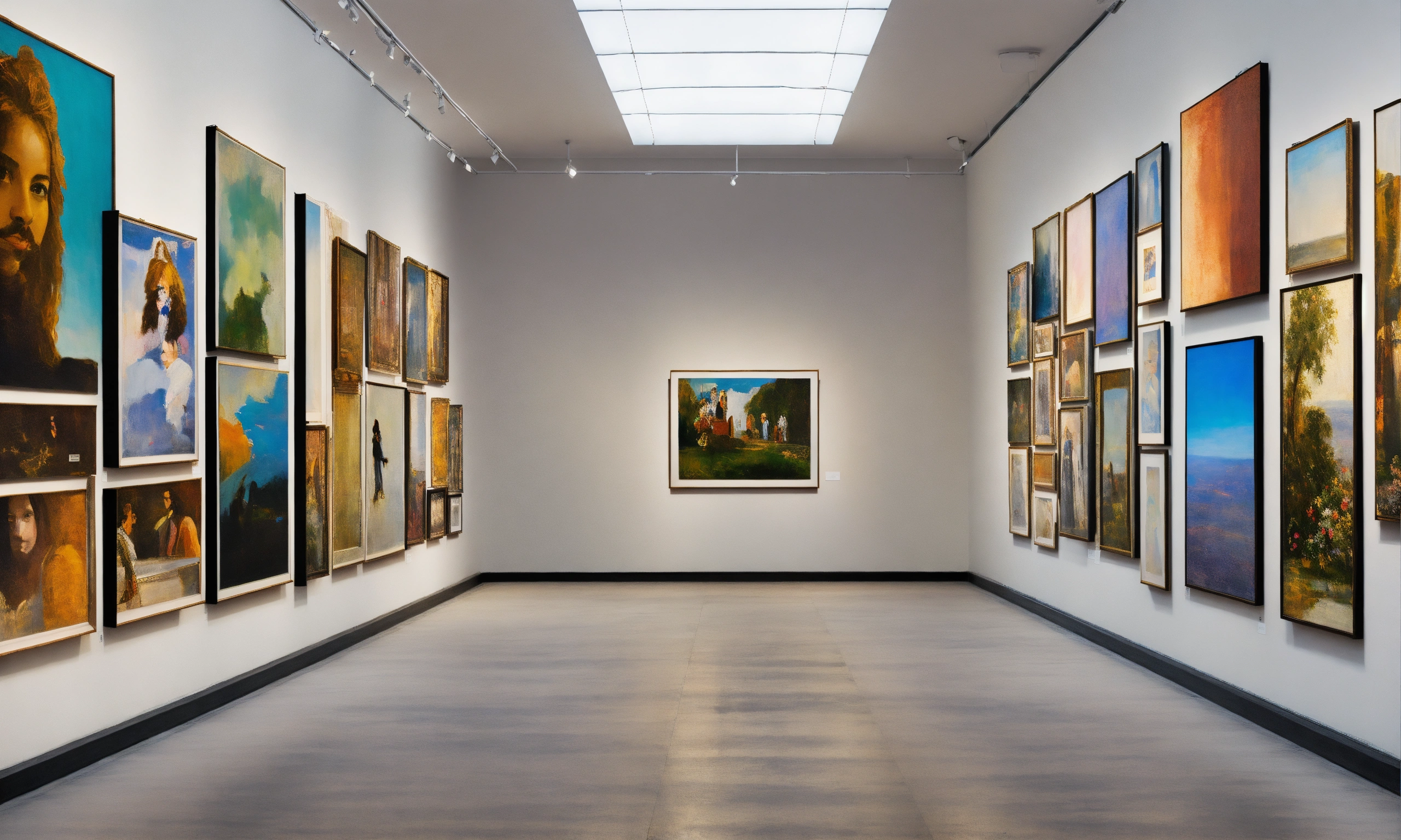 A billboard wall of art posters and framed portraits by various painters on a white wall in a museum on a wall that goes for infinity, horizon at the top of the image, digital art