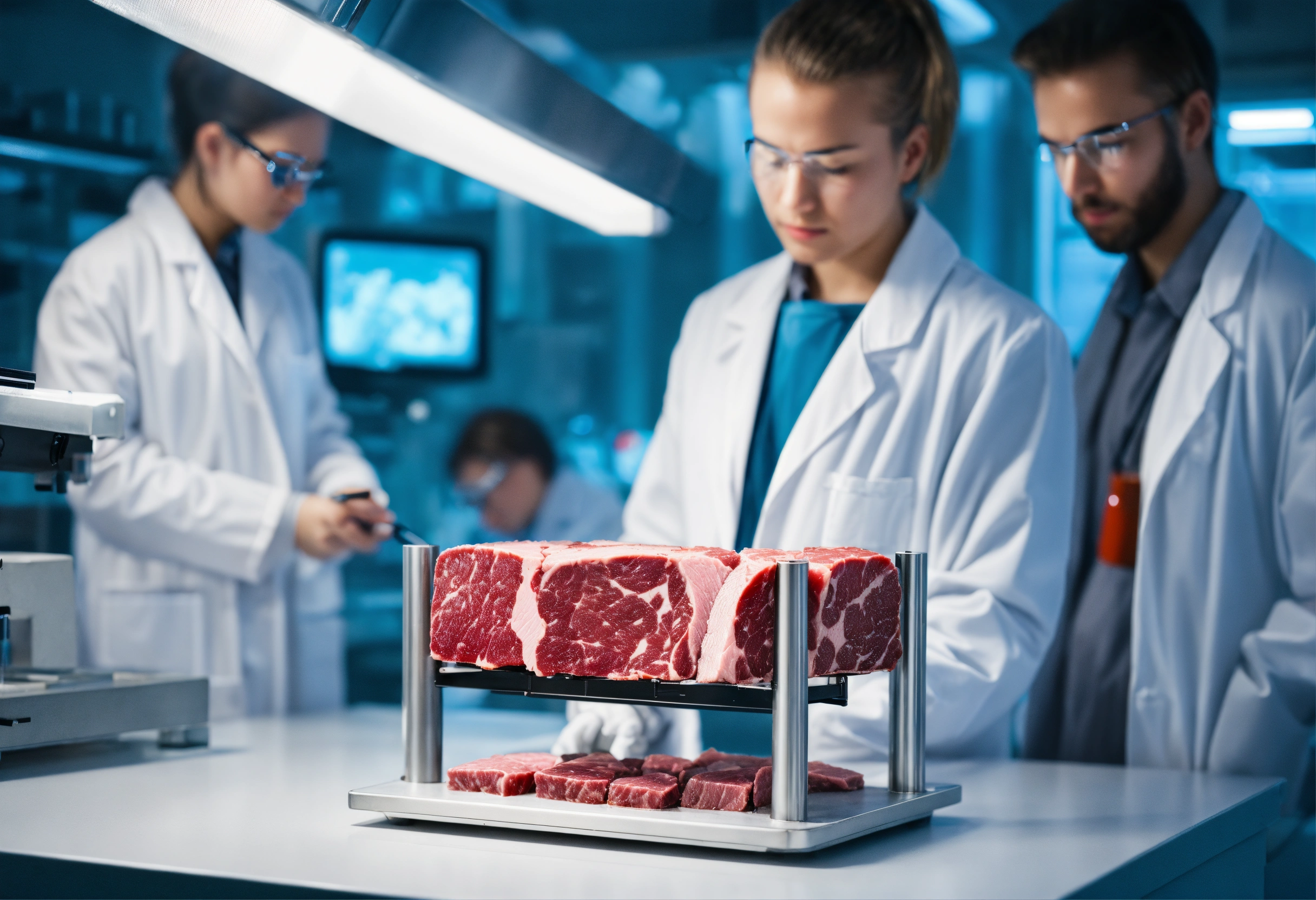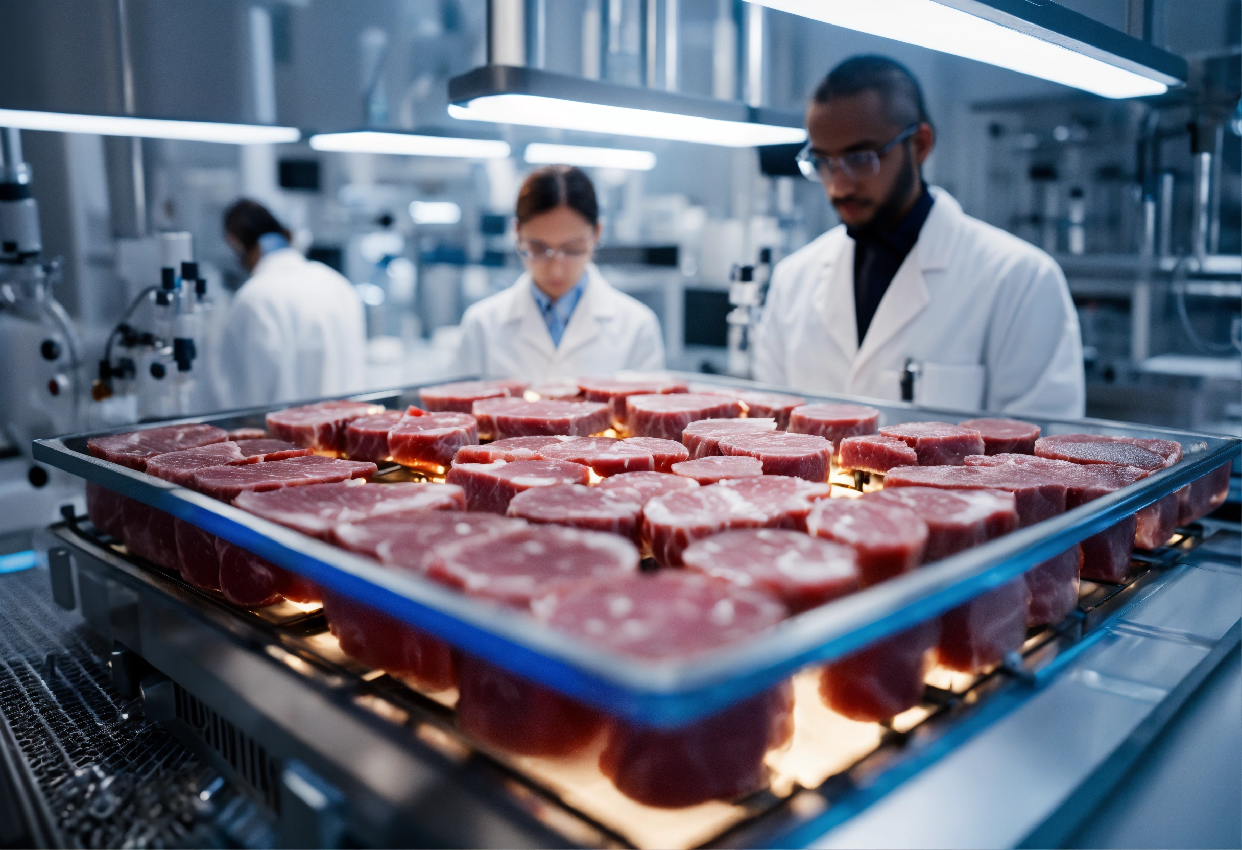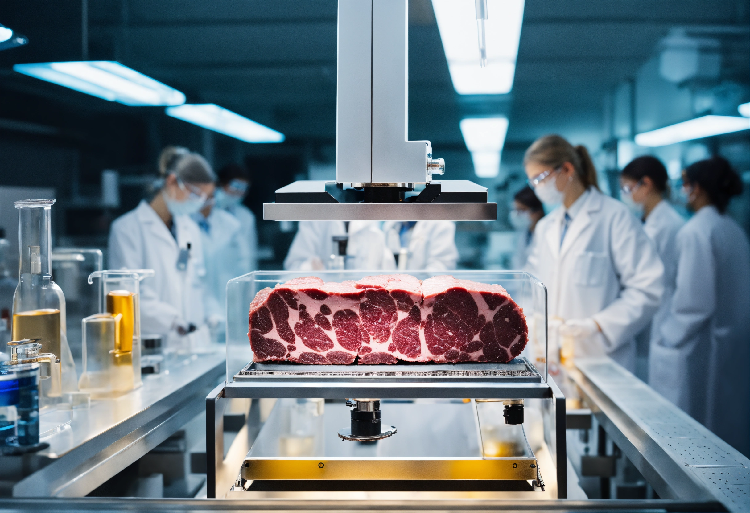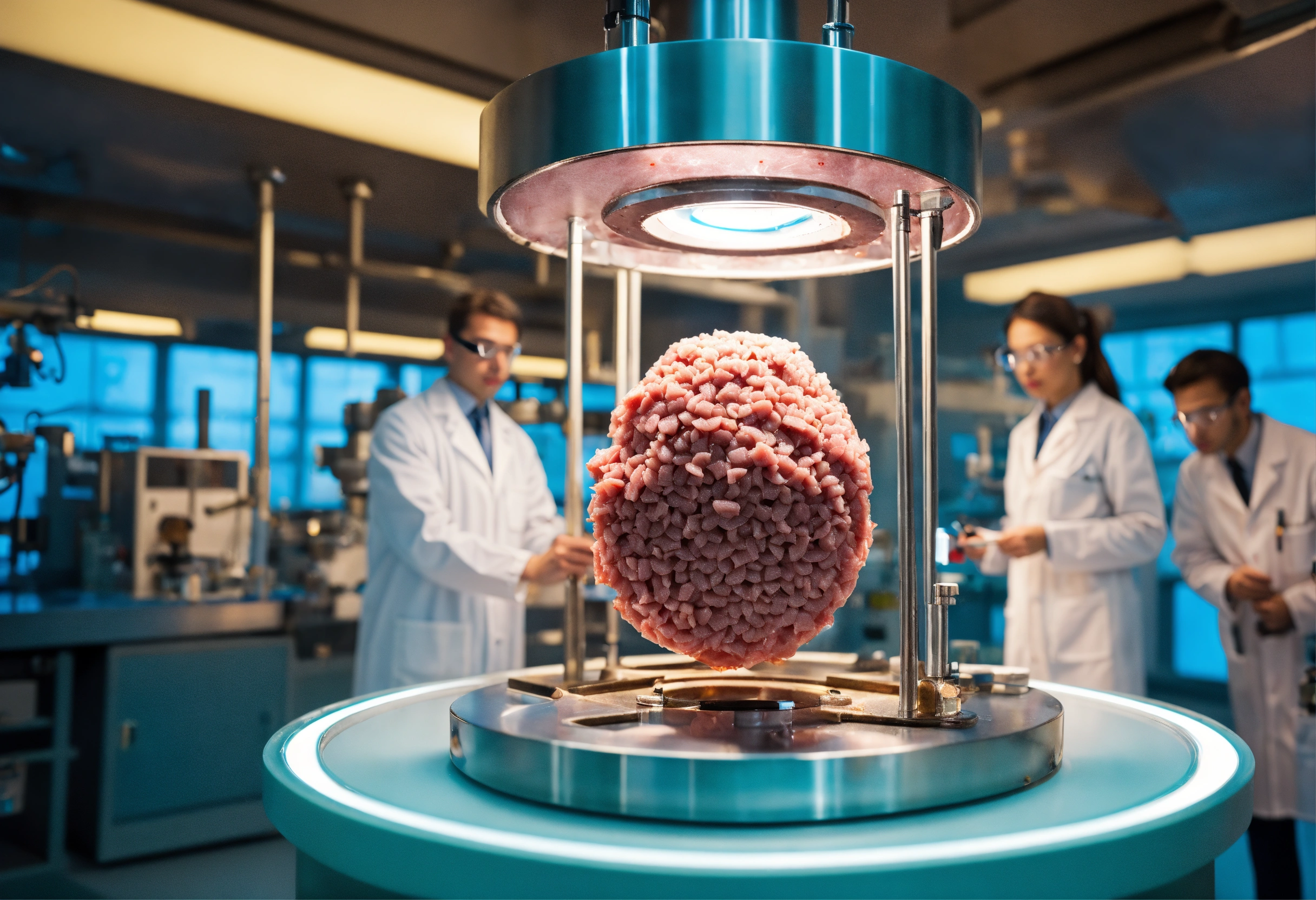 Single very small piece of cultivated meat in a futuristic apparatus in a laboratory environment with group of diverse scientists wearing lab coats, zoomed in