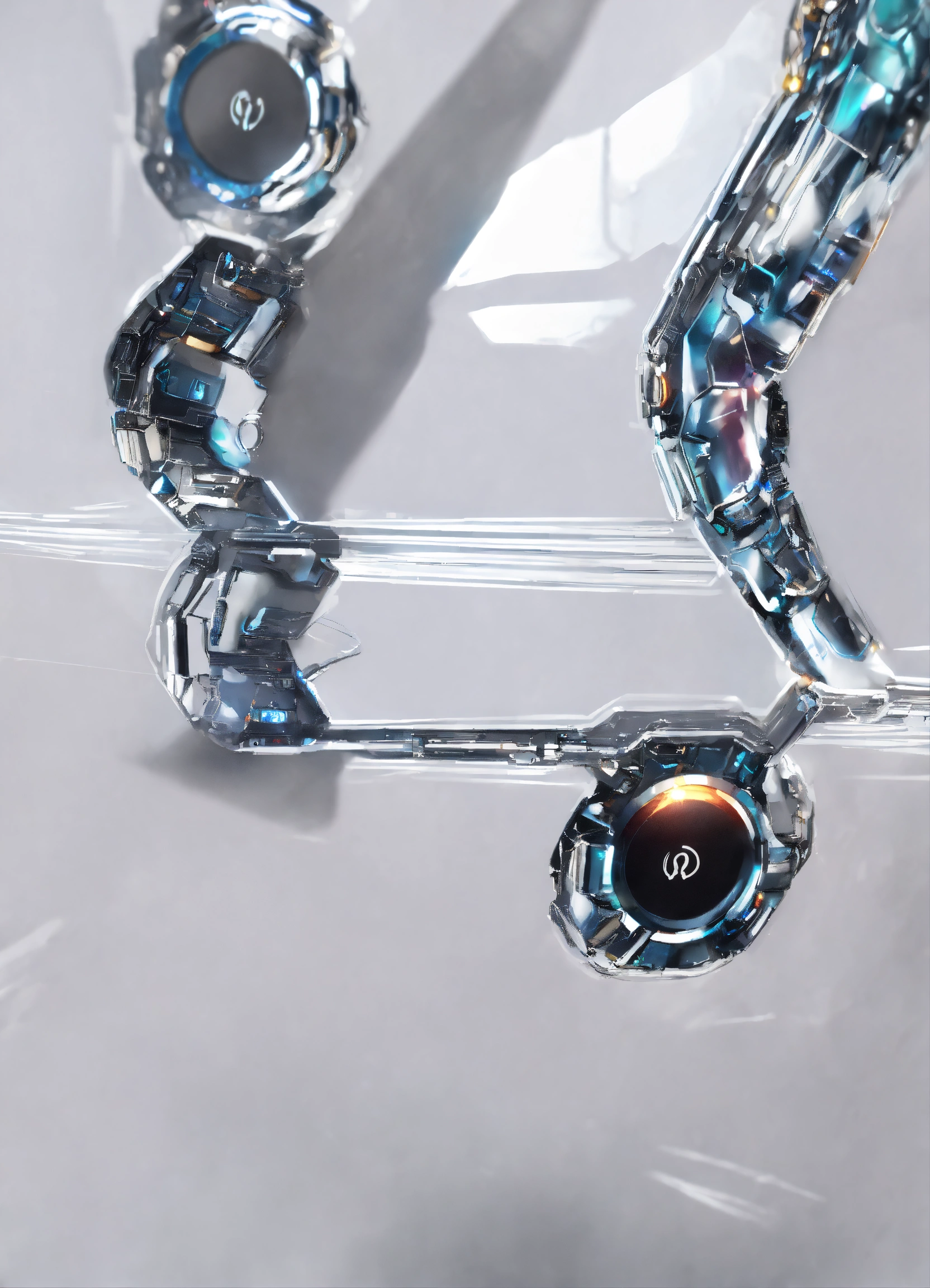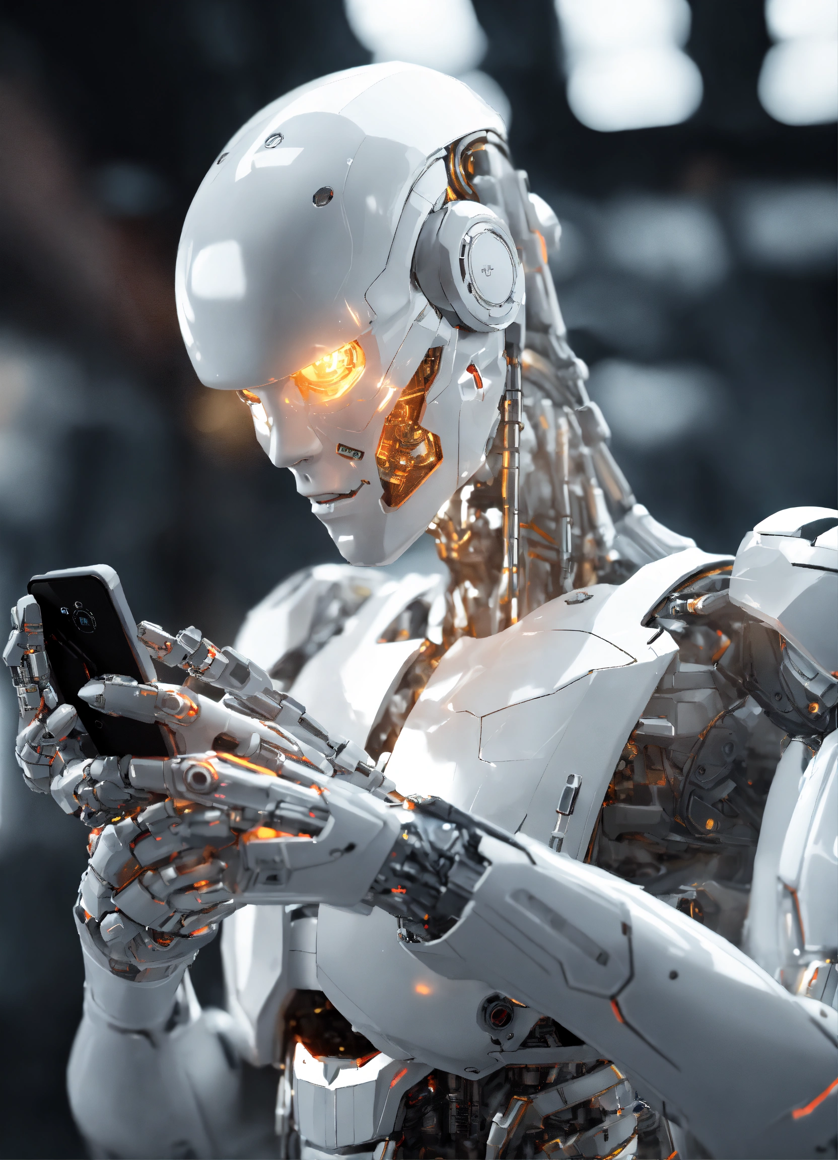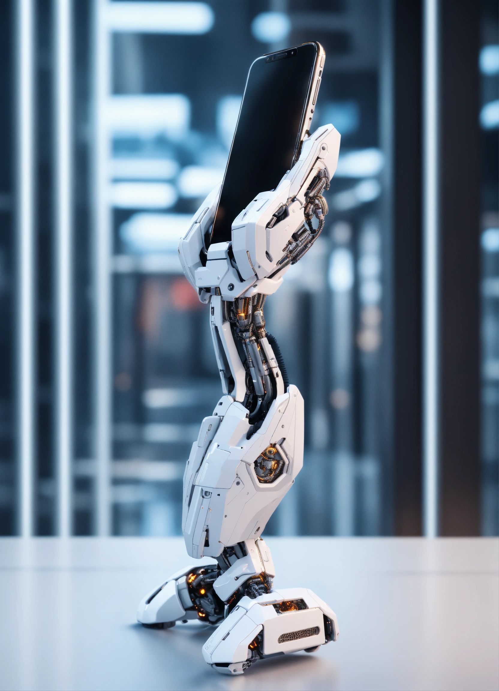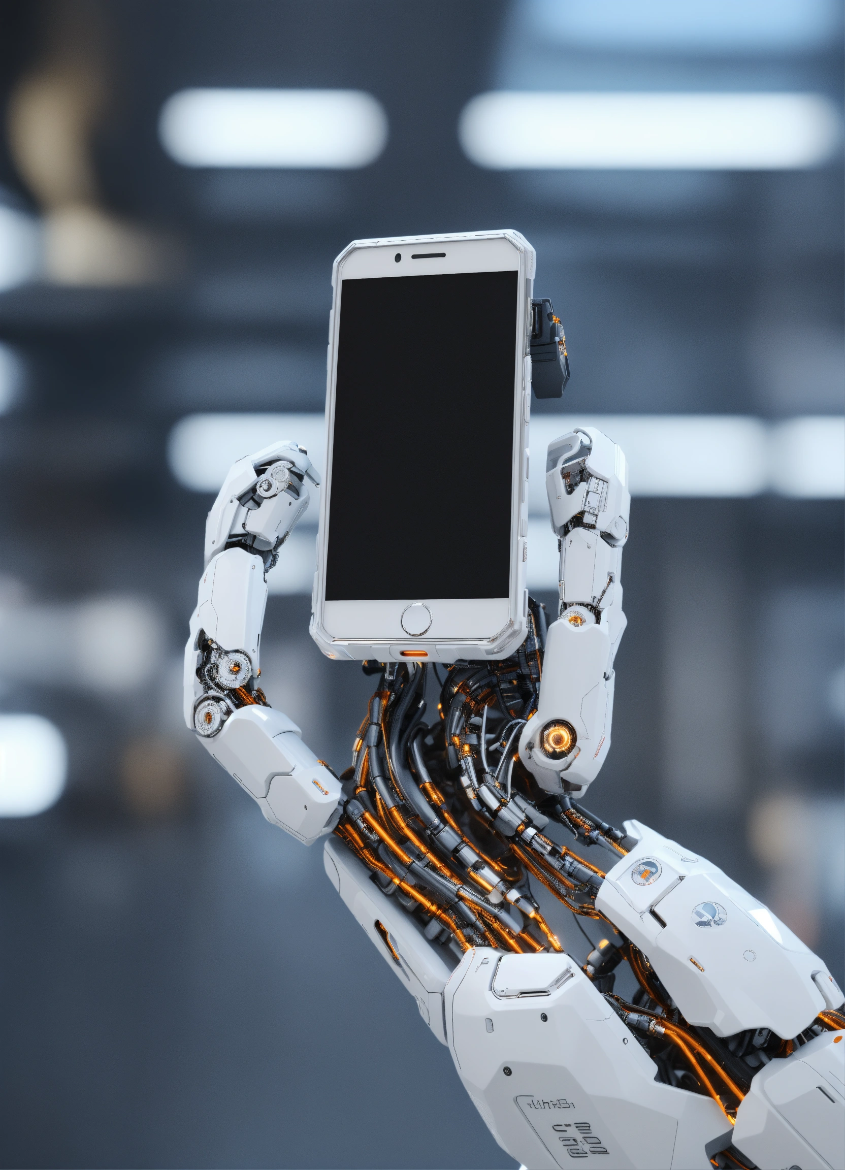 White humanoid cyborg arm holding smartphone