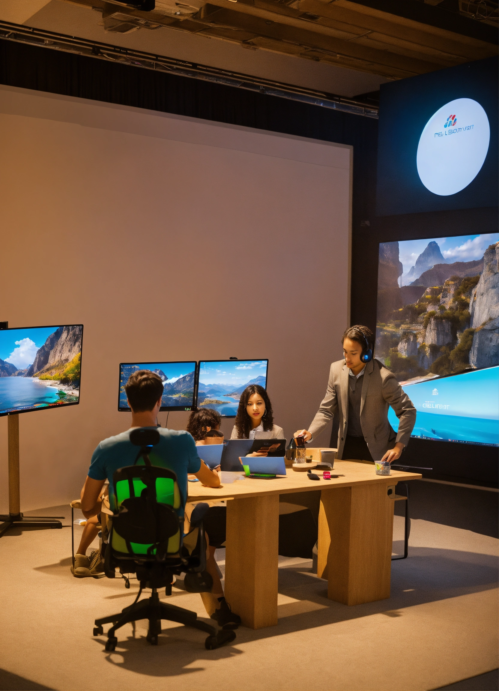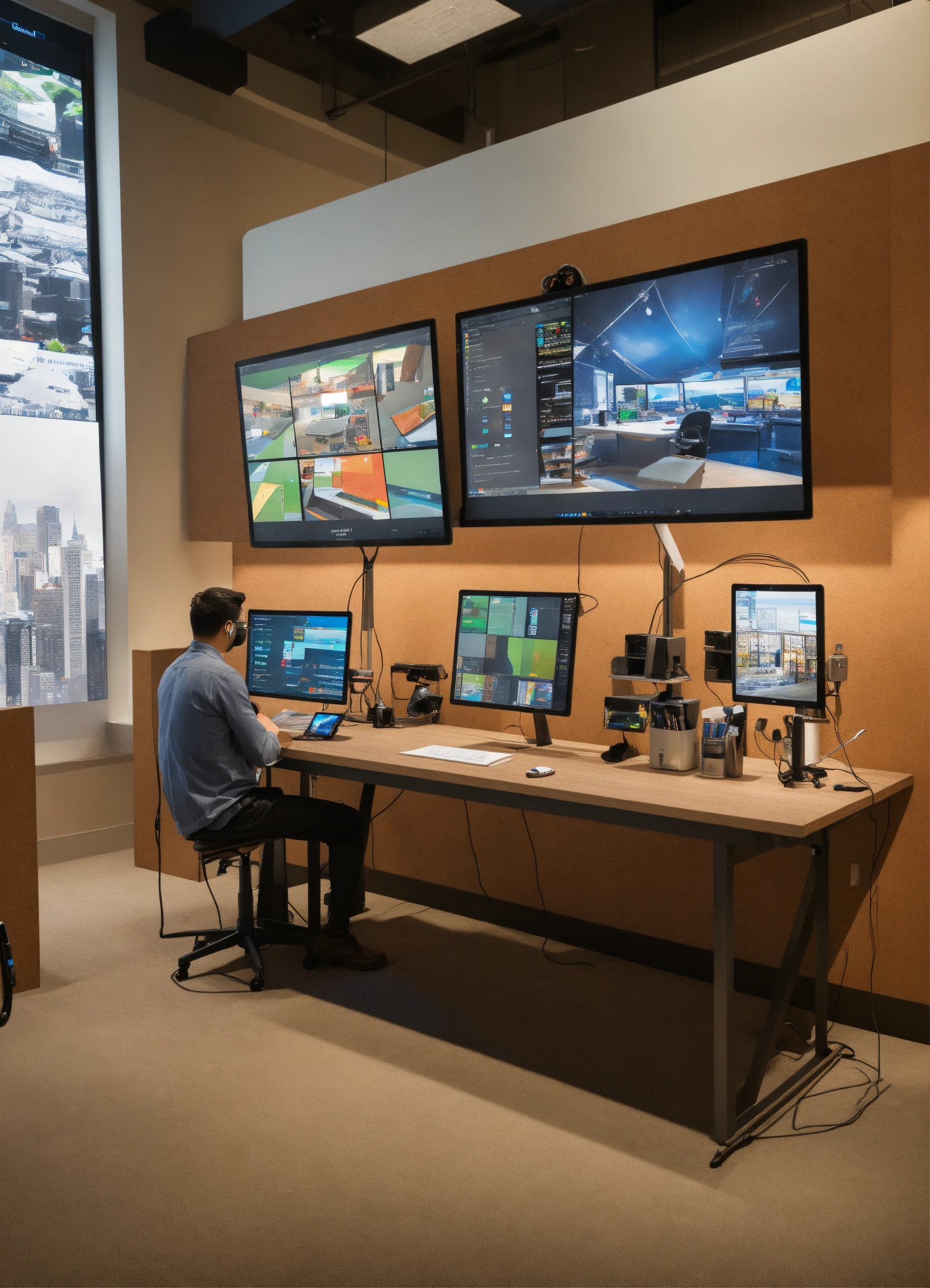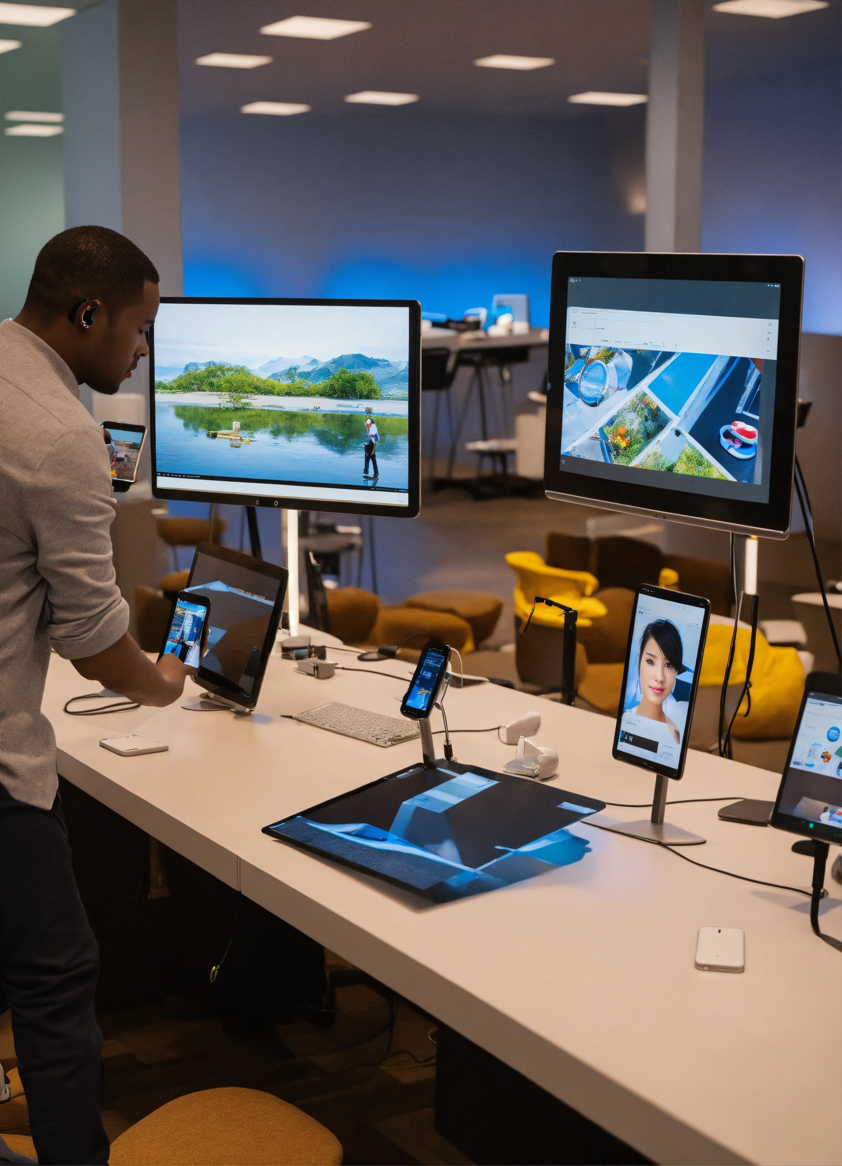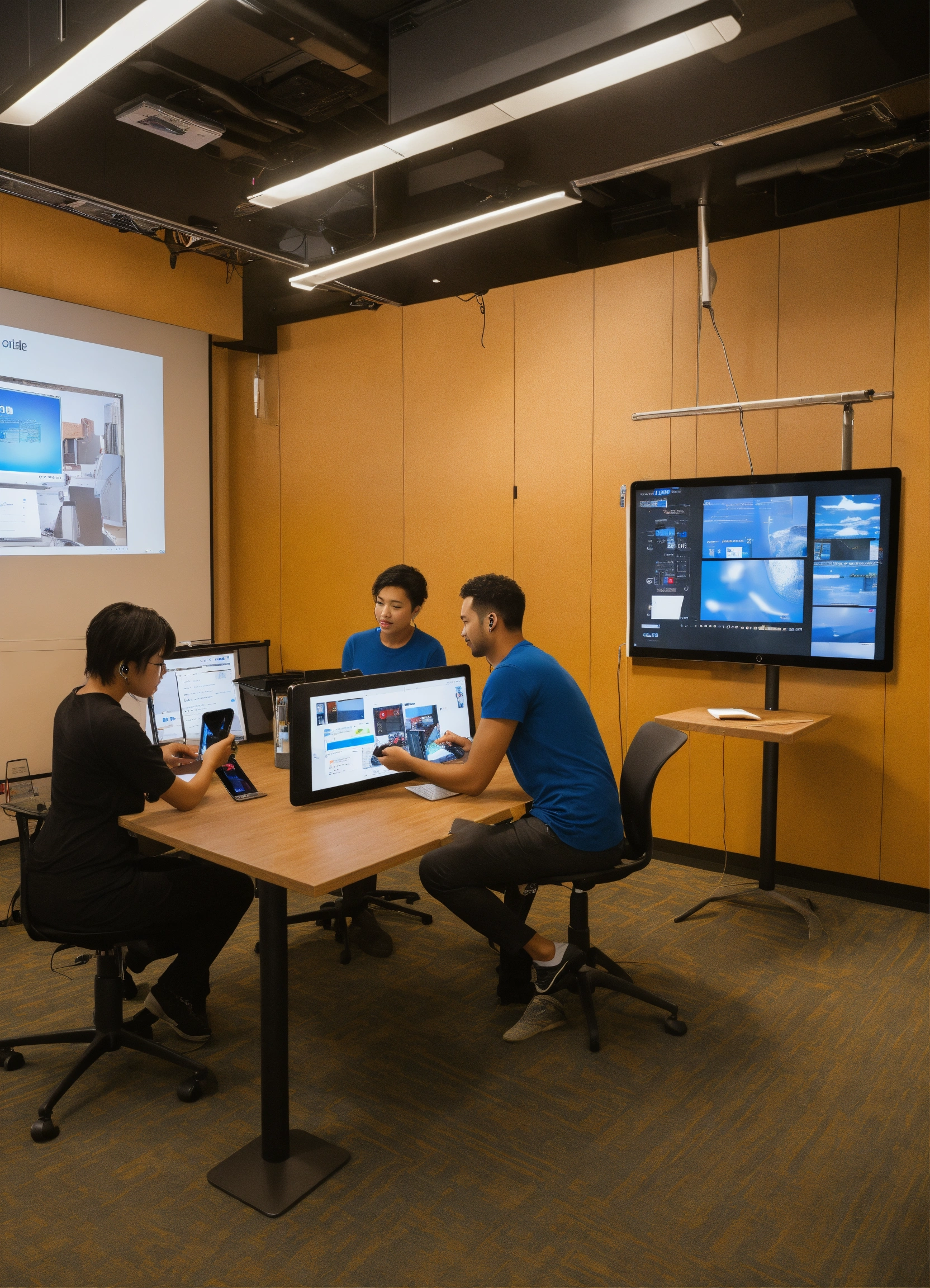 Create a workstation where two person serves, where there is a cell phone a tablet demonstrating visuals, giant monitor