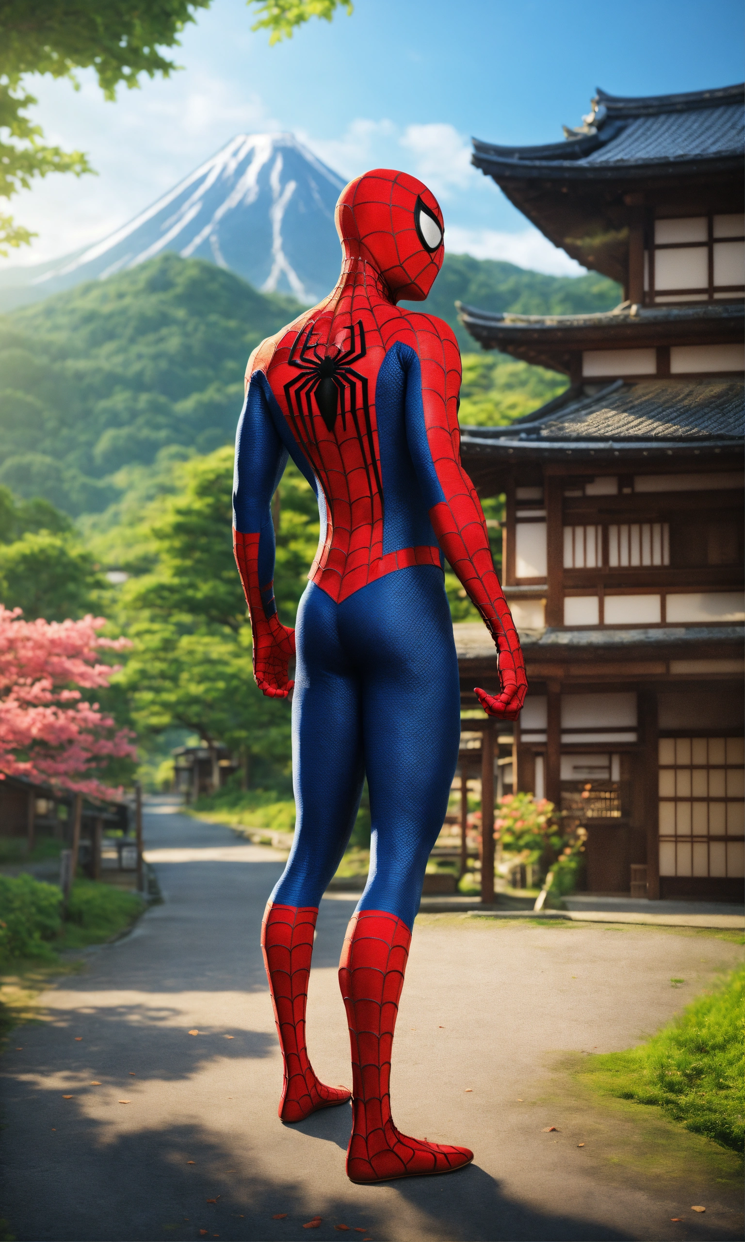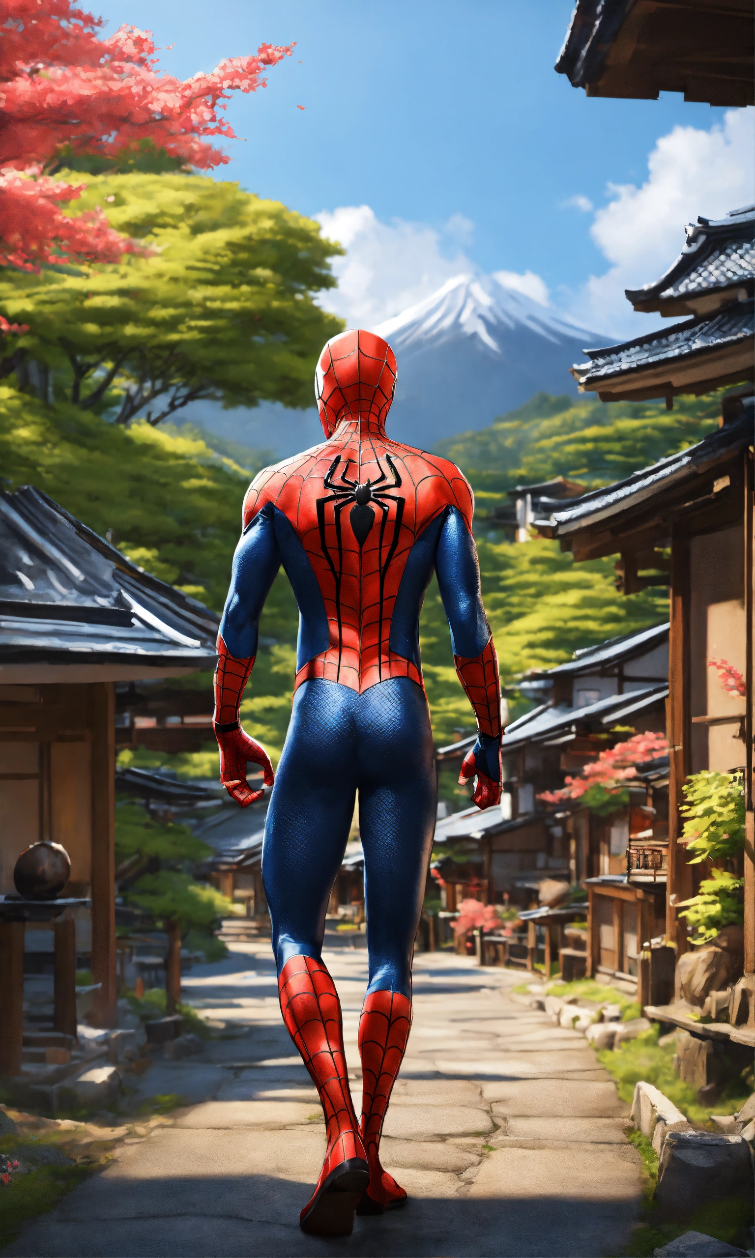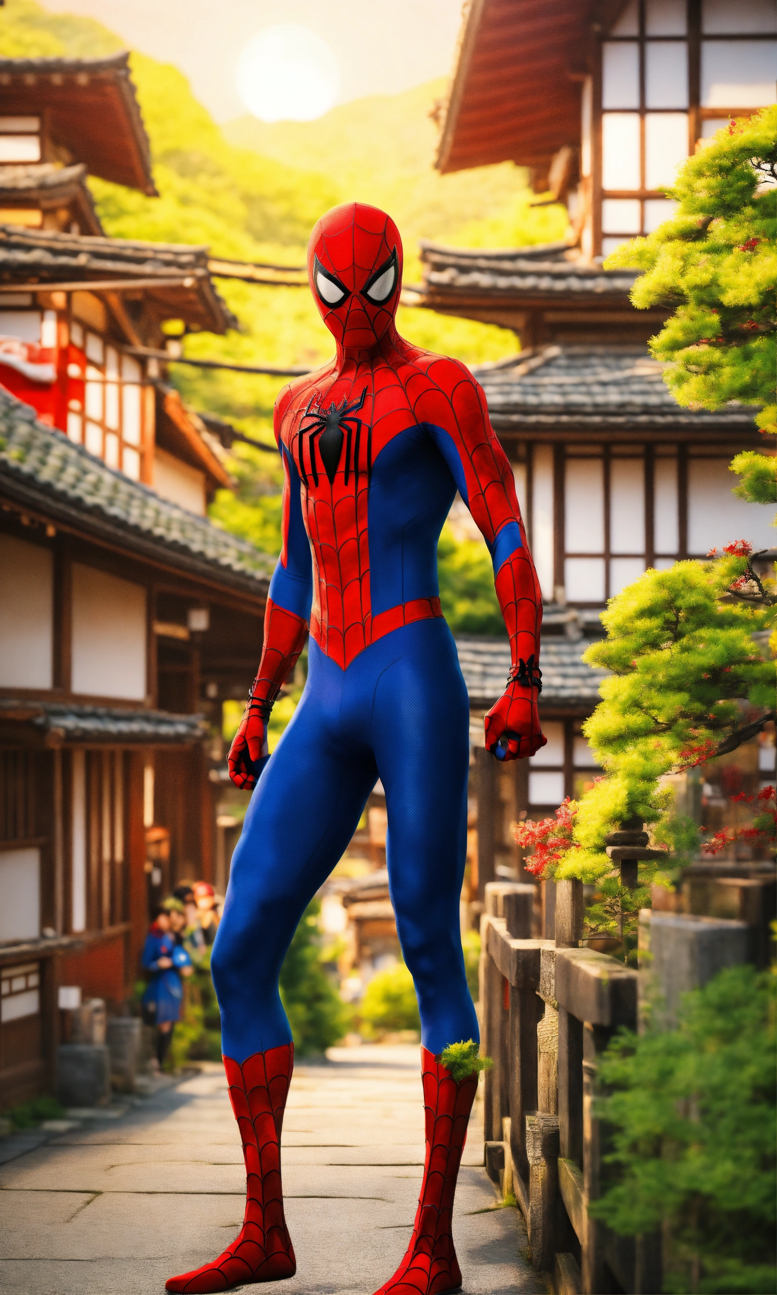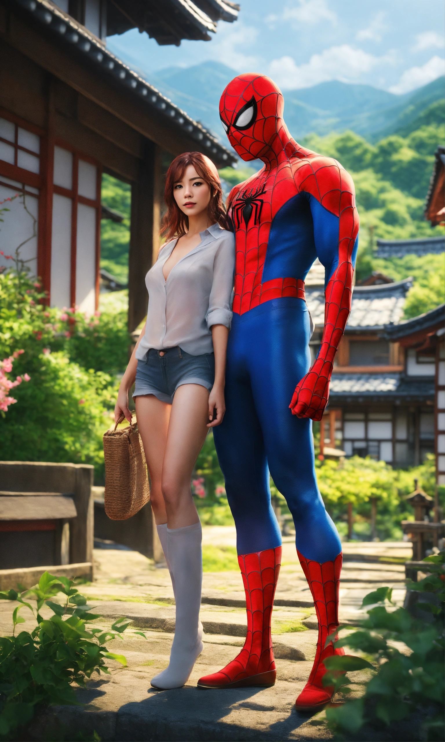 Spiderman his hot girlfriend standing in a beautiful village of japan, nature background, 2d render, realistic