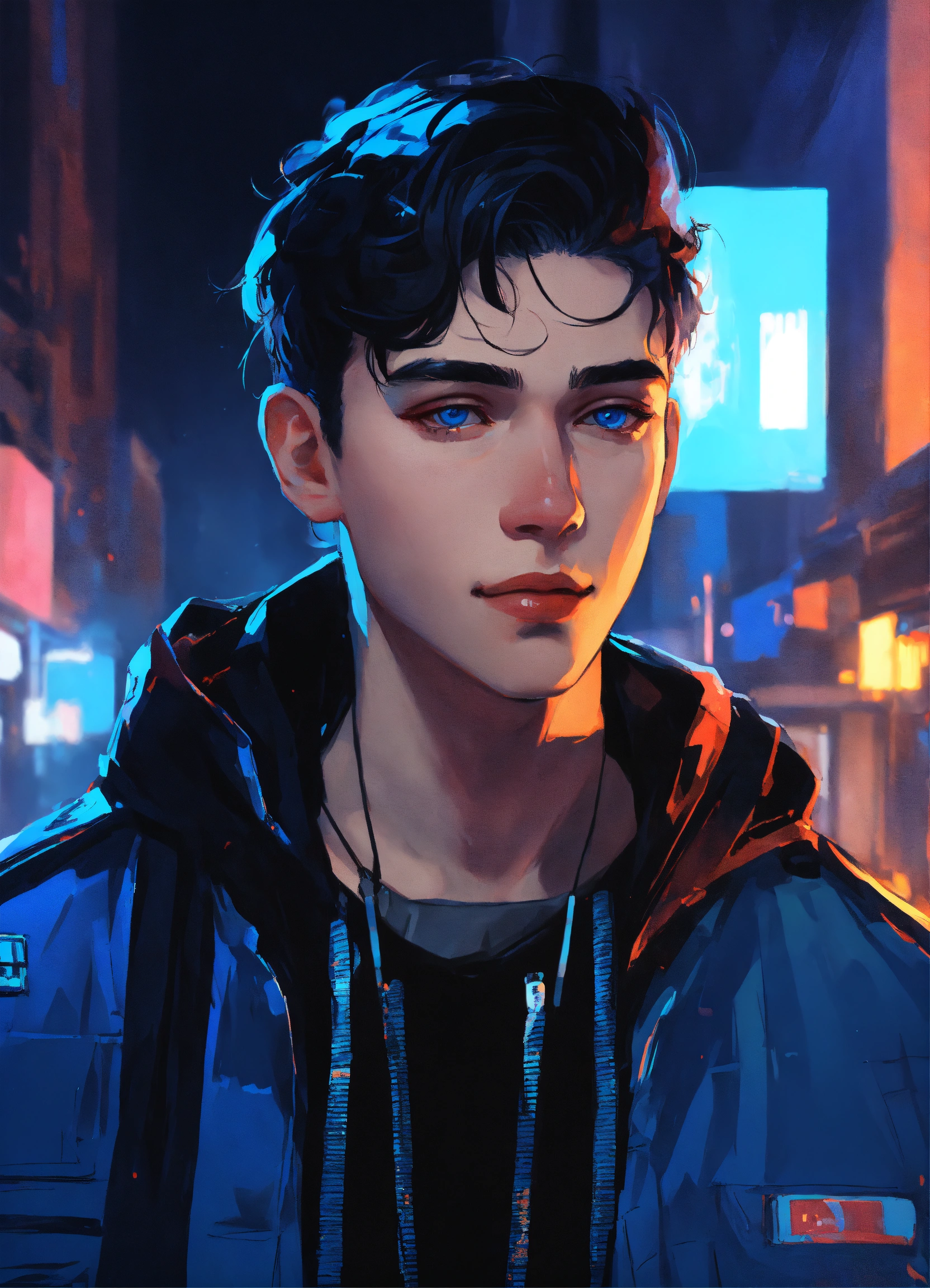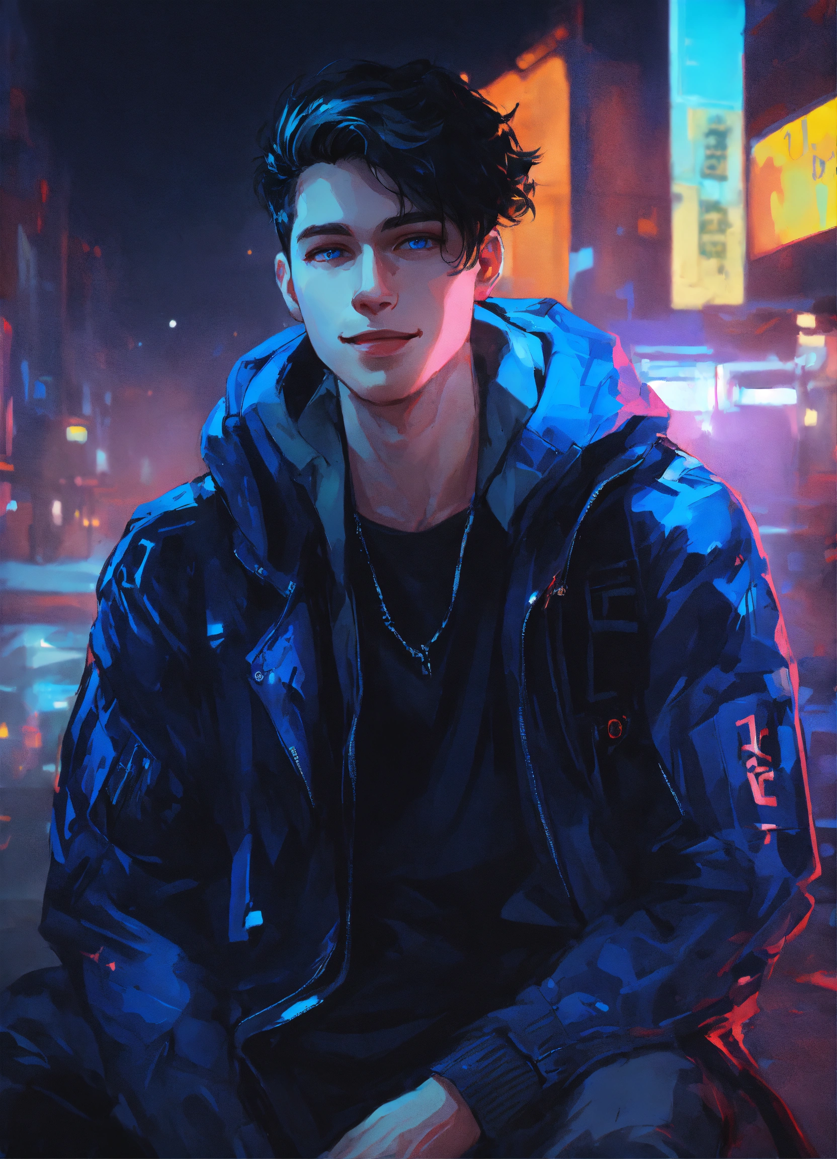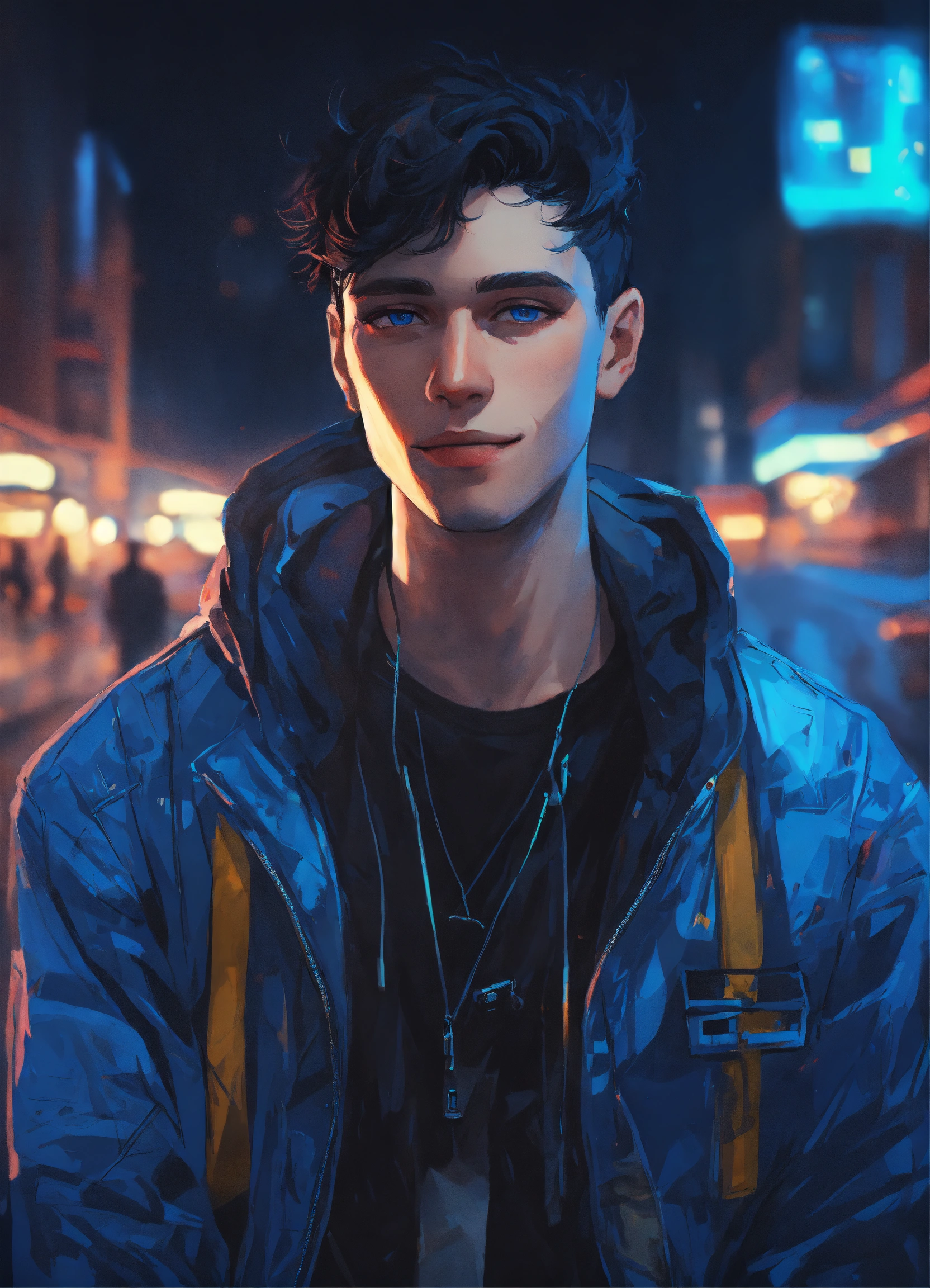 Night time portrait of pale russian young man 27 years old, smile, blue eyes, dimples, black hair, wearing blue and black streetstyle jacket, artwork style by atey ghailan, black, grunge aesthetic!!! cyberpunk background