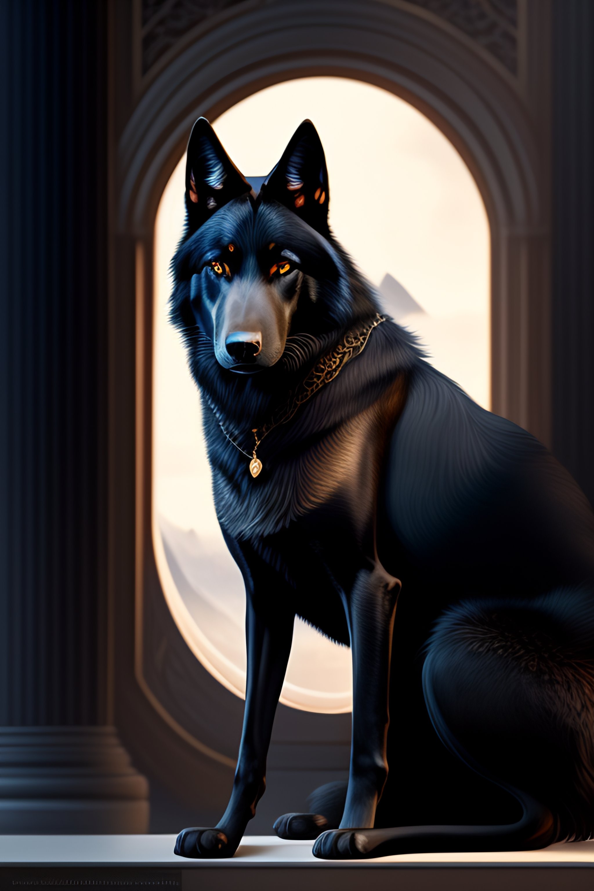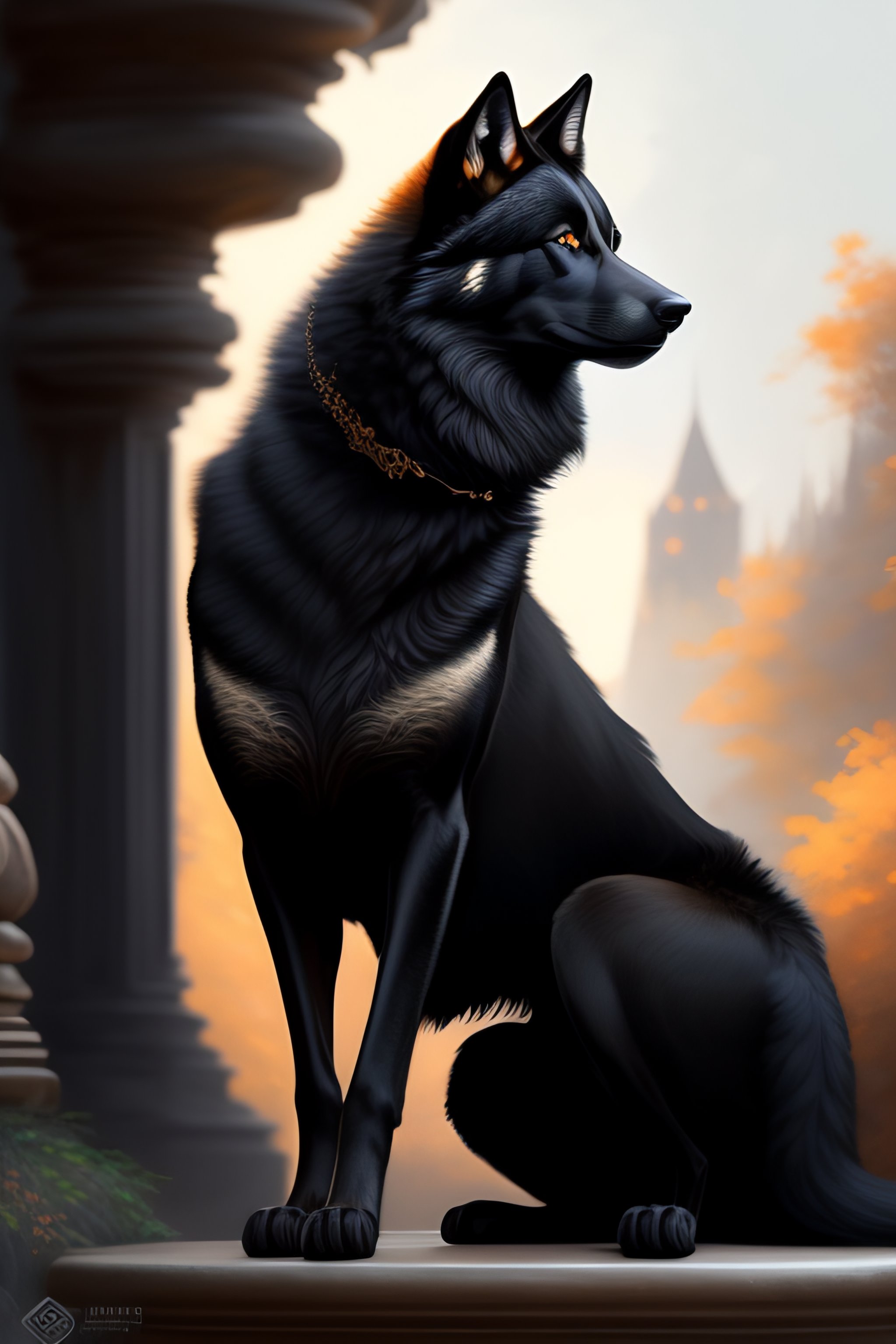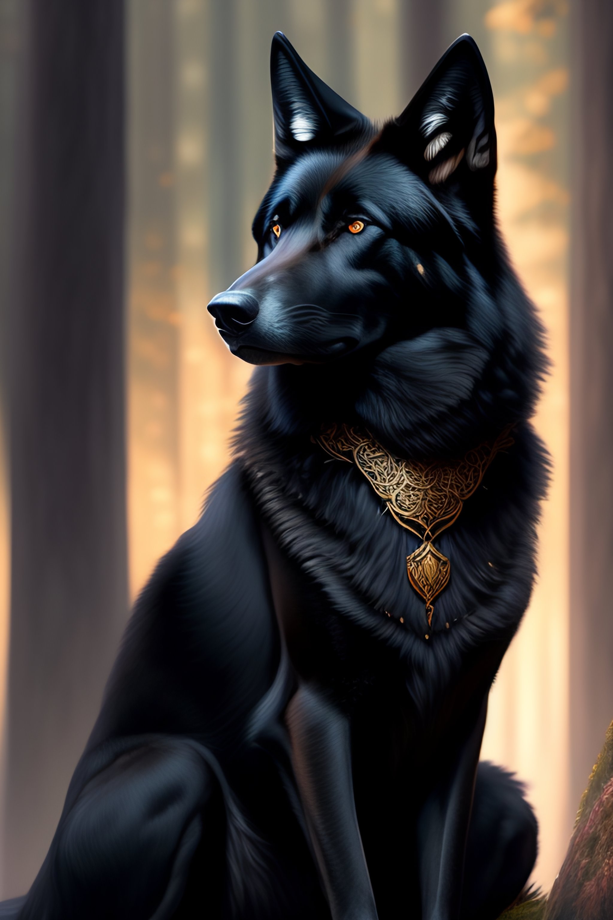 A black wolf sitting looking forward, art nouveau, d&d, fantasy, elegant, highly detailed, digital painting, artstation, concept art, matte, sharp focus, illustration, art by artgerm and greg rutkowski and wlop