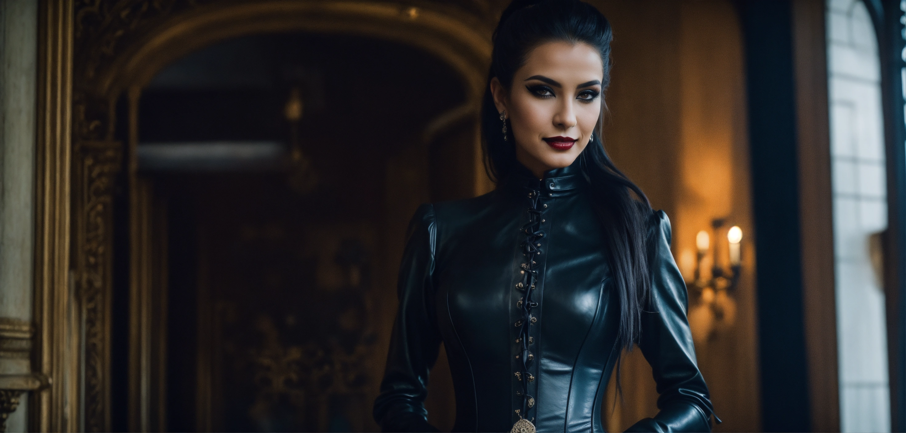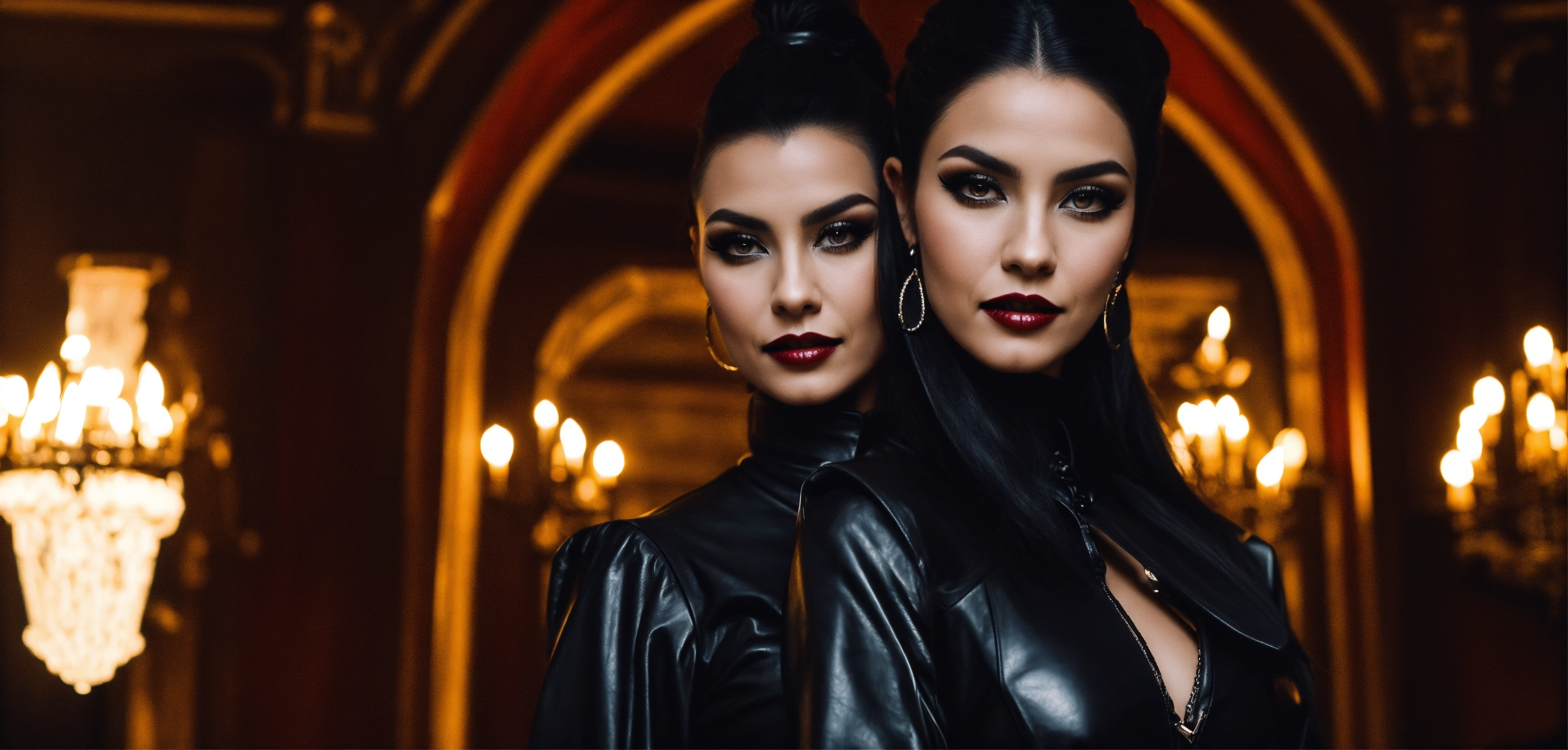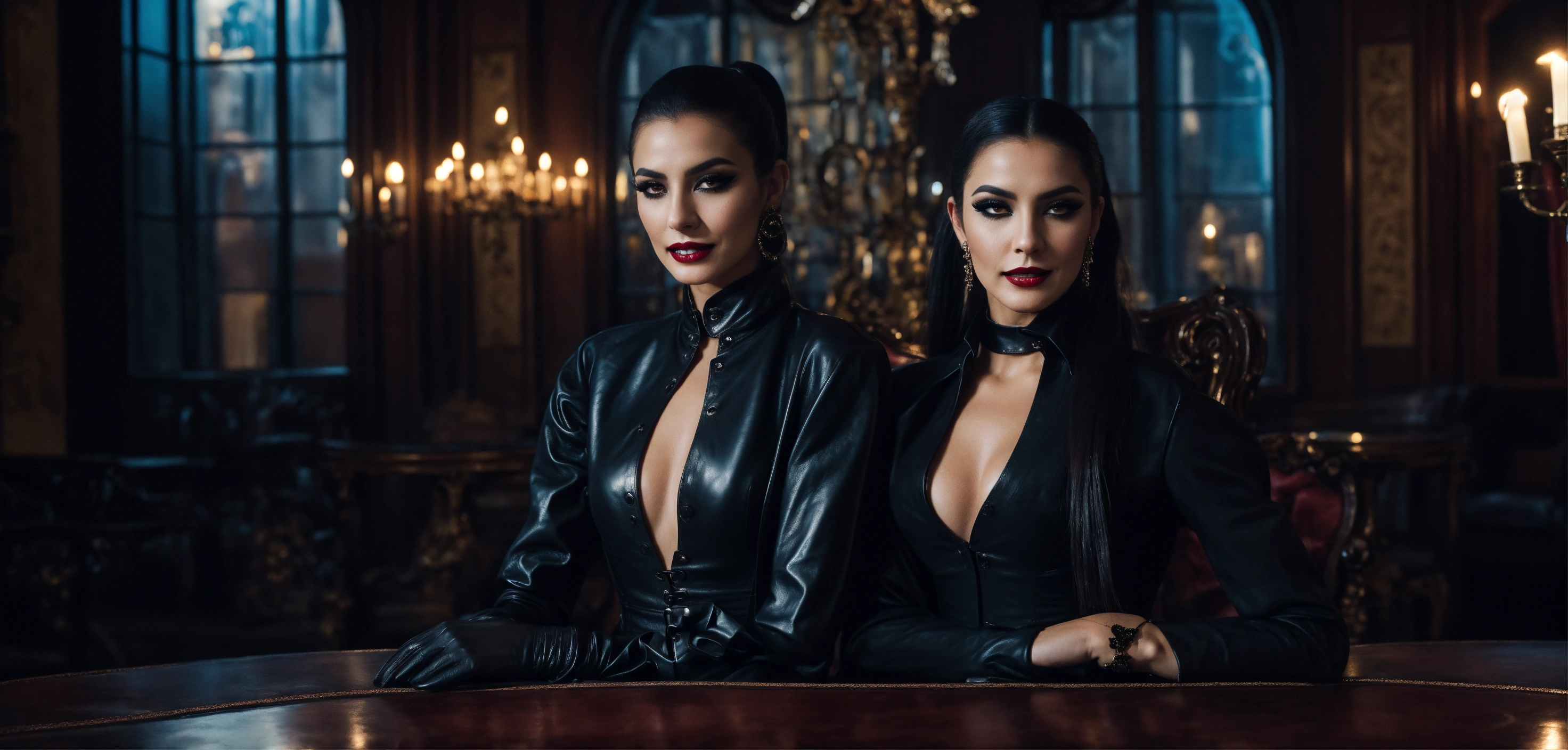 Cinematic look, two stunning arab seductress women fashion model, arrogant evil smile from above showing vampire teeth, black straight hair very high ponytail, black leather corset, long strict victorian governess wide black long leather shirt dress with long big puff sleeves and big buttons, mansion hall at night haze, white office shirt collar, leather gloves, eyeliner makeup, black leather boots, underworld vampire movie style