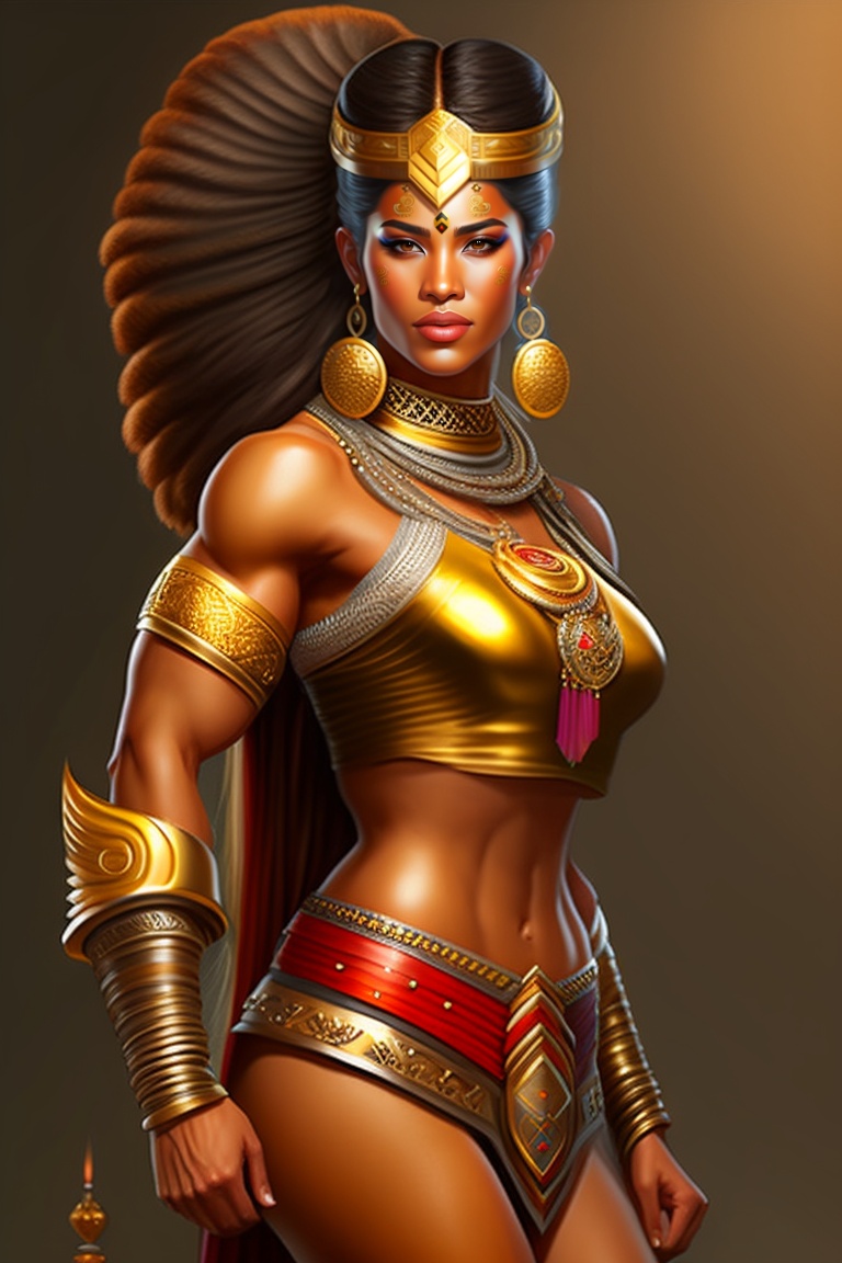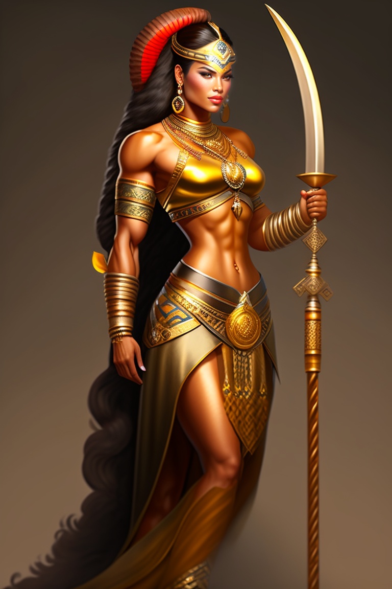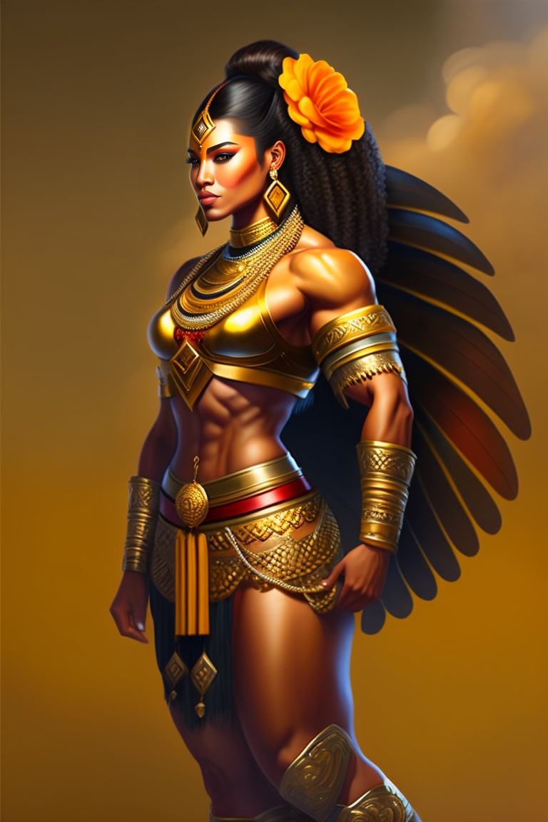 I want a mayan woman warrior, muscular, realistic full body illustration, with clothes in gold color with a snake in his hand