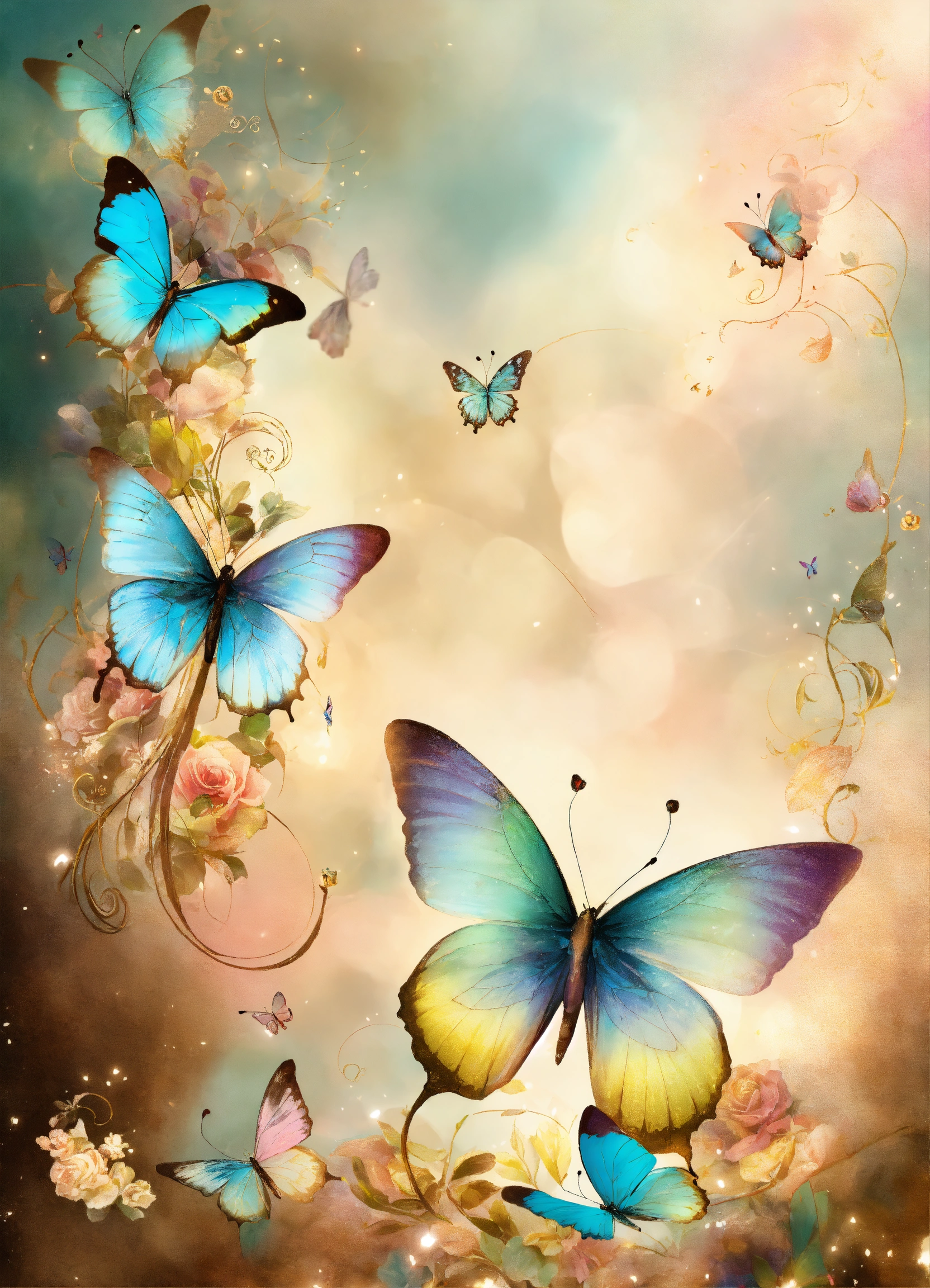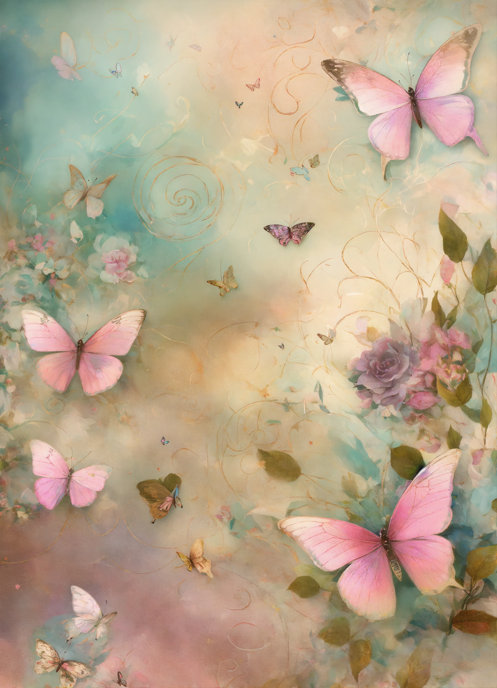 Shabby chic dreamy mist pastel junk journals graceful flutter butterflies' delicate and graceful flight patterns make them a symbol of beauty and elegance, swirling magical fairytale abstract art style