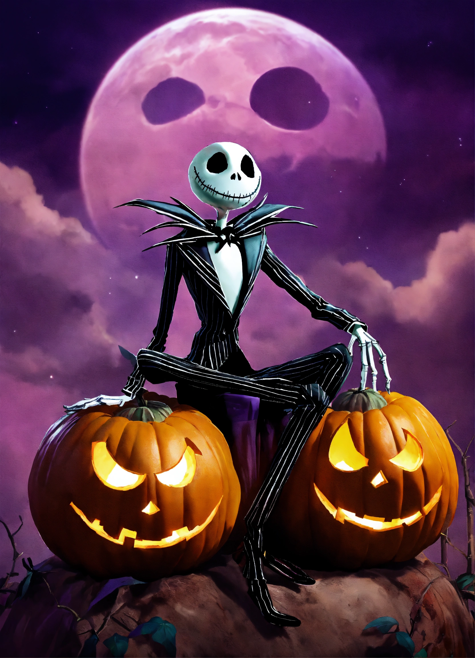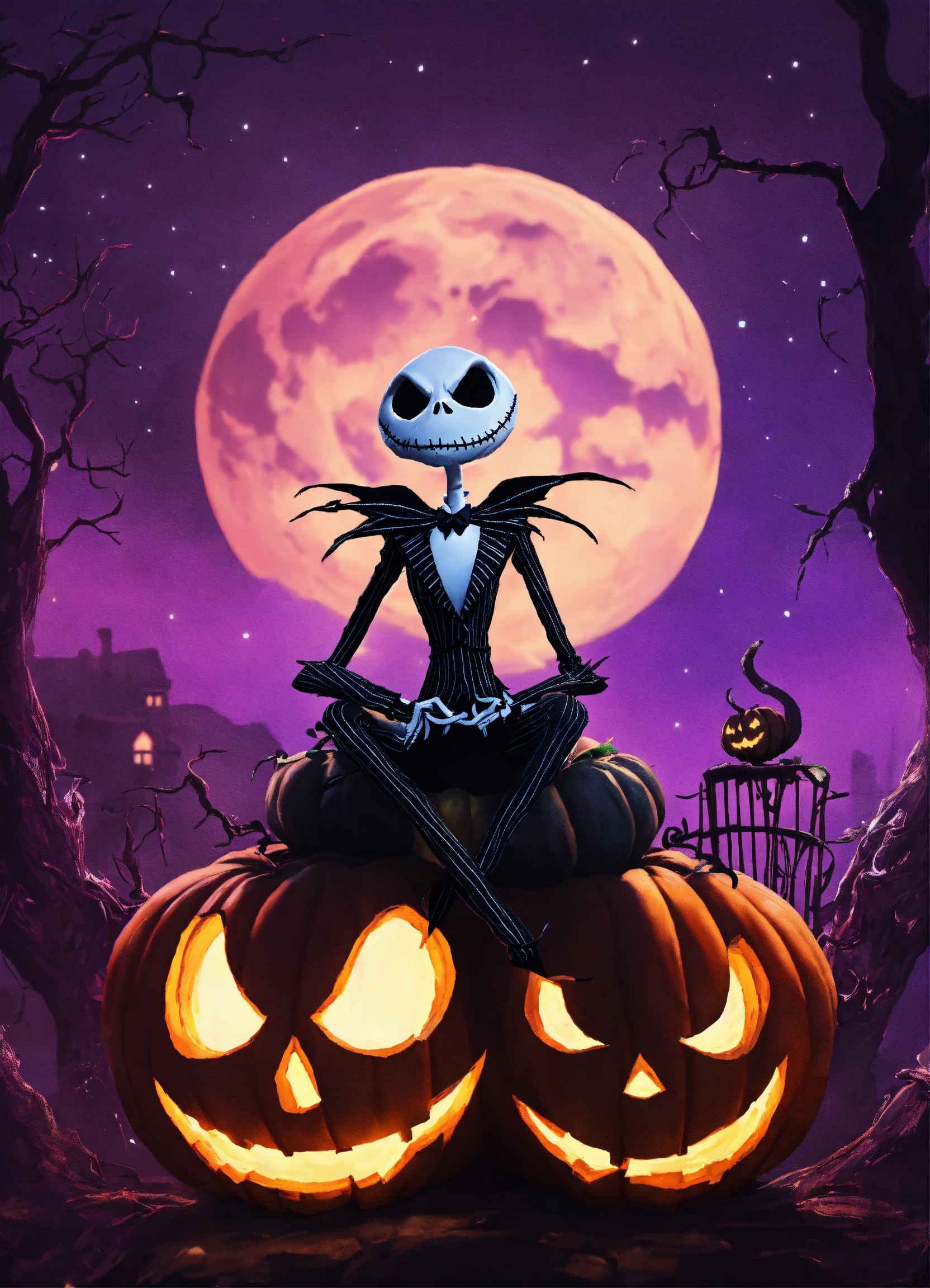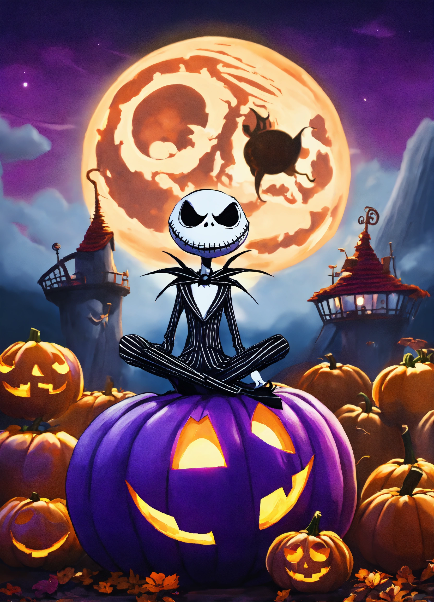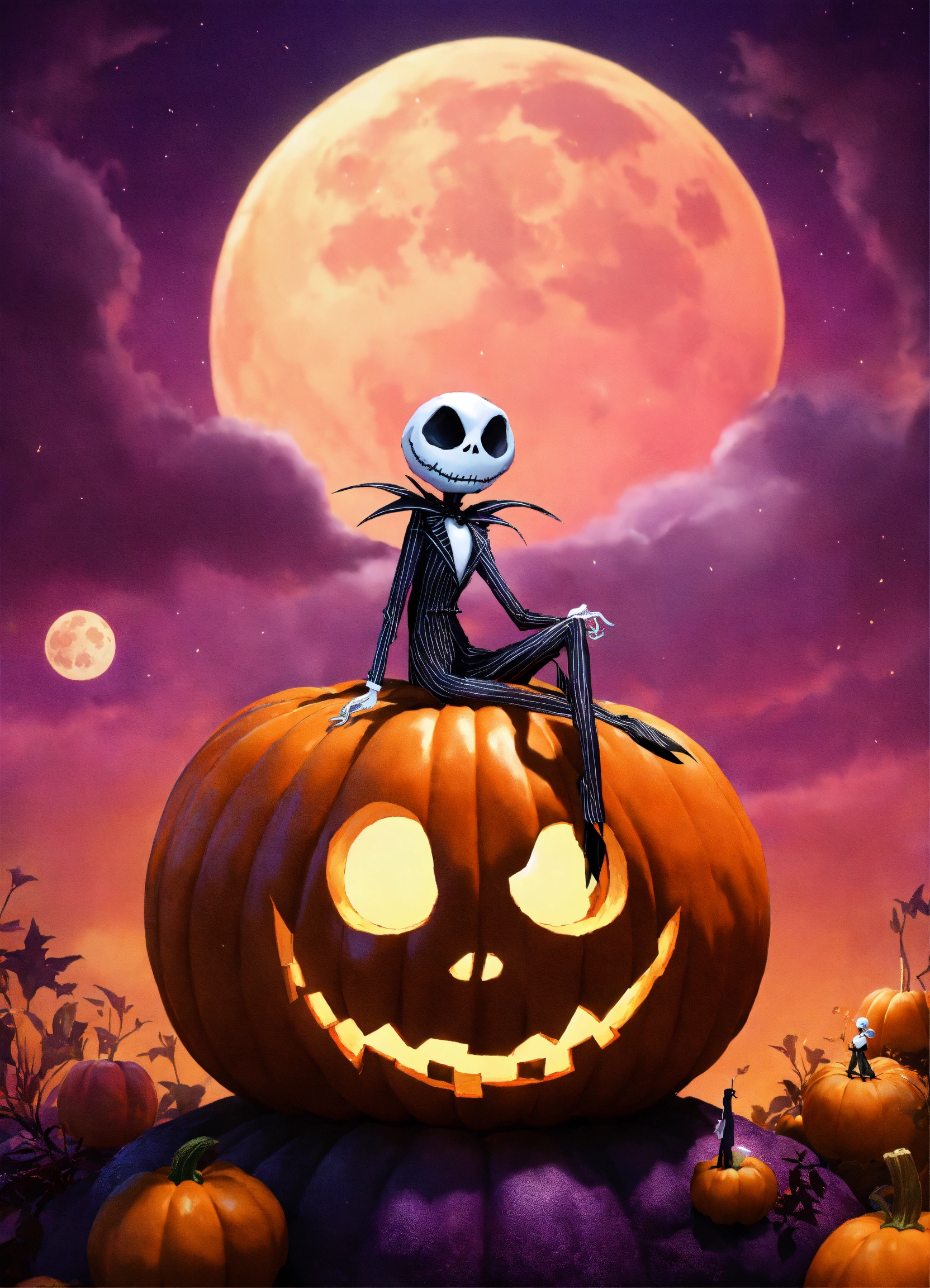 Jack skellington sitting on top of a huge pumpkin with a huge moon and a purple sky