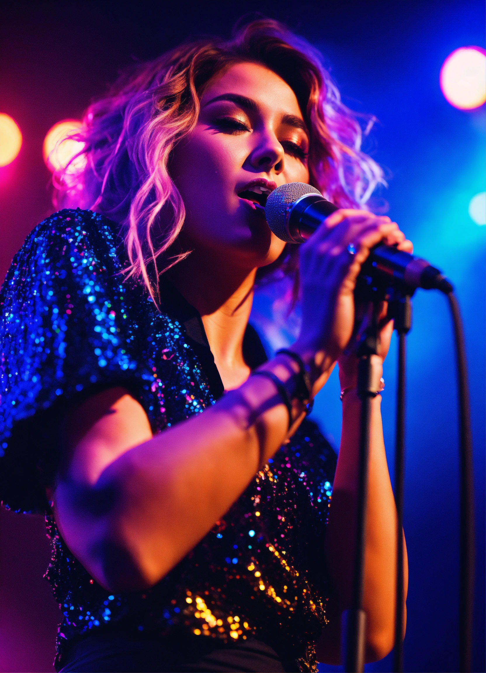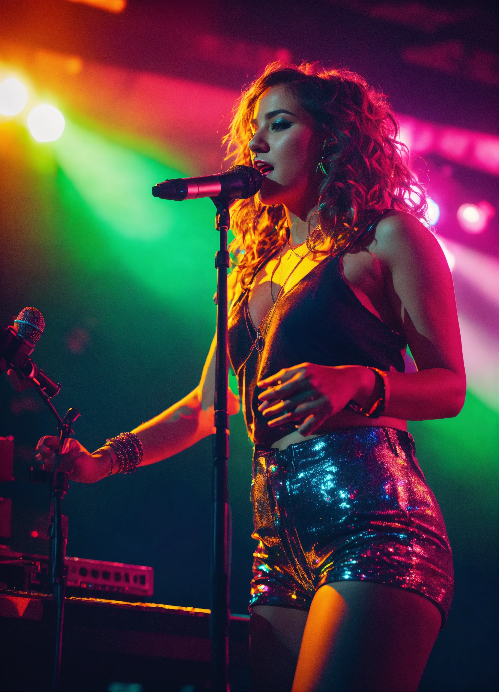Cinematic photography, modern, female singer on stage performing, neon colors, realistic details, ultra 8k resolution