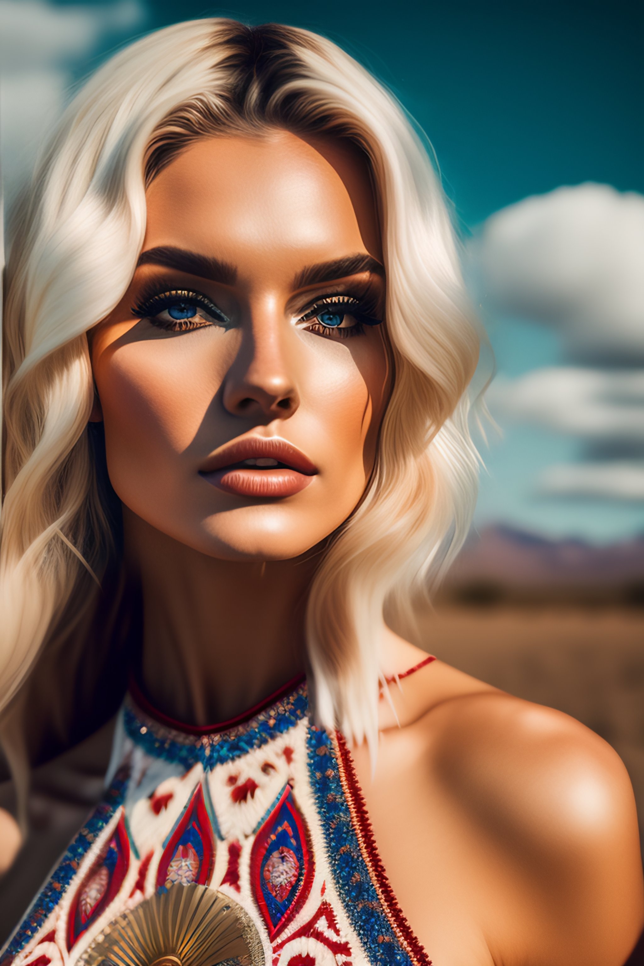 Realistic photo of a russian women photoshoot in palace, full body portrait, two piece, coachella outfit, stringy material design, feminine, high contrast, strong shadows, with tattoos, blonde, hair partial highlight, flirtatious look