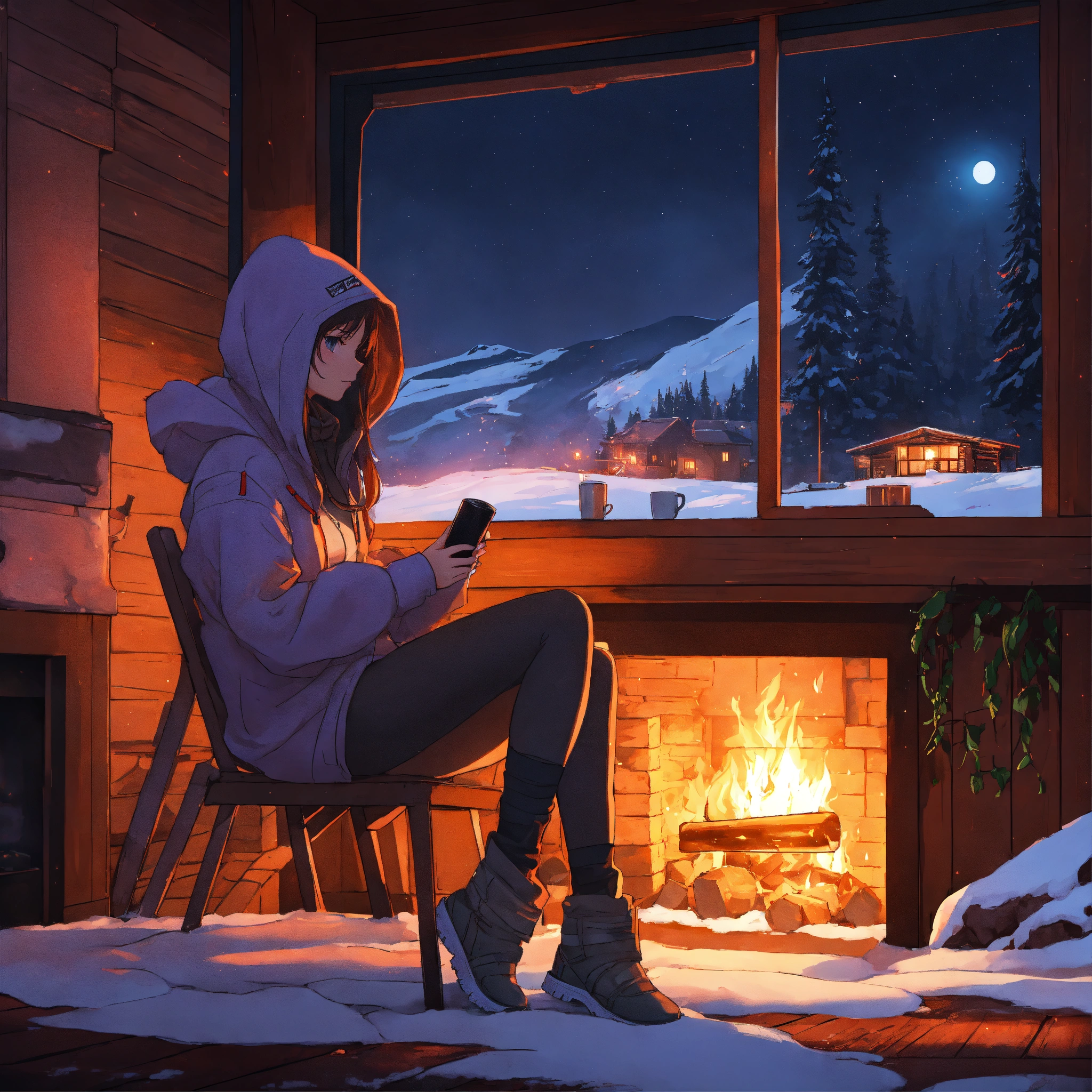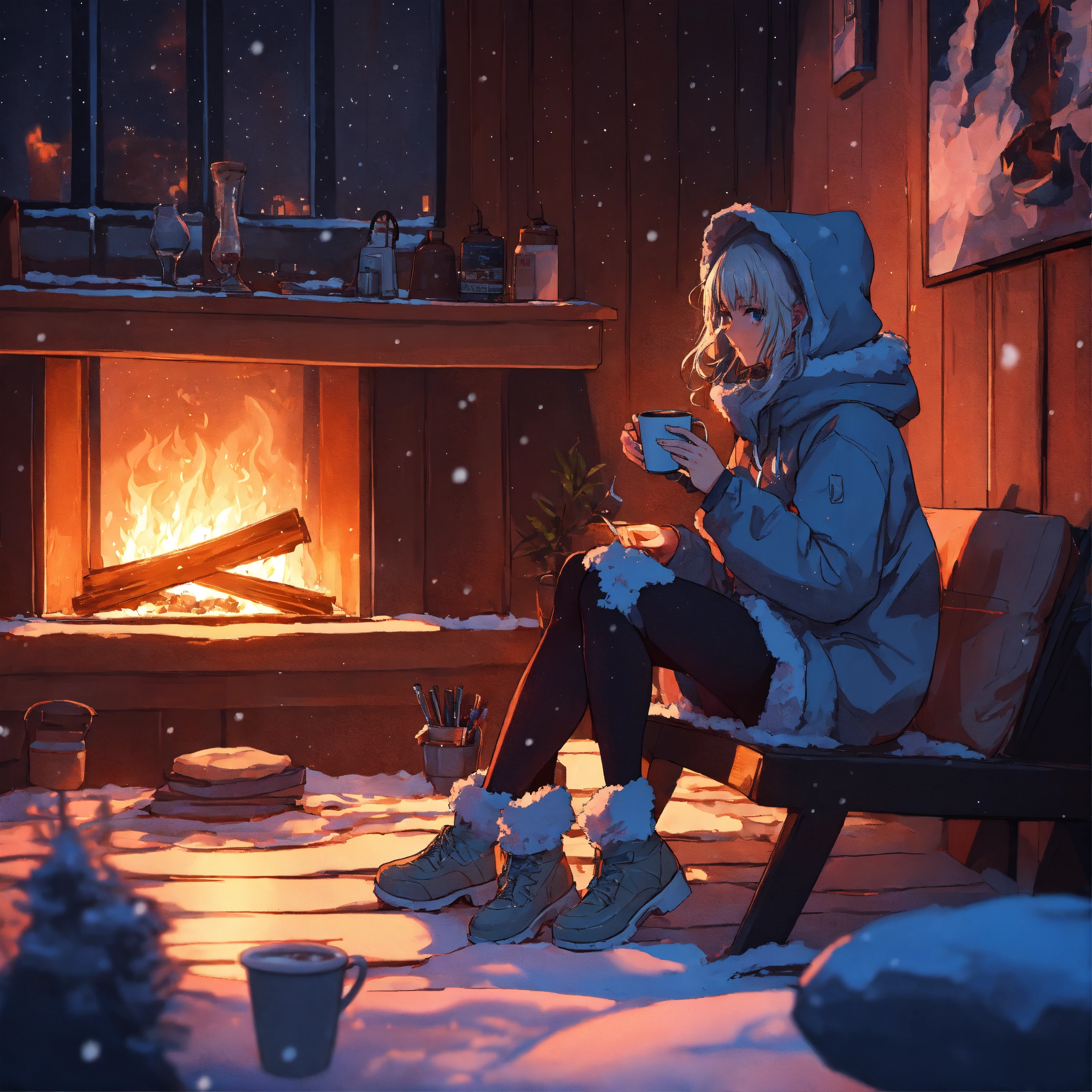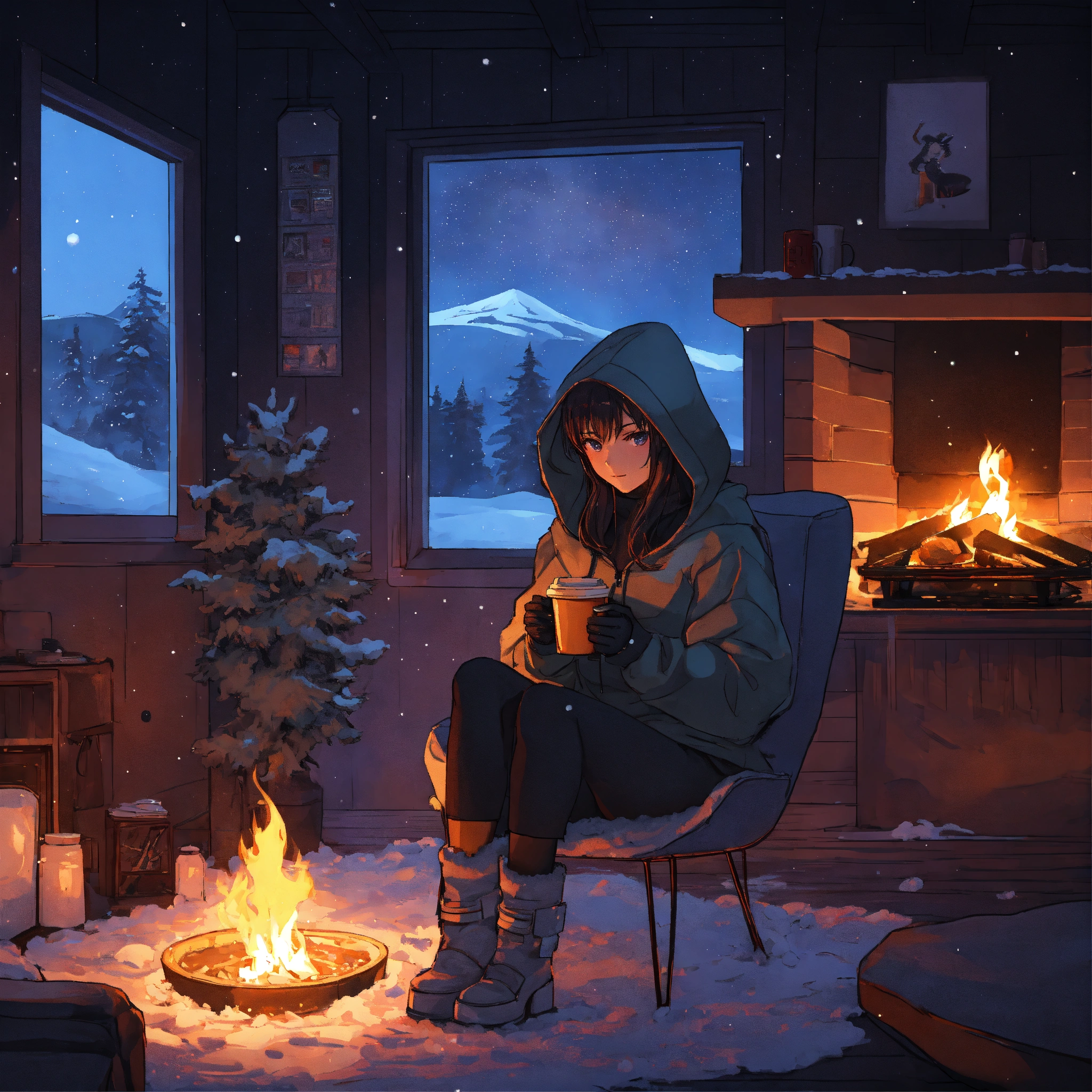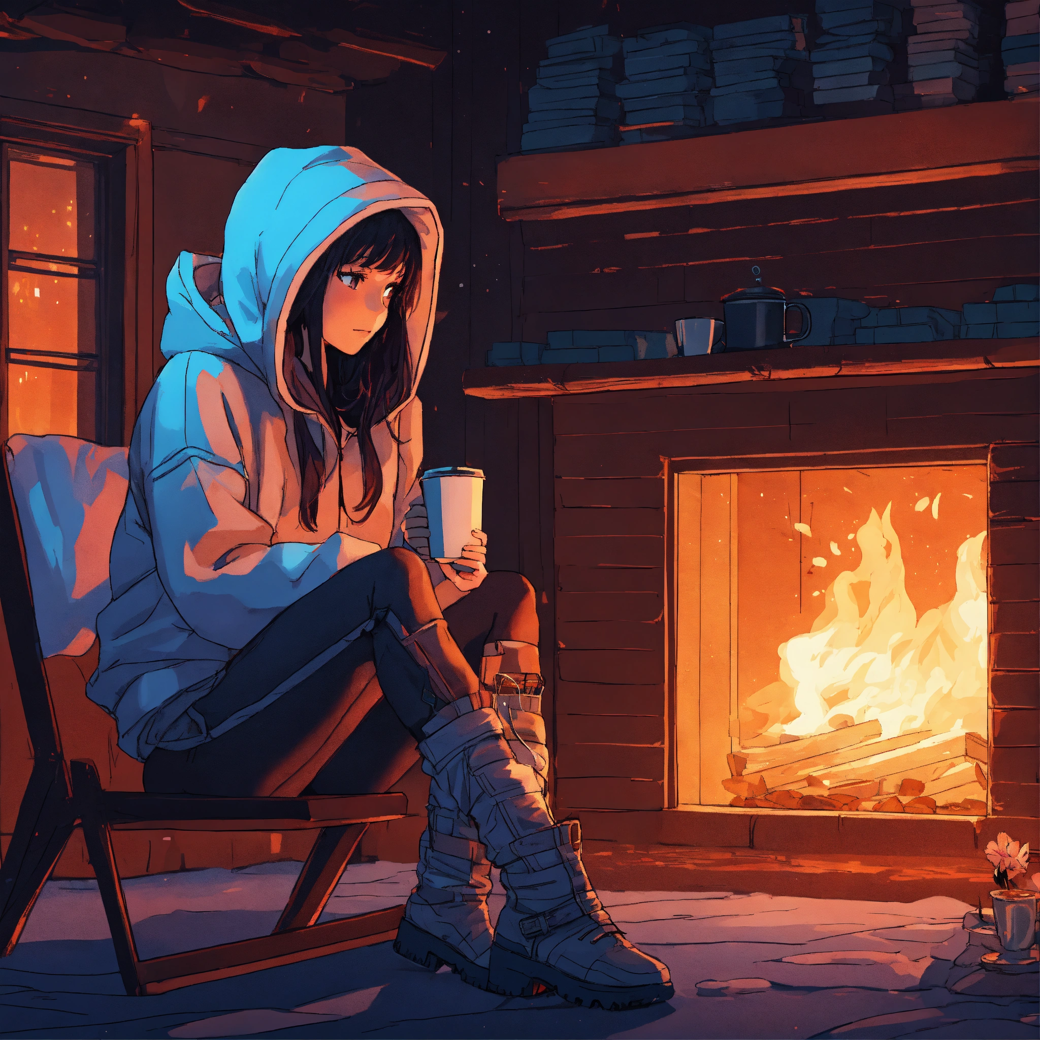 Snowy dark night outside by the fireplace in a cyberpunk cabin in anime style futuristic girl sitting on a chair with her hoodie on holding coffee looking at the fireplace