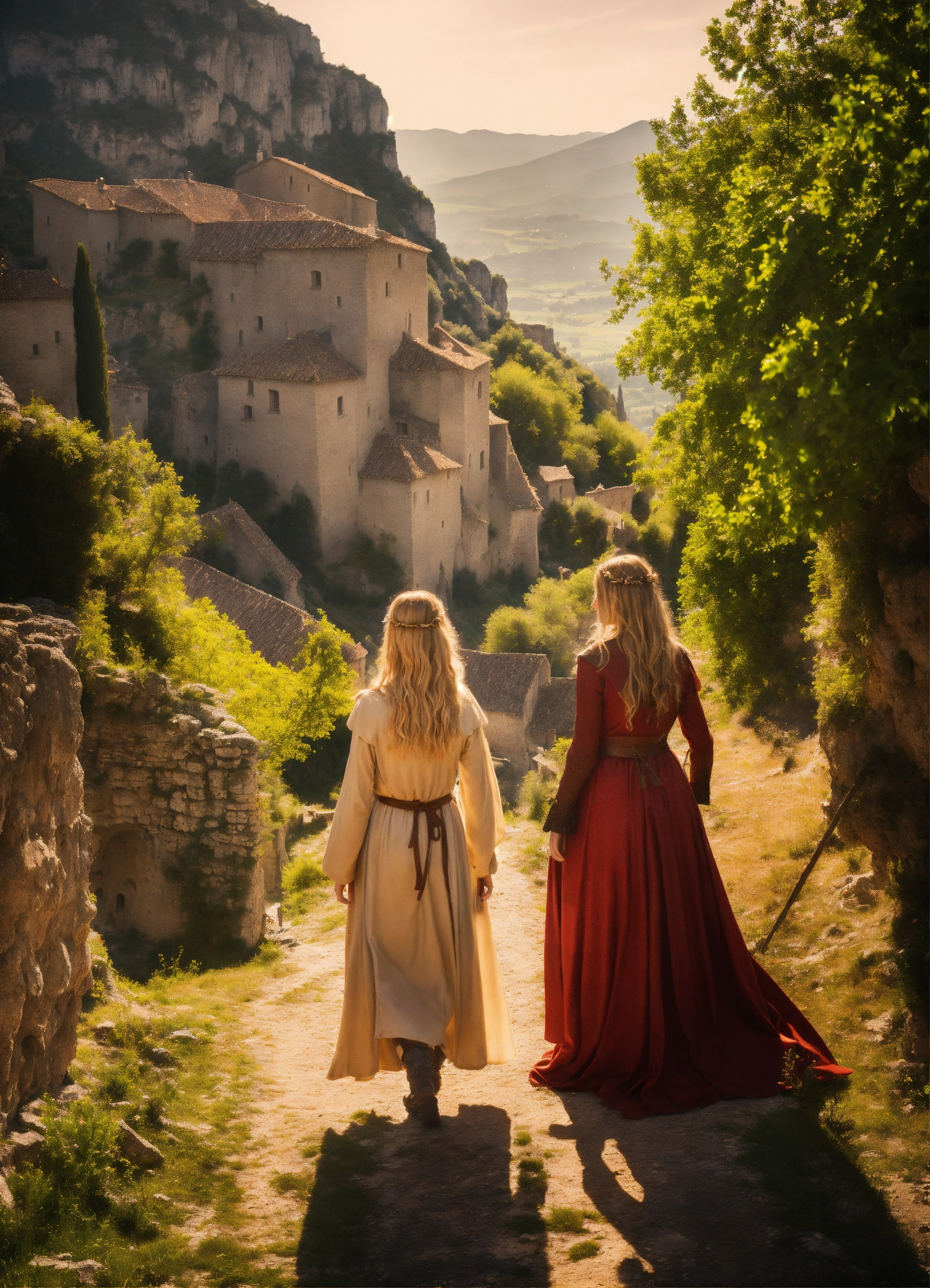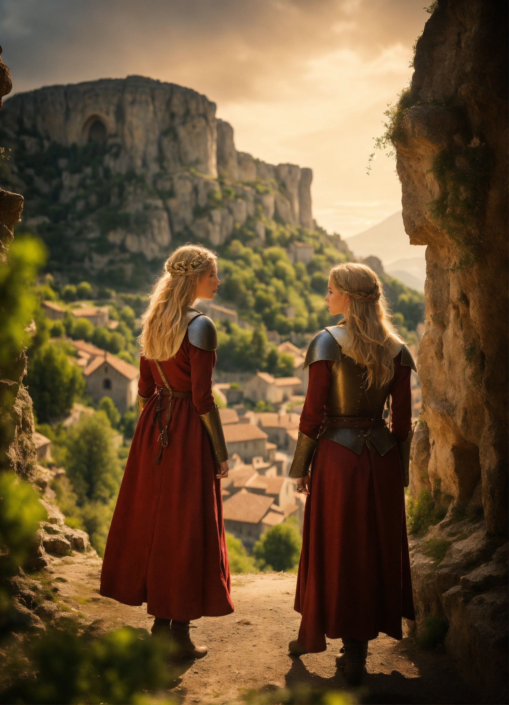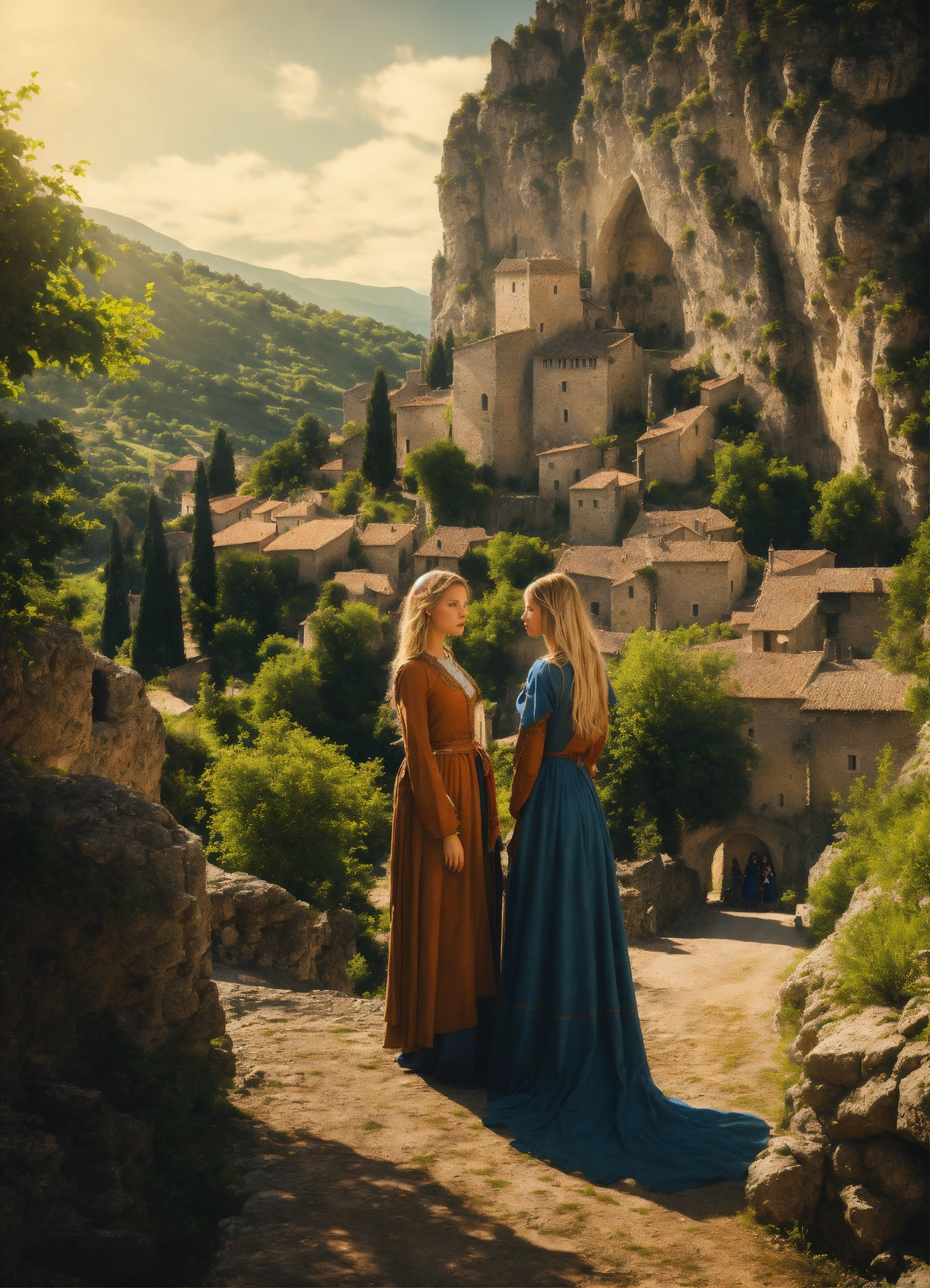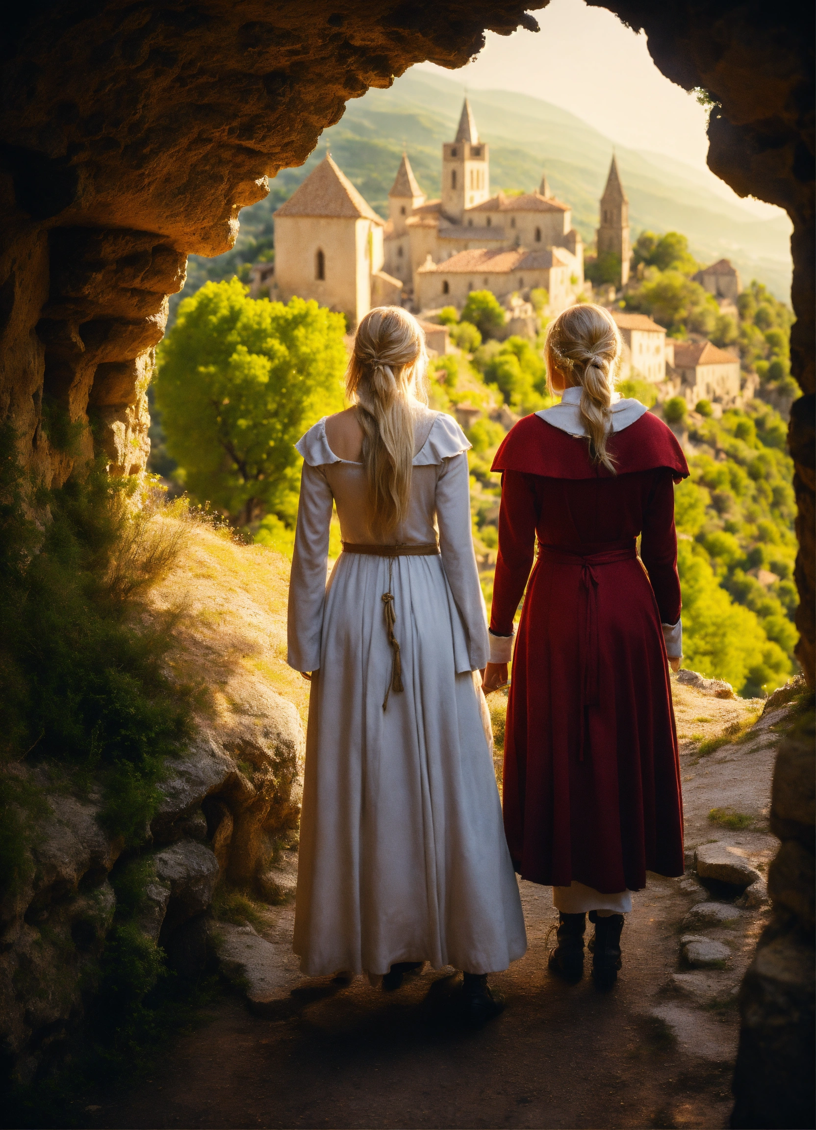 An epic fantasy scene featuring medieval french gorgeous and beautiful blonde and twin sister brunette visiting the village of the cathars near a cave. cinematic view, sharp detail.
