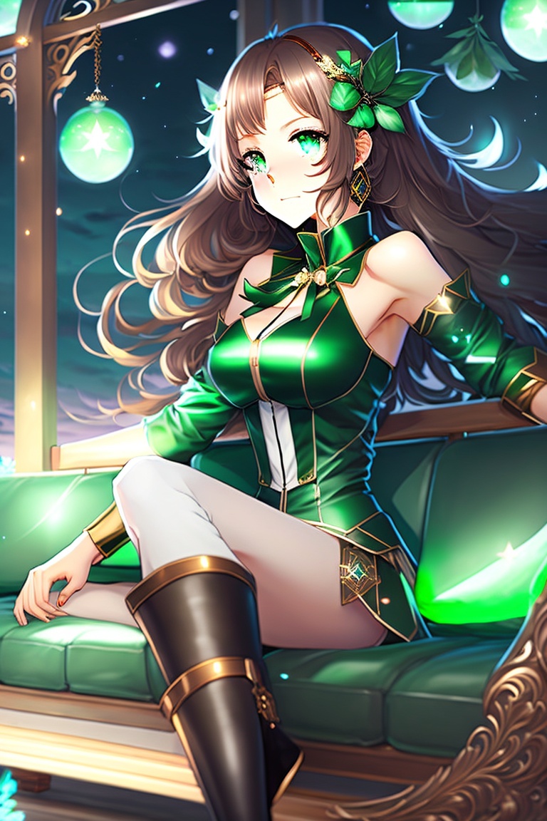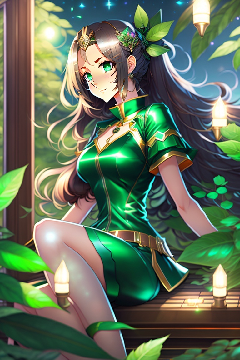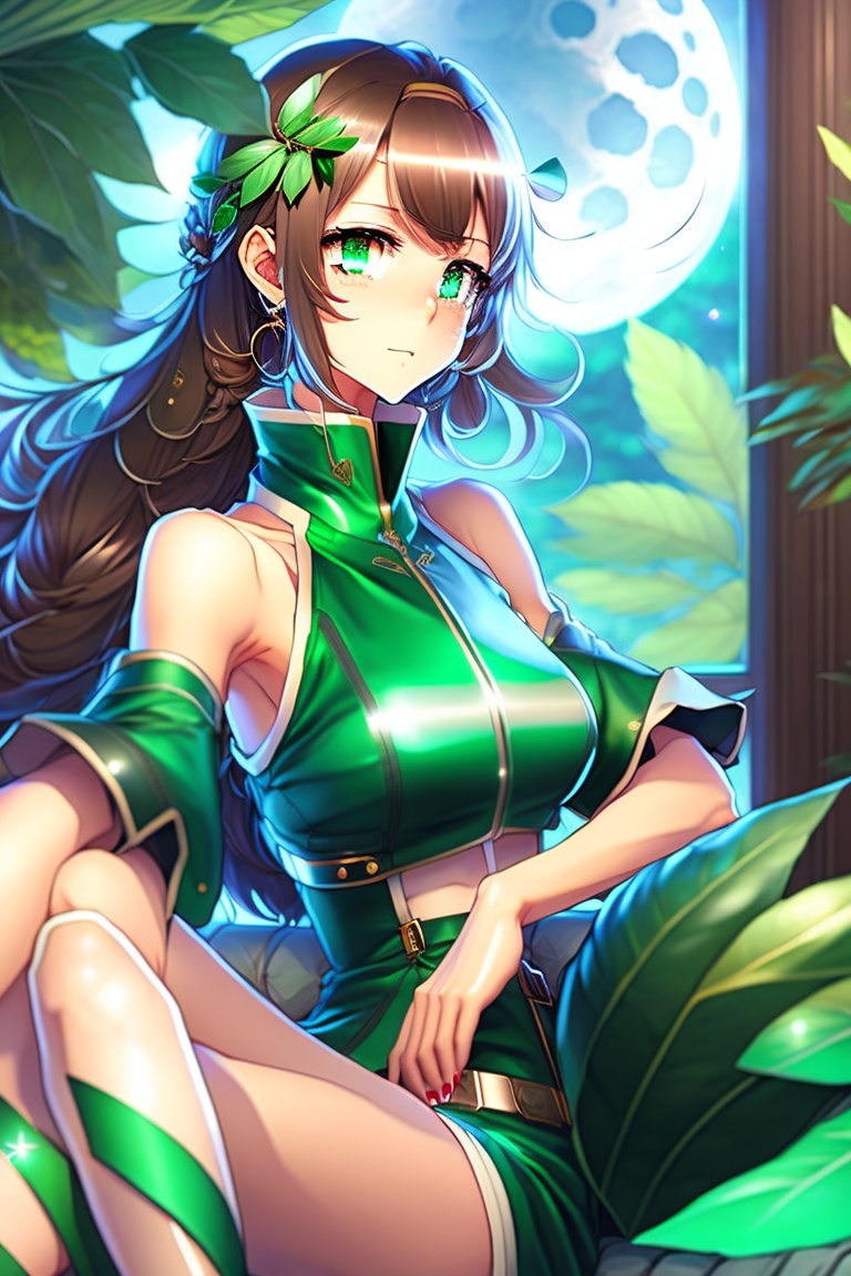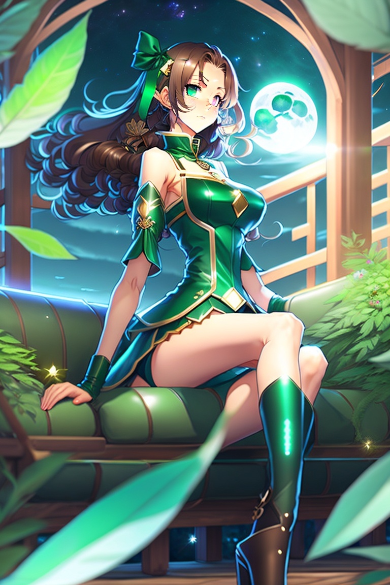 Anime style, 1 girl, dark brown hair, ponytail hairstyle, emerald green transparent crystal female armor, green eyes, perfect body, perfect hands, perfect legs, full body, defined line art, sitting cross-legged on a sofa, in a outdoor balcony at night, full moon high in the sky, wind blowing leaves from trees