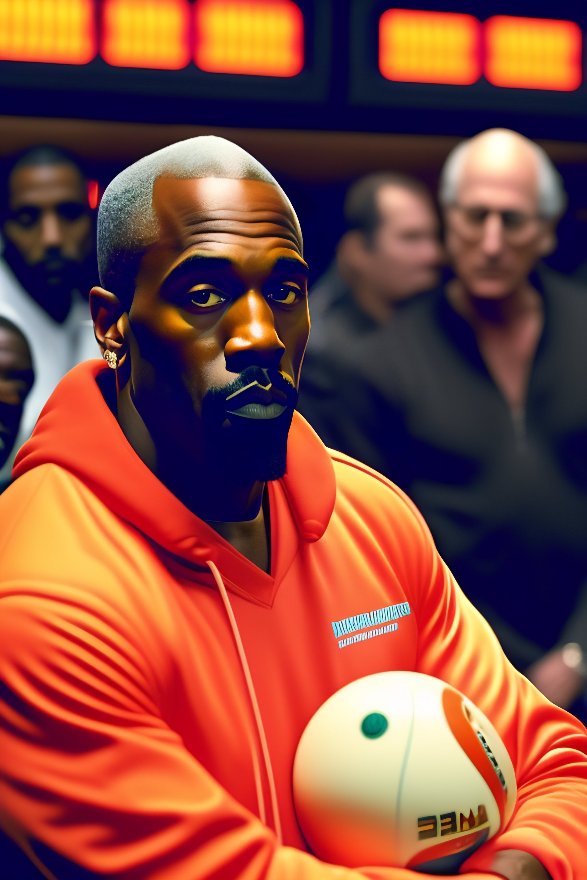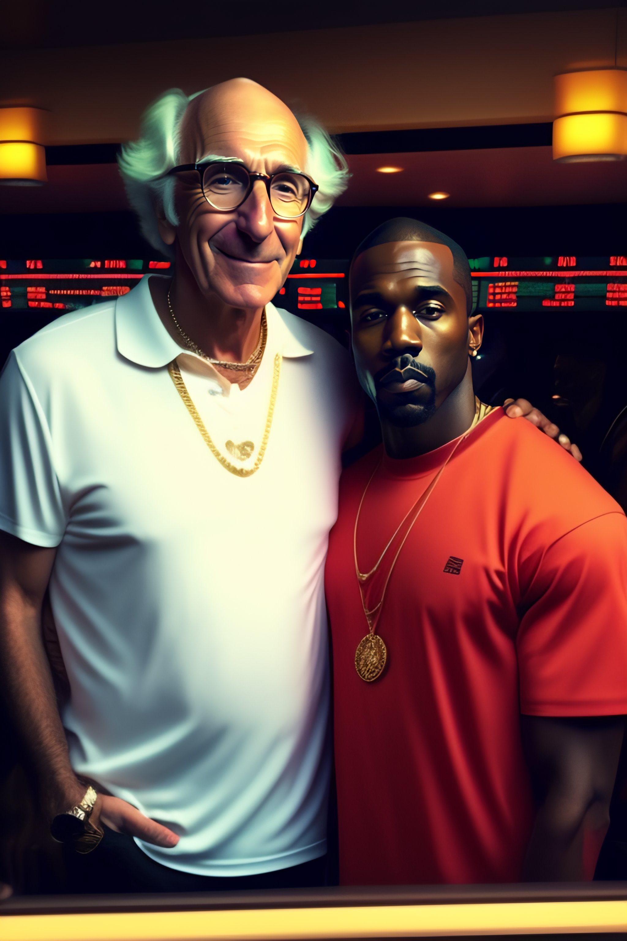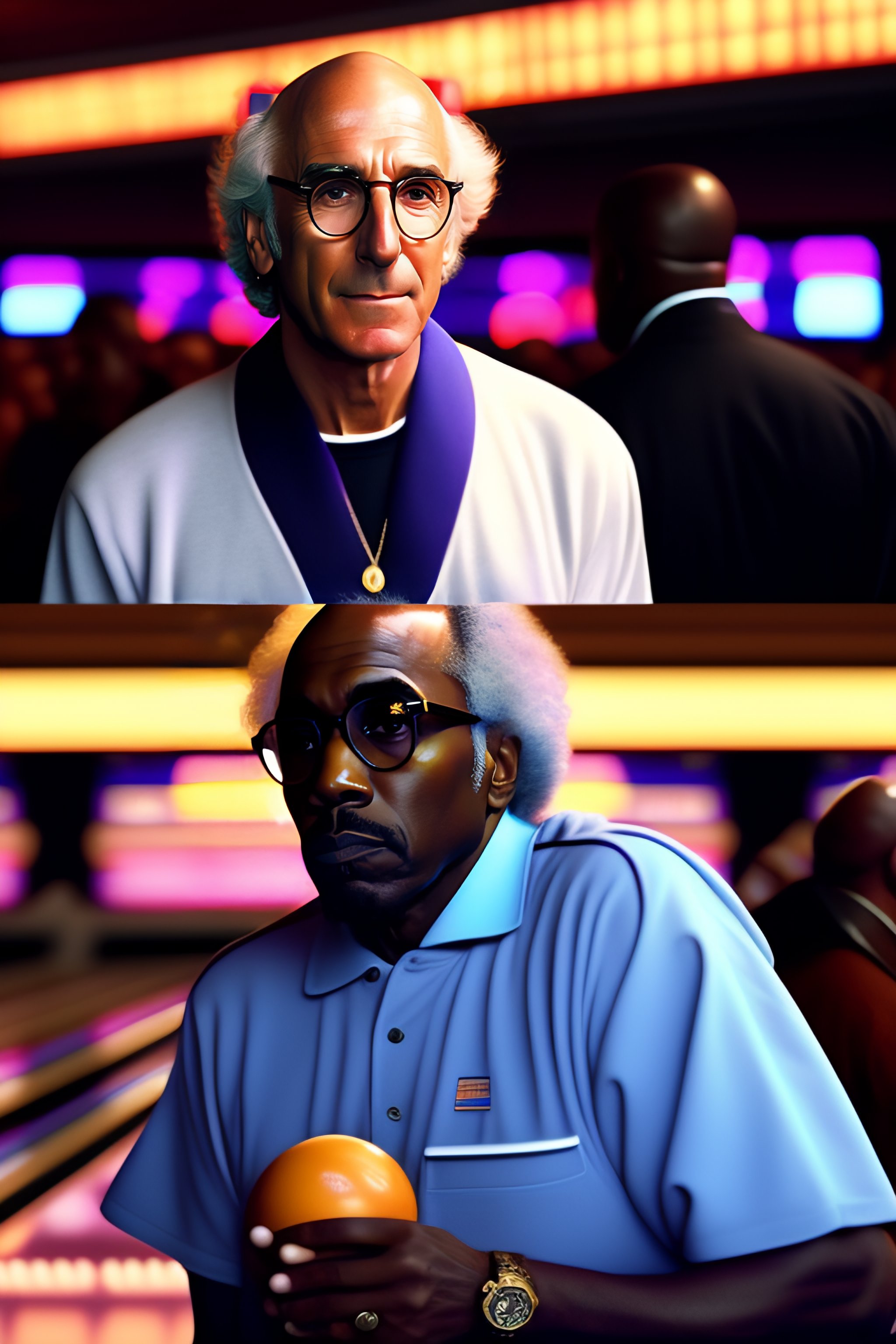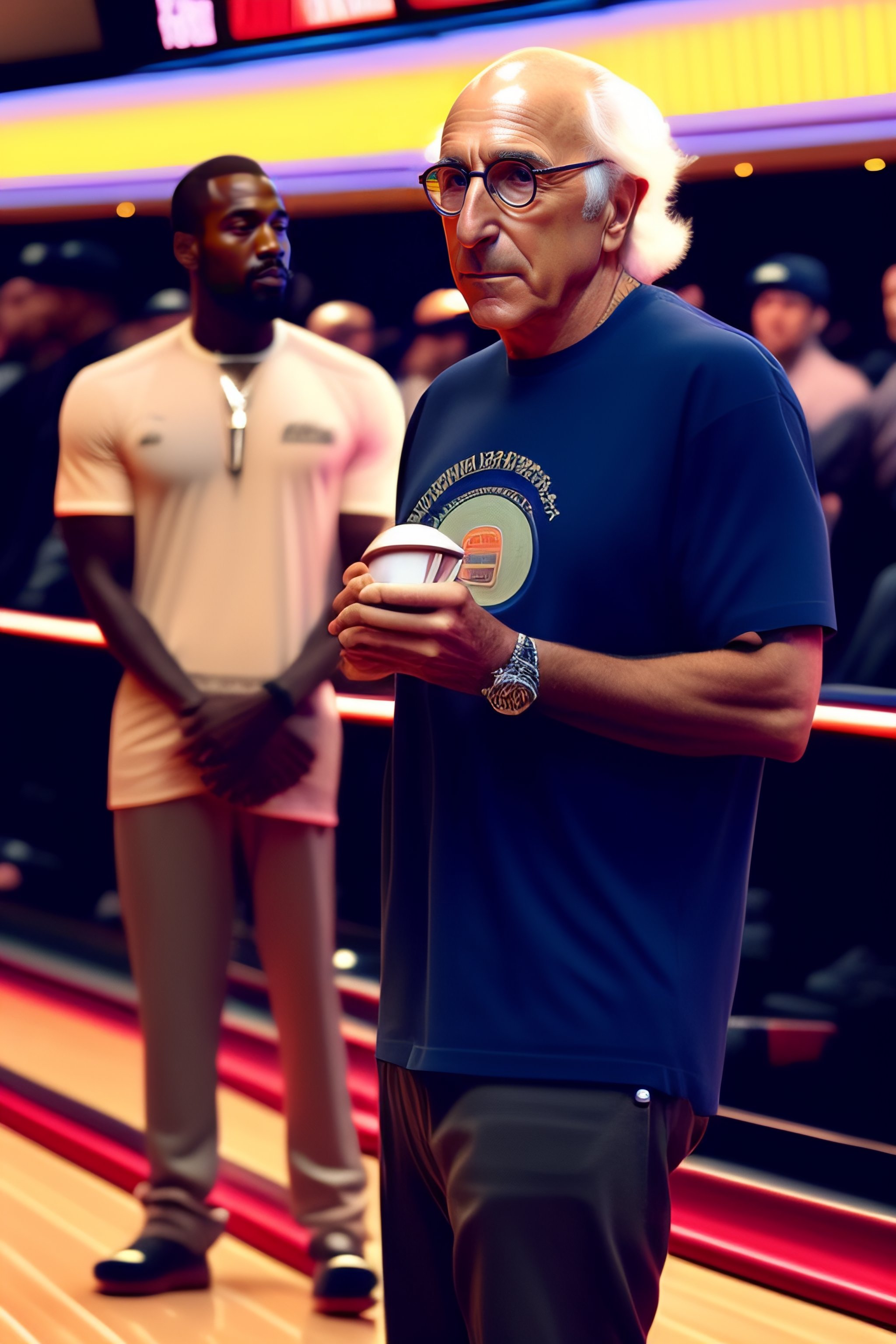 Larry david at a bowling alley with kanye west ]
